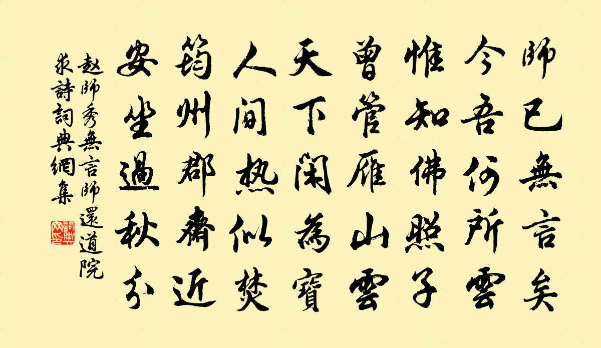 詩詞名句歷史字典書法欣賞書法字典國語詞典說文解字康熙字典古漢語字典標 題 作 者 詩 句 無言師還道院求詩作者:趙師秀 朝代:宋代無言師還道院求詩原文師已無言矣,今吾何所云。惟知佛照子,曾管雁山雲。天下閒為寶,人間熱似焚。筠州郡齋近,安坐過秋分。詩詞問答問:無言師還道院求詩的作者是誰?答:趙師秀問:無言師還道院求詩寫於哪個朝代?答:宋代趙師秀無言師還道院求詩書法欣賞無言師還道院求詩書法作品詩詞推薦落花郝經〔元代〕彩雲紅雨暗長門,翡翠枝余萼綠痕。桃李東風蝴蝶夢,關山明月杜鵑魂。玉闌煙冷空千樹,金谷香銷漫一尊。狼籍阮郎歸向滈〔宋代〕隔籬疏影照橫塘。東風吹暗香。隴頭歸路指蒼茫。江南春興長。扃小院,靜迴廊。有人憑短牆。角聲驚夢月橫窗。讀王伯大都承奏疏王邁〔宋代〕屢下絲綸喚不來,來時已作去安排。吾宗有此好兄弟,欲往從之天一涯。苔李鹹用〔唐代〕幾年風雨跡,疊在石孱顏。生處景長靜,看來情盡閒。吟亭侵壞壁,藥院掩空關。每憶東行徑,移筇獨自還。新婚別杜甫〔唐代〕兔絲附蓬麻,引蔓故不長。嫁女與征夫,不如棄路旁。結髮為君妻,席不暖君床。暮婚晨告別,無乃太匆忙。君行五更出舍郎王哲〔元代〕四更哩出舍郎。得清涼。重樓上,飲瓊漿。任舞任歌醒復醉,愈堪嘗。真滋味,萬般香。任老白居易〔唐代〕不愁陌上春光盡,亦任庭前日影斜。面黑眼昏頭雪白,老應無可更增加。建平縣道中項安世〔宋代〕糖甖花開官路香,客子欲歸官路長。稻田水足新秧黃,小麥吐秀南風涼。村村煮酒開官坊,家家禁忌障朁房。門前題黃山二首王挺之〔宋代〕疊巘障南國,攢峰頂半空。朝昏長見日,晴晦預知風。樹卉千年在,嵐光四面通。名山今日睹,奇秀兩無窮。次韻王司戶梅花五絕下得用古人意及比婦人玉王之望〔宋代〕溪外人家處處栽,三分蓓藿一分開。故教嫩萼參差發,似要幽人次第來。晦日陪辛大夫宴南亭劉長卿〔唐代〕月晦逢休浣,年光逐宴移。早鶯留客醉,春日為人遲。蓂草全無葉,梅花遍壓枝。政閒風景好,莫比峴山時。第一百八十八文天祥〔宋代〕茫然阮籍途,益嘆身世拙。零落蛟龍匣,開視化為血。新荔枝四絕范成大〔宋代〕趠泊飛來不作難,紅塵一騎笑長安。孫郎皺玉無訊息,先破潘郎玳瑁盤。誡子吟邵雍〔宋代〕至寶明珠非有纇,全珍良玉自無瑕。為珠為玉尚如此,何況為人多過差。吳門秋懷賀鑄〔宋代〕吳門客鬢再經秋,城郭籃舁久倦遊。平靜松江三萬頃,不應無處著魚舟。念奴嬌(賦白牡丹和范廓之韻)辛棄疾〔宋代〕對花何似,似吳宮初教,翠圍紅陣。欲笑還愁羞不語,惟有傾城嬌韻。翠蓋風流,牙籤名字,舊賞那堪省。天香染餞修史宮講吏部陳大著赴鎮贛州方逢辰〔宋代〕蠡湖擘破亨衢開,山川鍾作魁奇材。九關叫後入雲岫,六陰卷出登蓬萊。著庭萬卷了汗竹,粉闈胡事初先幞。非徒偈十二首釋文準〔宋代〕天道運行,節氣頻更。五日為候,十日為旬。三十日為月,十二月為年。一日一日,因循因循。五九盡,又逢春。禪人並化主寫真求贊釋正覺〔宋代〕默而非緘,辨而罔談。須菩提慧空了了,憍屍迦華雨毿毿。更與剎塵分手眼,何妨機用見鎚鉗。個人自得,古佛同送劉仲子就試方岳〔宋代〕竹雨梧風滿袖涼,踏槐仍逐眾人忙。一觴共滴蟾蜍露,並遣五千書傳香。名句推薦天下者、大具也,不可以小人有也,不可以小道得也,不可以小力持也。荀子《荀子·正論》 愛人利人者,天必福之;惡人賊人者,天必禍之。墨子《墨子·04章 法儀》 眼覷著災傷教我沒是處,只落得雪滿頭顱。張養浩《一枝花·詠喜雨》 矮紙斜行閒作草,晴窗細乳戲分茶。陸游《臨安春雨初霽》 春風江上路,不覺到君家高啟《尋胡隱君》 青海長雲暗雪山,孤城遙望玉門關。王昌齡《從軍行七首·其四》 對茲佳品酬佳節,桂拂清風菊帶霜。曹雪芹《螃蟹詠》 違山十里,蟪蛄之聲,猶在於佚名《孔子家語·子路初見》 婿為燕國王,身被詔獄加。李白《秦女休行》 野老念牧童,倚杖候荊扉。王維《渭川田家》