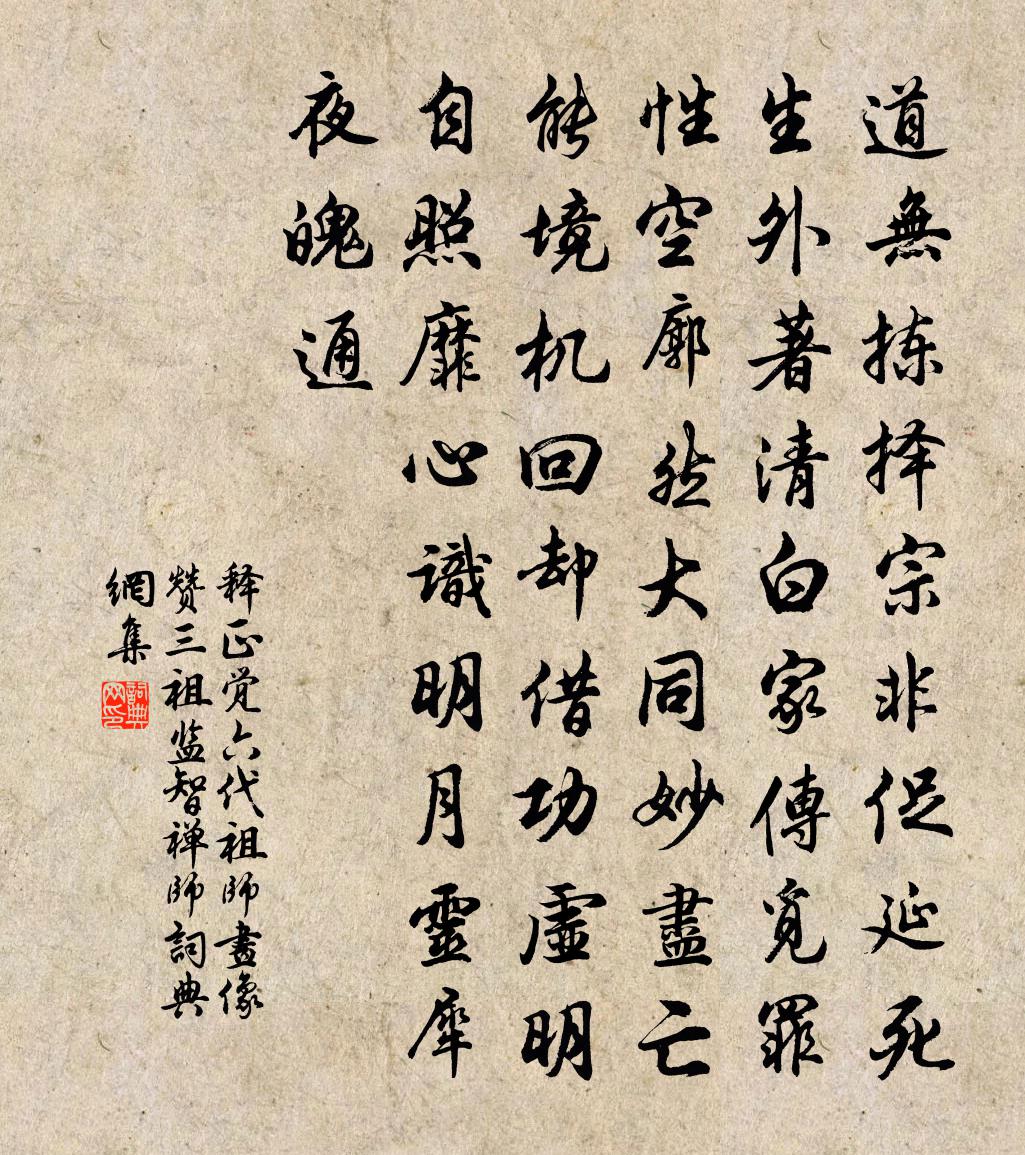 詩詞名句歷史字典書法欣賞書法字典國語詞典說文解字康熙字典古漢語字典標 題 作 者 詩 句 六代祖師畫像贊三祖監智禪師作者:釋正覺 朝代:宋代原文道無揀擇,宗非促延。死生外著,清白家傳。覓罪性空,廓然大同。妙盡亡能境,機回卻借功。虛明自照靡心識,明月靈犀夜魄通。詩詞問答問:《六代祖師畫像贊三祖監智禪師》的作者是誰?答:釋正覺問:該詩寫於哪個朝代?答:宋代書法欣賞六代祖師畫像贊三祖監智禪師書法作品詩詞推薦奉和隨王殿下詩 五謝朓〔南北朝〕桂樓飛絕限。超遠向江歧。輕雲霽廣甸。微風散清漪。連連絕鷹舉。渺渺青煙移。嚴城亂芸草。霜塘凋素枝。氣爽題李子權江月亭曾豐〔宋代〕太陰元是水之精,與水相宜妙莫名。霽夜懸芒翻浪白,澄秋逗彩涌流清。冰輪影里山河見,玉鑒光中星斗明。萬象病臥一春無復少況蹈元顧為尋山之行以詩簡之李彌遜〔宋代〕病與老期推復來,十分春事苦相催。干戈四海少閒地,寒暑一生能幾回。止酒尊罍成說食,空華風景亂真梅。晴明天竺中夜釋文珦〔宋代〕白露變氣候,促織階下鳴。切切鳴不已,倦客心自驚。中夜攬衣起,星疏鬆月明。念彼同懷人,迢迢隔山城。此身百丈漈方翥〔宋代〕斷崖日夕自撞舂,未近先看氣象雄。萬壑不停雷隱隱,一川長覺雨濛濛。臨江仙 誡釋道相辯王丹桂〔元代〕禪道本來無辯證,皆因古聖強名。不須方外謾勞形。人人俱有分,個個總圓成。但把萬緣齊放下,切須戒斷無明。次韻秋日五首姜特立〔宋代〕四山秋色冷銀床,燕坐高齋興味長。何物與公堪比德,寒花晚節最馨香。念奴嬌黃人傑〔宋代〕菊黃萸紫,近重陽、天氣秋光如洗。懷燕占熊,還又應、崧岳生申時節。玉女擎香,金仙持送,錦里歡聲徹。照人亂後入洪州西山曹松〔唐代〕寂寂陰溪水漱苔,塵中將得苦吟來。東峰道士如相問,縣令而今不姓梅。清涼山贊佛寺 (四首選一)吳偉業〔清代〕西北有高山,雲是文殊台。台上明月池,千葉金蓮開。花花相映發,葉葉同根栽。王母攜雙成,綠蓋雲中來。結以送僧釋如淨〔宋代〕生逼猢猻坐鐵砧,一槌天地盡崩沈。橫來豎去呵呵笑,喫飯噇眠邁古今。水調歌頭 江浙貢院吳存〔元代〕尺一九霄下,華發起江湖。西風吹我衣袂,八月過三吳。十五西湖月色,十八海門潮勢,此景世間無。收入硯蜍滴遇靈陽子談道贈以詩文天祥〔宋代〕昔我愛泉石,長揖離公卿。結屋青山下,咫尺蓬與瀛。至人不可見,世塵忽相纓。業風吹浩劫,蝸角爭浮名。偶逢行香子(次草窗憶古心公韻)劉辰翁〔宋代〕玉立風塵。光動黃銀。便談文、也到夜分。無人燭下,壁上傳神。記老婆心,寒士語,道人身。極意形容,下語難句王鎡〔宋代〕林間望斷松梢路,白鶴真人尚未還。起潛觀心四絕詞旨俱勝仍用非字奉酬以盡愚衷錢時〔宋代〕霧靄溟濛山縹緲,江波浩蕩雨霏微。頭頭總是吾家事,更要回歸定失歸。庚子冬夜宿郡館懷白從古章綸〔宋代〕高館天寒霜露濃,思君深隱翠微重。月華繞樹無飛鵲,雲飛蟠泥有蟄龍。石鼎賦詩猶脫略,銀燈看劍每從容。孤懷承聞河北諸道節度入朝歡喜口號絕句十二首杜甫〔唐代〕祿山作逆降天誅,更有思明亦已無。洶洶人寰猶不定,時時鬥戰欲何須。社稷蒼生計必安,蠻夷 * 錯相干。周宣自和葉茵〔宋代〕壯士須張燕角弧,男兒須誦聖人書。譬如田叟祈多稼,未有春時不荷鋤。分內功名從早晚,腹中學問怕空疏。老夫游梅山寺楊侃〔宋代〕出郭塵路斷,登舟鷲嶺通。樓台花嶼上,鍾梵水天中。石磴班春蘚,松門韻晚風。蒪絲惹輕楫,雲錦散遙空。竹逕名句推薦秋氣堪悲未必然,輕寒正是可人天。楊萬里《秋涼晚步》 尚想舊情憐婢僕,也曾因夢送錢財。元稹《遣悲懷三首·其二》 回樂烽前沙似雪,受降城外月如霜。李益《夜上受降城聞笛》 連天衰草,望斷歸來路。李清照《點絳唇·閨思》 何夜無月?何處無竹柏?但少閒人如吾兩人者耳。蘇軾《記承天寺夜遊 / 記承天夜遊》 八月寒葦花,秋江浪頭白。李頎《送劉昱》 闌乾倚遍重來憑。淚粉偷將紅袖印。歐陽修《玉樓春·去時梅萼初凝粉》 秋寂寞,秋風夜雨傷離索孫道絢《憶秦娥·季溫老友歸樵陽人來閒書因以為寄》 目斷秋霄落雁,醉來時響空弦。辛棄疾《木蘭花慢·滁州送范倅》 湖清霜鏡曉,濤白雪山來。李白《送友人尋越中山水》
