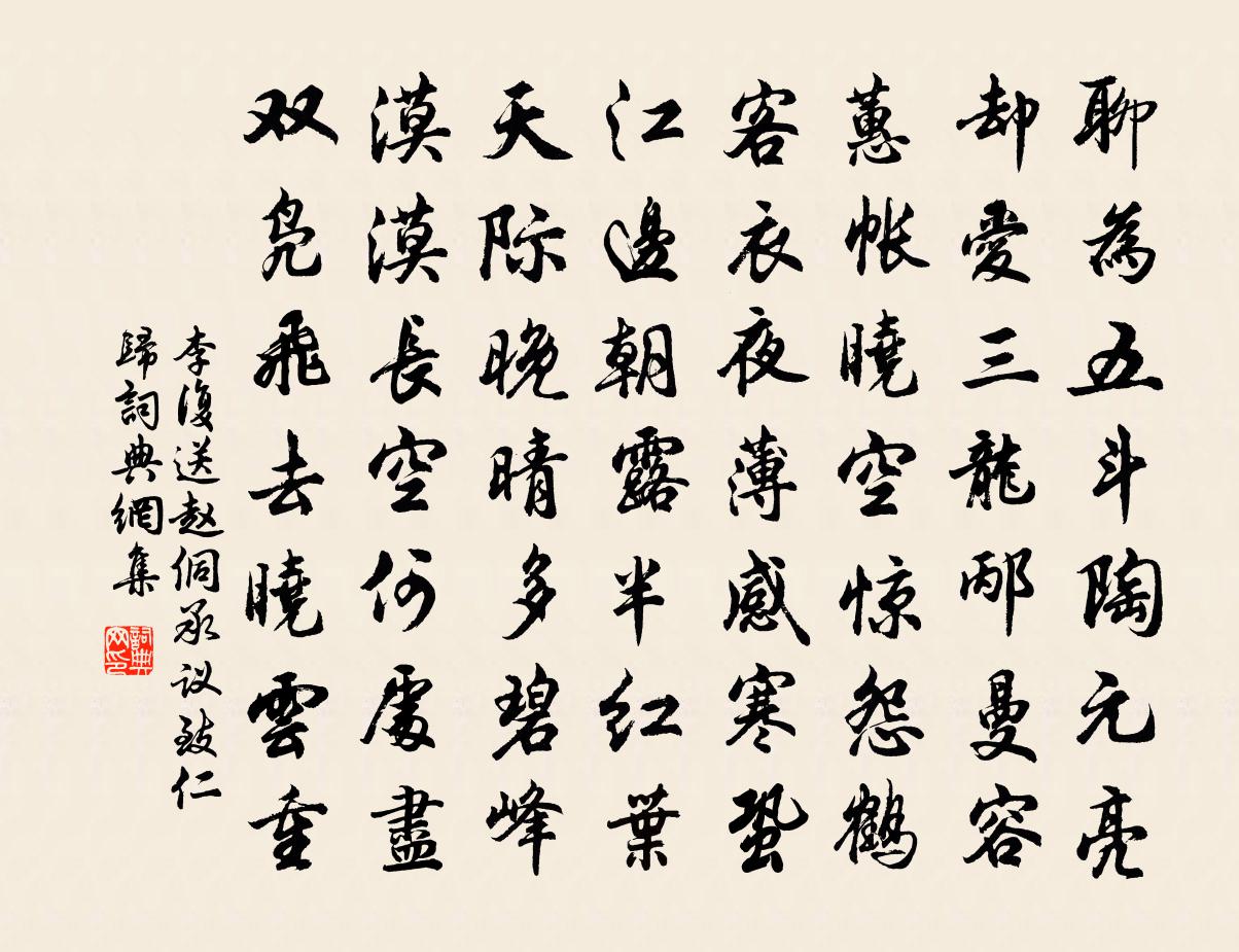 詩詞名句歷史字典書法欣賞書法字典國語詞典說文解字康熙字典古漢語字典標 題 作 者 詩 句 送趙侗承議致仁歸作者:李復 朝代:宋代送趙侗承議致仁歸原文聊為五斗陶元亮,卻愛三龍邴曼容。蕙帳曉空驚怨鶴,客衣夜薄感寒蛩。江邊朝露半紅葉,天際晚晴多碧峰。漠漠長空何處盡,雙鳧飛去曉雲重。詩詞問答問:送趙侗承議致仁歸的作者是誰?答:李復問:送趙侗承議致仁歸寫於哪個朝代?答:宋代李復送趙侗承議致仁歸書法欣賞送趙侗承議致仁歸書法作品詩詞推薦仰山行趙汝鐩〔宋代〕平生幾兩謝公屐,愛山愛水真成癖。集雲峰在指顧間,年來抗塵乃絕跡。西風從臾作意登,佛境未入心境清。九秋餘杭久旱趙悅道入境之夕四郊雨足二首曾鞏〔宋代〕旌旗東下路塵開,六月風雲席上回。正恐一方人暍死,直將霖雨過江來。燭影搖紅長筌子〔元代〕菊綻黃花,月生碧漢清光皎。霜前雨後正芬芳,四海圓明照。朵朵爭開爛熳,吐香風、騰輝天表。檻邊幽雅,空外游雲頂山晚望貫休〔唐代〕雲頂聊一望,山靈草木奇。黔南在何處,堪笑復堪悲。菊歇香未歇,露繁蟬不飢。明朝又西去,錦水與峨眉。遊仙詩嵇康〔兩漢〕翩翩鳳翮。逢此網羅。漁家傲 西方樂梵琦〔元代〕聽說西方無量樂。三賢十聖同依託。稽首彌陀圓滿覺。長參學。川流赴海塵成岳。佛性在躬如玉璞。須憑巧匠勤雕禽言十詠提葫蘆沽美酒姚勉〔宋代〕晴煙如潑春光濃,萬花笑日爭嫣紅。百金沽酒直取醉,有酒不醉孤東風。不如遂我豐年願,秫米價如黃土賤。家家晚渡周權〔元代〕離離野樹綠生煙,灼灼山花爛欲然。酤酒人歸春渡寂,柳根閒系夕陽船。與蘇運使詡四首趙蕃〔宋代〕筠陽有賢牧,典選得望郎。漢廷急獻納,使節乃輝光。翰墨一門盛,人才當代良。平生願識面,今日獲升堂。東武吟曹鄴〔唐代〕心如山上虎,身若倉中鼠。惆悵倚市門,無人與之語。夜宴李將軍,欲望心相許。何曾聽我言,貪謔邯鄲女。獨上忽見早梅張嵲〔宋代〕積雪凝閩嶺,凌風識暗香。疏花經雨瘦,臥影入溪長。萬里難為贈,九回空繞腸。綠原聊駐屐,試待月荒涼。美廣帥趙平齋拓貢院李昴英〔宋代〕闈棘千間手拓開,帥幢元是箇中來。前峰卓卓尖如筆,正路堂堂穩踏槐。自此鵠袍容萬士,渾然龍化出倫魁。南州雨夜王銍〔宋代〕去國襟懷離別情,夜眠雨驛嘆孤征。轉頭三十年前恨,猶聽當時枕上聲。記媓汪炎昶〔宋代〕鎧疫不方息,飛媓又作群。攪空吹密雪,障日度輕雲。瀕死欣中脫,偷生駭乍聞。分官嚴捕瘵,吏卒日紛紛。次韻仁近訝約予不至方回〔宋代〕風塵矯虔稱寡孤,疲甿暴骨紛痕瘏。驟得如願宮亭湖,鬼妾色悲充爾娛。老夫旅庖慳薪蔬,爨仆揶揄朝連晡。疇昔酬楊比部員外暮宿琴堂朝躋書閣率爾見贈之作(作王維)盧照鄰〔唐代〕閒拂檐塵看,鳴琴候月彈。桃源迷漢姓,松徑有秦官。空谷歸人少,青山背日寒。羨君棲隱處,遙望白雲端。偈頌四十二首釋祖先〔宋代〕達磨西來事,今人謾度量。天河爭起浪,月桂不聞香。達磨西來事,今人謾度量。人貧智短,馬瘦毛長。天氣或晴王霸仙壇磚刻佚名〔唐代〕樹枯不用伐,壇壞不須結。未滿一千歲,自有系孫列。後來是三皇,潮水盪禍殃。岩逢二乍間,未免有消亡。子孫武陵春 京兆趙公勸酒不飲王哲〔元代〕處林泉別有酒,卯按篇章。二層樓飲玉漿。里火生光。兀陶陶頻醉醒,夜最堪嘗。味來迴轉轉昌。出*蓬莊。春日書事五首韓元吉〔宋代〕溪邊亂石蛟鼉臥,煙里千花錦繡園。記得年時作寒食,山橋吹備雨中歸。名句推薦醉月頻中聖,迷花不事君李白《贈孟浩然》 俯視洛陽川,茫茫走胡兵。李白《古風·其十九》 棄捐勿復道,努力加餐飯。佚名《行行重行行》 昨日春如,十三女兒學繡。辛棄疾《粉蝶兒·和趙晉臣敷文賦落花》 從時者,猶救火、追亡人也,蹶而趨之,唯恐弗及。左丘明《國語·越語·越興師伐吳而弗與戰》 招魂楚些何嗟及,山鬼暗啼風雨。元好問《摸魚兒·雁丘詞 / 邁陂塘》 桃花春水淥,水上鴛鴦浴。韋莊《菩薩蠻》 信,國之寶也,民之所庇也左丘明《左傳·僖公·僖公二十五年》 流星透疏木,走月逆行雲。賈島《宿山寺》 雪紛紛,掩重門,不由人不斷魂,瘦損江梅韻。關漢卿《大德歌·冬》