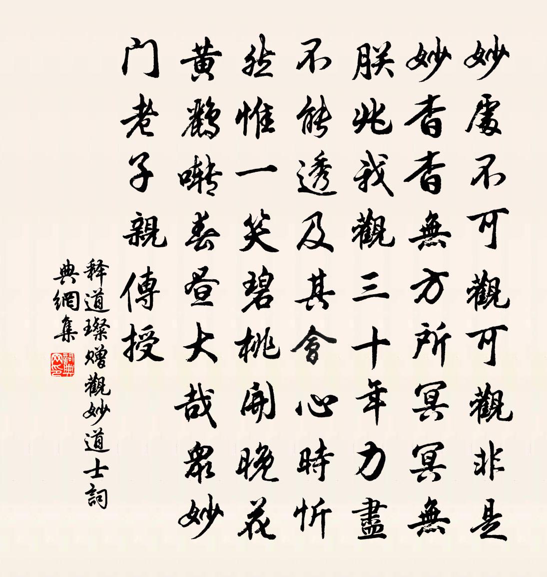 詩詞名句歷史字典書法欣賞書法字典國語詞典說文解字康熙字典古漢語字典標 題 作 者 詩 句 贈觀妙道士作者:釋道璨 朝代:宋代贈觀妙道士原文妙處不可觀,可觀非是妙。杳杳無方所,冥冥無朕兆。我觀三十年,力盡不能透。及其會心時,忻然惟一笑。碧桃開晚花,黃鸝囀春晝。大哉眾妙門,老子親傳授。詩詞問答問:贈觀妙道士的作者是誰?答:釋道璨問:贈觀妙道士寫於哪個朝代?答:宋代釋道璨贈觀妙道士書法欣賞贈觀妙道士書法作品詩詞推薦絕句瀟湘漁父〔宋代〕高枕形骸外,空江何限情。落葉不成調,半夜起秋聲。好事近(十二之六)陸游〔宋代〕揮袖別人間,飛躡峭崖蒼壁。尋見古仙丹灶,有白雲成積。心如潭水靜無風,一坐數千息。夜半忽驚奇事,看鯨波次韻斯遠二十六日三絕趙蕃〔宋代〕傭販人人有闔廬,借居如我絕無娛。書無厚祿庸何嘆,賴爾詩能數起予。行春辭九首白玉蟾〔宋代〕綠楊無力暖相依,不管黃鶯訴落暉。水被魚吹成雨點,花為蝶擾逐風飛。簡徐季益二首趙蕃〔宋代〕野寺鐘鳴後,溪橋雨合時。杖藜能過我,酌酒更論詩。意作匆匆別,仍愆得得期。近知疎問訊,不那費懷思。漁父詞二首鄧深〔宋代〕西風淅淅颭菰蒲,獨棹扁舟釣五湖。買斷水鄉真樂處,月明雲冷笛聲孤。太常引姬翼〔元代〕非僧非俗不求仙。茅屋兩三椽。白石與清泉。更誰問、桃源洞天。一爐香火,一甌春雪,澆灌淨三田。閒想穀神篇沁園春·丁酉歲感事陳人傑〔宋代〕誰使神州,百年陸沉,青氈未還?悵晨星殘月,北州豪傑;西風斜日,東帝江山。劉表坐談,深源輕進,機會失之偈頌六十首釋曇華〔宋代〕心佛及眾生,笑而還復喜。笑喜本無根,緇素誠有旨。千古萬古人,幾個識道理。道理深,何處尋。海枯終見底,鴛鴦湖棹歌 之十五朱彝尊〔清代〕鴨餛飩小漉微鹽,雪後壚頭酒價廉。聽說河豚新入市,蔞蒿荻筍急須拈。病中戲書陸游〔宋代〕五十忽過二,流年消壯心。避人便小疾,移竹喜微陰。洗瓮閒篘酒,焚香靜斫琴。鏡中青鬢在,切莫遣愁侵。過秦樓利登〔宋代〕眉黛山分,索取靨合,鬱郁夜堂初見。芙蓉寄隱,豆蔻傳香,便許翠鬟偷剪。迎夜易羞,欲晨先怯,風流楚楚未慣次韻靖州貢士鹿鳴宴二首魏了翁〔宋代〕何處何時不產賢,黔中故地夜郎天。雖雲地脈元無閒,欲破天荒未有先。萬蟻場中春鎖棘,九賓庭下曉鳴鞭。便將隰州新驛韓偓〔唐代〕盛德已圖形,胡為忽構兵。燎原雖自及,誅亂不無名。擲鼠須防誤,連雞莫憚驚。本期將系虜,末策但嬰城。肘腋臨高台文同〔宋代〕臨高台,望故鄉。地千里,天一方。極目外,空茫茫。孤雲飛,不我將。安得羽翼西南翔。偈二十二首釋洵〔宋代〕有佛處,不得住,藕絲孔里行官路。無佛處,急走過,十字街頭相對坐。冬宵家會餞李郎司兵赴同州岑參〔唐代〕急管雜青絲,玉瓶金屈卮。寒天高堂夜,撲地飛雪時。賀君關西掾,新綬腰下垂。白面皇家郎,逸翮青雲姿。明旦九日渡江李東陽〔明代〕秋風江口聽鳴榔,遠客歸心正渺茫。萬里乾坤此江水,百年風日幾重陽。煙中樹色浮瓜步,城上山形繞建康。直過留題座主和凝舊閣李瀚〔唐代〕座主登庸歸鳳闕,門生批詔立鰲頭。玉堂舊閣多珍玩,可作西齋潤筆不。題庵壁陸游〔宋代〕萬里東歸白髮翁,閉門不復與人通。綠樽浮蟻狂猶在,黃紙棲鴉夢已空。薄技徒勞真刻楮,浮生隨處是飛蓬。湖邊名句推薦居身務期質樸,教子要有義方。朱柏廬《朱子家訓·全文》 迎醉面,暮雪飛花,幾點黛愁山暝。吳文英《十二郎·垂虹橋》 居必擇鄉,游必就士。荀子《荀子·勸學》 浮雲不共此山齊,山靄蒼蒼望轉迷韓翃《宿石邑山中》 江送巴南水,山橫塞北雲王勃《江亭夜月送別二首》 舉大事必有所資李大師、李延壽《南史·列傳·卷五十三》 戰戰慄栗,日慎一日,苟慎其道,天下可有。韓非及後人《韓非子·初見秦》 一春不識西湖面。翠羞紅倦。許棐《後庭花·一春不識西湖面》 日高煙斂,更看今日晴未。李清照《念奴嬌·春情》 同心而離居,憂傷以終老。佚名《涉江采芙蓉》