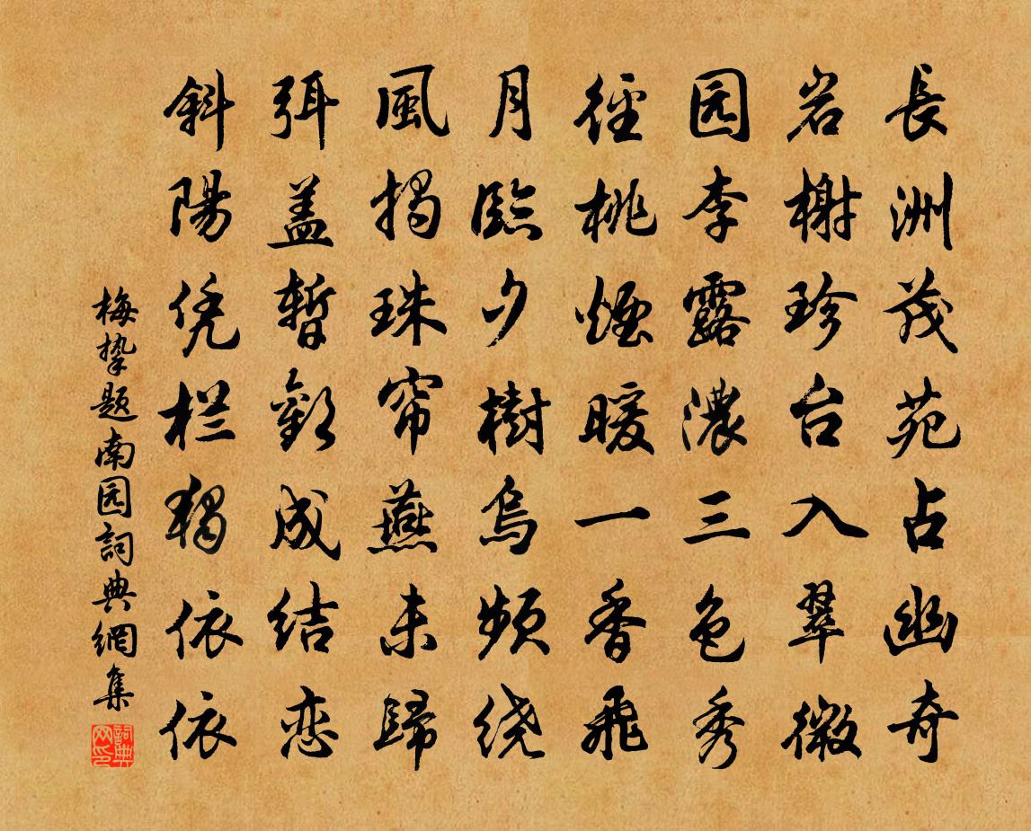 詩詞名句歷史字典書法欣賞書法字典國語詞典說文解字康熙字典古漢語字典標 題 作 者 詩 句 題南園作者:梅摯 朝代:宋代題南園原文長洲茂苑占幽奇,岩榭珍台入翠微。園李露濃三色秀,徑桃煙暖一香飛。月臨夕樹烏頻繞,風揭珠簾燕未歸。弭蓋暫歡成結戀,斜陽憑欄獨依依。詩詞問答問:題南園的作者是誰?答:梅摯問:題南園寫於哪個朝代?答:宋代梅摯題南園書法欣賞題南園書法作品詩詞推薦調笑歌/調笑令黃庭堅〔宋代〕無語。恨如許。方士歸時腸斷處。梨花一枝春帶雨。半鈿分釵親付。天長地久相思苦。渺渺鯨波無路。京口陸龜蒙〔唐代〕江乾古渡傷離情,斷山零落春潮平。東風料峭客帆遠,落葉夕陽天際明。戰舸昔浮千騎去,釣舟今載一翁輕。可憐壬宣立春張鎡〔宋代〕蓼醯蔬餅媚晨羞,一飽寧知老到頭。但聽兒童語聲喜,黑頭青角看泥牛。爛柯山四首。石室二禪師劉迥〔唐代〕繩床宴坐久,石窟絕行跡。能在人代中,遂將人代隔。白雲風颺飛,非欲待歸客。齋中雜興十首以丈夫貴壯健慘戚非朱顏為韻陸游〔宋代〕去國己酉冬,忽見十頒歷。衰殘口兩齒,困厄家四壁。時看溪雲生,飽聽檐雨滴。悠然度寒暑,何處著欣戚?幽人三山亭陶弼〔宋代〕紅螺蟹新鱸鱠,白藕黃柑晚荔枝。酒盡月斜潮半落,山翁不省上船時。秋晚雜書三十首方回〔宋代〕六經天日月,諸子如四詩。史自班以上,語奇文亦奇。踵武蔚宗輩,語有文無之。小宋刊新唐,不悟宵寐規。以藝挽李卿儔老二首劉克莊〔宋代〕人物今衰少,惟侯智勇兼。悲風起關塞,斜日薄嵫崦。老子無從涕,諸賢不及髯。知心惟蜀李,應為發幽潛。望江南·江上雪李綱〔宋代〕江上雪,獨立釣漁翁。箬笠但聞冰散響,蓑衣時振玉花空。圖畫若為工。雲水暮,歸去遠煙中。茅舍竹籬依小嶼,門外黎道華〔宋代〕門外黃塵尺放深,痴兒抵死競浮沈。誰知一寸茅檐日,天付閒人值萬金。觀化十五首黃庭堅〔宋代〕風煙漠漠半陰晴,人道春歸不見形。嫩草已侵水面綠,平蕪還破燒痕青。龍洞閣程公許〔宋代〕崢嶸罅石蛟潭必,逼仄懸崖閣棧危。橫目不虞又足蠶,子長心事未忘奇。和楊提刑喜雨陽枋〔宋代〕螻蟻何能格上穹,況於三伏蘊隆中。瓣香載走神龍廟,法象俱來大梵宮。出岫金身能普濟,臨池玉醮可幽通。尚憑方岩釋心月〔宋代〕烏雲屯了白雲屯,雲斂稜層四面分。平實嶮巘都坐斷,且無花雨落紛紛。和程泰之閣學春雪韻袁說友〔宋代〕妒臘三呈白,欺春六出花。玉層渾欲墮,珠霰一何奢。巧態穿庭樹,余寒戀釣槎。積難殊未密,散易已成賒。有客出山作盧仝〔唐代〕出山忘掩山門路,釣竿插在枯桑樹。當時只有鳥窺窬,更亦無人得知處。家僮若失釣魚竿,定是猿猴把將去。代羅大著遙題雲巢陳造〔宋代〕高人玩世心,仕學有餘裕。稍償俗間負,未忘塵外趣。結巢依莽蒼,泉石得佳處。牙籤三萬軸,遮眼豈雲蠹。鳥哢游普向十首陳造〔宋代〕西湖西岸三百寺,一一題名嗟未能。他日誅茅追勝賞,卻尋詩版驗吾曾。南溪別業岑參〔唐代〕結宇依青嶂,開軒對翠疇。樹交花雨色,溪合水重流。竹徑春來掃,蘭樽夜不收。逍遙自得意,鼓腹醉中游。儒釋劉克莊〔宋代〕鵝湖始若小異,虎溪豈必皆同。平亭晦庵子靜,揑合淵明遠公。名句推薦花意爭春,先出歲寒枝。辛棄疾《江神子·賦梅寄余叔良》 多欲則貪,尚私則枉,其罪遂生。來俊臣《羅織經·閱人卷第一》 歲暮百草零,疾風高岡裂。杜甫《自京赴奉先縣詠懷五百字 / 自京赴奉先詠懷五百字》 見善而怠,時至而疑,知非而處,此三者,道之所止也。姜子牙《六韜·文韜·明傳》 荊江日落陣雲低,橫戈躍馬今何時。納蘭性德《送蓀友》 不覺碧山暮,秋雲暗幾重。李白《聽蜀僧濬彈琴 / 聽蜀僧浚彈琴》 對此懷素心,千里共明月德隱《新秋晚眺》 非意相干,可以理遣。房玄齡《晉書·列傳·第六章》 何事非相思,江上葳蕤竹。吳均《登二妃廟》 百星之明不如一月之光,十牖之開,不如一戶之明。劉安及其門客《淮南子·說林訓》