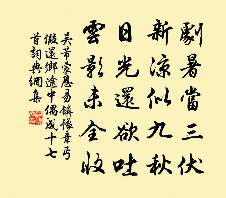 詩詞名句歷史字典書法欣賞書法字典國語詞典說文解字康熙字典古漢語字典標 題 作 者 詩 句 蒙恩易鎮豫章丐假還鄉途中偶成十七首作者:吳芾 朝代:宋代原文劇暑當三伏,新涼似九秋。日光還欲吐,雲影未全收。詩詞問答問:《蒙恩易鎮豫章丐假還鄉途中偶成十七首》的作者是誰?答:吳芾問:該詩寫於哪個朝代?答:宋代書法欣賞蒙恩易鎮豫章丐假還鄉途中偶成十七首書法作品詩詞推薦暮春林壑圖唐寅〔明代〕逶迤十里平溪路,滴瀝三重下漱泉。為底時來策黎杖,春衣要試浴沂天。寄韶石長老求柏栽余靖〔宋代〕森然桃李陰,當春皆手植。更求青青枝,要見歲寒色。閒立羅與之〔宋代〕晚來閒立小溪邊,看徹遙峰入紫煙。四壁盡堪供我隱,一寒未至乞人憐。功名不與樽前事,時序寧知局上遷。可笑聽航船歌十首方回〔宋代〕雇載錢輕載不輕,阿郎拽牽阿奴撐。五千斤蠟三千漆,寧馨時年欲夜行。定風波蘇軾〔宋代〕月滿苕溪照夜堂。五星一老斗光芒。十五年間真夢裡。何事。長庚對月獨淒涼。綠鬢蒼顏同一醉。還是。六人吟笑題雪竇禪師壁(一作贈雪竇峰禪師)方乾〔唐代〕飛泉濺禪石,瓶注亦生苔。海上山不淺,天邊人自來。長年隨檜柏,獨夜任風雷。獵者聞疏磬,知師入定回。銀結條冠子徐夤〔唐代〕日下征良匠,宮中贈阿嬌。瑞蓮開二孕,瓊縷織千條。蟬翼輕輕結,花紋細細挑。舞時紅袖舉,纖影透龍綃。新秋雜題六首坐陸龜蒙〔唐代〕偶避蟬聲來隙地,忽隨鴻影入遼天。閒僧不會寂寥意,道學西方人坐禪。過逸人居釋文珦〔宋代〕尚此高閒久,空林舊徑存。掩關防俗駕,登閣俯鄰園。植竹驚初筍,移花過別根。幽懷在自得,勿易與人言。游武夷作棹歌呈晦翁十首辛棄疾〔宋代〕山上風吹笙鶴聲,山前人望翠雲屏。蓬萊枉覓瑤池路,不道人間有幔亭。禪人並化主寫真求贊釋正覺〔宋代〕孤節老全,叢林歲寒。機用千變,時事百難。玉經火而愈潤,蓮秀水而常乾。牛頭之懶口掛壁,麈尾之辯舌翻瀾。雨中招吳子野先生蘇轍〔宋代〕柴門不出蓬生徑,暑雨無時水及堂。辟穀賴君能作客,暫來煎蜜餉桃康。雜曲歌辭。戰勝樂佚名〔唐代〕百戰得功名,天兵意氣生。三邊永不戰,此是我皇英。後一日因展省歸途口占陳文蔚〔宋代〕春光休道屬誰家,造化平鋪無等差。不問世間凡草木,得春隨意總皆花。雪中通判家飲回梅堯臣〔宋代〕朔風聲滿枯桑枝,陰雲不定蛟龍歸。凍禽聚立高樹時,密雲萬里增寒威。訪君留連舉酒卮,胡琴奏罷歡已微。小駒雷陽書事秦觀〔宋代〕駱越風俗殊,有疾皆勿藥。束帶趨祀房,用史巫紛若。弦歌薦繭栗,奴士洽觴酌。呻吟殊未央,更把雞骨灼。又登碧雲亭感懷三十首吳芾〔宋代〕晚上危亭想謫仙,孤墳寂寂鎖寒煙。高風直節誰能繼,只有詩篇後代傳。雉丁謂〔宋代〕雉操揚琴奏,名翬拂扇塵。其文伊洛地,厥貢越裳人。幾為郎官集,還因今邑馴。山樑時飲啄,媒翳莫朝親。寄江南鶴林寺石冰上人顧況〔唐代〕山川重複出,心地暗相逢。忽憶秋江月,如聞古寺鐘。湖平南北岸,雲抱兩三峰。定力超香象,真言攝毒龍。風中過岳冠山二首李彌遜〔宋代〕岳冠山下月黃昏,石立波蠶勢莫分。回首風前魂欲斷,東西南北水邊雲。名句推薦日長睡起無情思,閒看兒童捉柳花。楊萬里《閒居初夏午睡起》 故鄉歸去千里,佳處輒遲留。蘇軾《水調歌頭·安石在東海》 百川東到海,何時復西歸?佚名《長歌行》 淮水東邊舊時月,夜深還過女牆來。劉禹錫《金陵五題·石頭城》 忽見陌頭楊柳色,悔教夫婿覓封侯。王昌齡《閨怨》 相思只在,丁香枝上,豆蔻梢頭。王雱《眼兒媚·楊柳絲絲弄輕柔》 故國傷心,新亭淚眼,更灑瀟瀟雨。王瀾《念奴嬌·避地溢江書於新亭》 枯枝無醜葉,涸水吐清泉李白《長歌行》 乃知兵者是兇器,聖人不得已而用之。李白《戰城南》 行有不得者,皆反求諸己,其身正而天下歸之。孟子《孟子·離婁章句上·第四節》