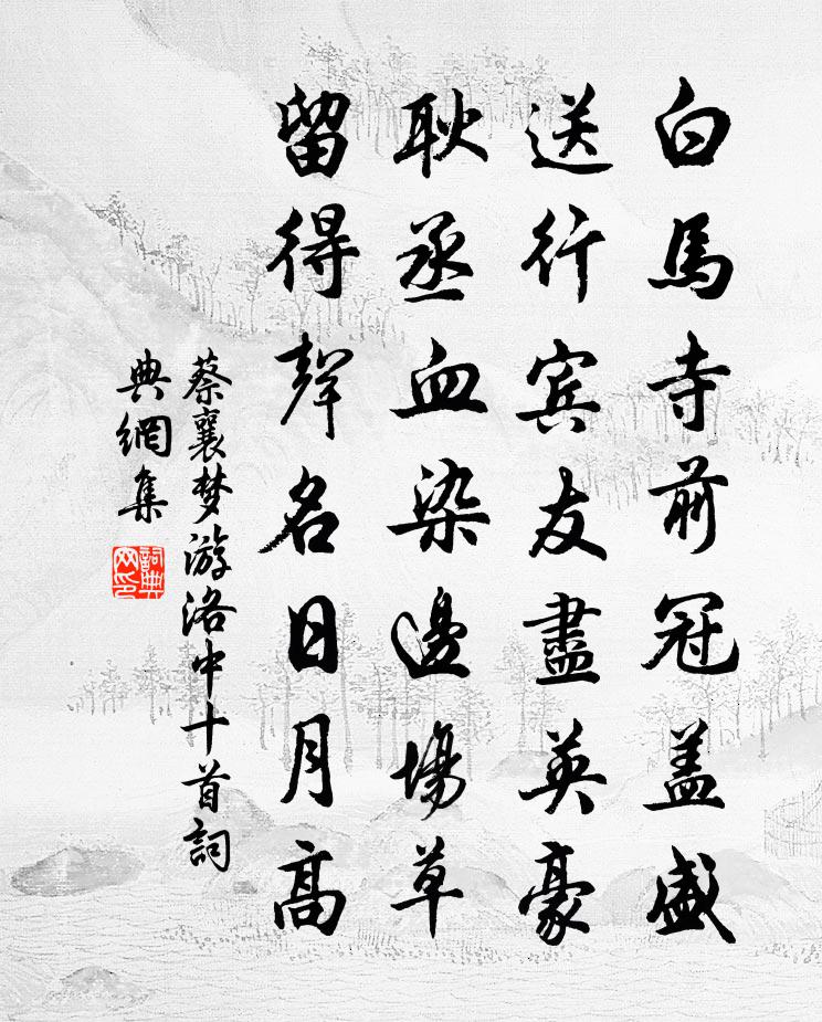 詩詞名句歷史字典書法欣賞書法字典國語詞典說文解字康熙字典古漢語字典標 題 作 者 詩 句 夢遊洛中十首作者:蔡襄 朝代:宋代夢遊洛中十首原文白馬寺前冠蓋盛,送行賓友盡英豪。耿丞血染邊場草,留得聲名日月高。詩詞問答問:夢遊洛中十首的作者是誰?答:蔡襄問:夢遊洛中十首寫於哪個朝代?答:宋代問:夢遊洛中十首是什麼體裁?答:七絕蔡襄夢遊洛中十首書法欣賞夢遊洛中十首書法作品詩詞推薦過嚴灘登子陵釣台釋文珦〔宋代〕幽人山水心,獨向新安去,應為一絲風,元非釣名具。浪高灘七里,片石還如故。蝶戀花(春夜不寐)毛滂〔宋代〕紅影斑斑吹錦片。露葉煙梢,寒月娟娟滿。更起繞庭行百遍。無人祗有棲鶯見。覓個薄情心對換。愁緒偏長,不信詠史下徐邈陳普〔宋代〕東第山成亂亦成,長星映酒甚分明。分勞太保惟徐邈,誰道能言獨許營。贈陳逸人朱慶餘〔唐代〕樂道辭榮祿,安居桂水東。得閒多事外,知足少年中。藥圃無凡草,松庭有素風。朝昏吟步處,琴酒與誰同。吳宮教美人戰(一作吳秘詩)顏粲〔唐代〕有客陳兵畫,功成欲霸吳。玉顏承將略,金鈿指軍符。轉佩風雲暗,鳴鼙錦繡趨。雪花頻落粉,香汗盡流珠。掩笑和張仲通憶鍾陵二首王安石〔宋代〕一夢章江已十年,故人重見想皤然。只應兩岸當時柳,能到春來尚可憐。上張水部劉得仁〔唐代〕出入門闌久,兒童亦有情。不須將姓字,長說向公卿。每許連床坐,時容並馬行。恩深轉無語,懷抱自分明。四賓主主中賓釋正覺〔宋代〕御樓吹角六街明,金馬將軍出禁城。閫外化權良有準,不傷風物致昇平。梅山醉後過丹山陳著〔宋代〕醉揖梅花塢,意行來佛廬。相看如夜夢,一別又年余。話到供無粥,笑言園有蔬。杯茶出山去,拍手謝鍾魚。喜定號和禹玉內翰歐陽修〔宋代〕衡鑑◇叨選,英豪此所鍾。古今參雅鄭,善惡雜◇共。揮翰飄飄思,懷奇落落胸。披文驚可畏,奏下始開封。但喜和買盆池蓮趙希逢〔宋代〕終日歡陪解語蓮,浮花欲比價相千。不須更買盆池景,寂寞無言涴眼前。乳燕飛/賀新郎汪莘〔宋代〕曉趁西湖約。到湖頭,煙消日出,波生雨腳。日挈白魚攜碧酒,要與詩人共酌。把樓上、珠簾卷卻。坐對荷花三萬姚國秀十詠竹塢陳普〔宋代〕竹靜塵不染,塢深人不到。慾海不可航,聊須從吾好。元符親享明堂十一首佚名〔宋代〕聖能享帝,孝克事親。於皇宗祀,盛節此陳。何以下虔,二精有類。何以致祥,上天鑒止。送著作范禮部知彭州項安世〔宋代〕三十六峰當郡前,世間無此好山川。辭家上馬消一日,去蜀題橋今七年。草奏南宮文似錦,紬書東觀筆如椽。批風抄戊辰十月近稿七首劉克莊〔宋代〕少狂費盡一生心,叢稿如山雪滿簪。楊子雕鐫夸賦麗,唐人鍛鍊說詩深。寒來尚可披裘釣,窮殺何妨帶索吟。社友長安贈王注司空圖〔唐代〕正下搜賢詔,多君獨避名。客來當意愜,花發遇歌成。樂地留高趣,權門讓後生。東方御閒駟,園外好同行。虎丘呈元機上人葛逸〔宋代〕樓觀倚雲端,煙收陸海寬。蒼崖留劍跡,古木見龍蟠。石徑青苔滑,霜林木葉乾。憑欄千里豁,爽氣逼人寒。過縉雲胡君作茶古松下叢蘭中方岳〔宋代〕十丈蒼皮帶雪僵,山雲歸晚泊書床。不緣曾讀離騷熟,蘭亦欺人未肯香。玉樓春楊無咎〔宋代〕酒闌未放賓朋散。自拈冰芽教旋碾。調膏初喜玉成泥,濺沫共驚銀作線。已知於我情非淺。不必寧寧書碗面。滿嘗名句推薦執手相看淚眼,竟無語凝噎。柳永《雨霖鈴·寒蟬淒切》 不在其位,不謀其政。孔子弟子《論語·泰伯篇》 人世幾回傷往事,山形依舊枕寒流。劉禹錫《西塞山懷古》 黃華自與西風約,白髮先從遠客生。元好問《秋懷》 江上旗亭,送君還是逢君處吳大有《點絳唇·送李琴泉》 寵辱不驚,肝木自寧陳繼儒《小窗幽記·集靈篇》 雖死之日,猶生之年陳壽《三國志·吳書·吳主五子傳》 一別如斯,落盡梨花月又西。納蘭性德《採桑子·當時錯》 醉後不知天在水,滿船清夢壓星河。唐珙《題龍陽縣青草湖》 登舟望秋月,空憶謝將軍。李白《夜泊牛渚懷古》