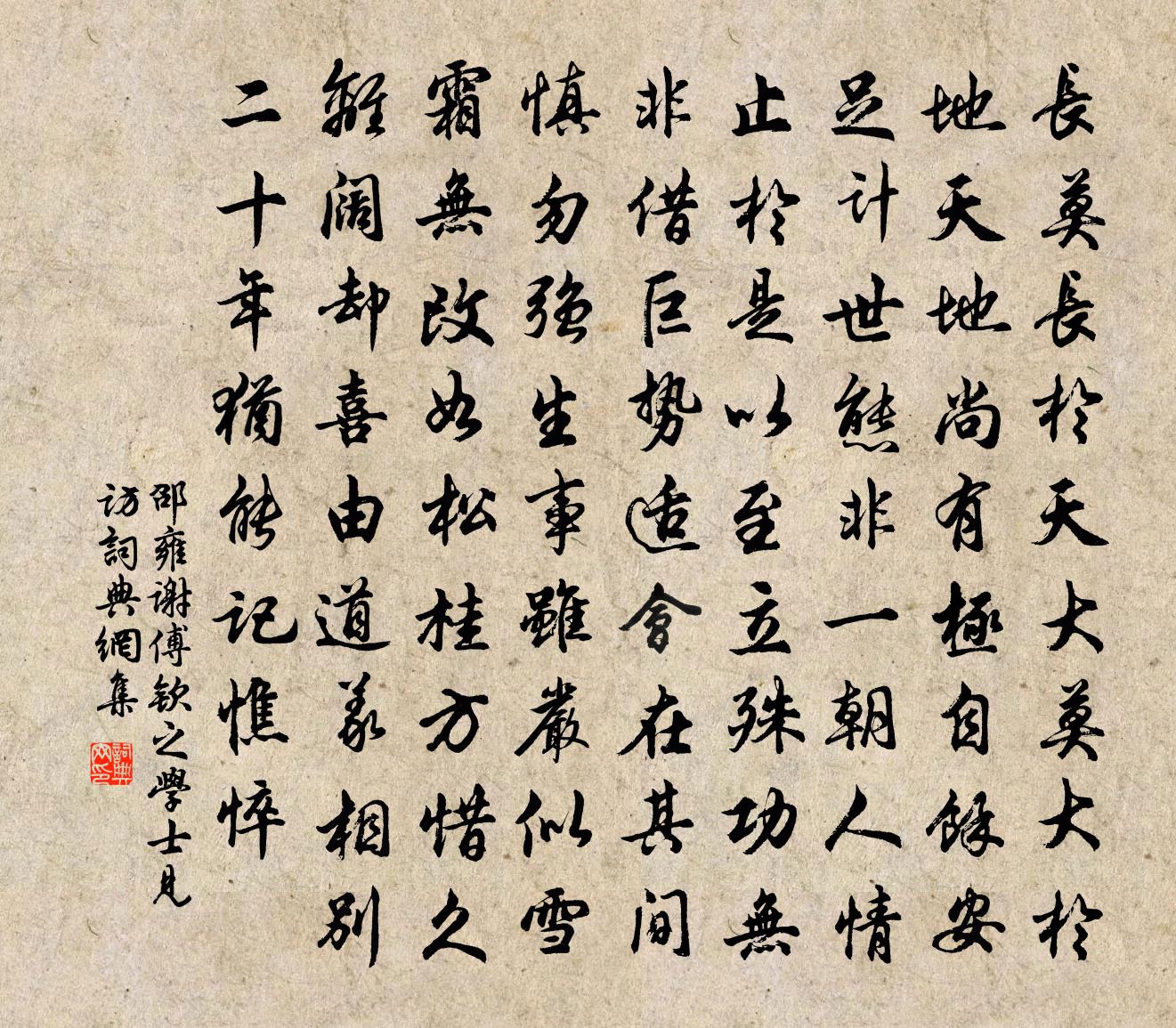詩詞名句歷史字典書法欣賞書法字典國語詞典說文解字康熙字典古漢語字典標 題 作 者 詩 句 謝傅欽之學士見訪作者:邵雍 朝代:宋代謝傅欽之學士見訪原文長莫長於天,大莫大於地。天地尚有極,自餘安足計。世態非一朝,人情止於是。以至立殊功。無非借巨勢。適會在其間,慎勿強生事。雖嚴似雪霜,無改如松桂。方惜久離闊,卻喜由道義。相別二十年,猶能記憔悴。詩詞問答問:謝傅欽之學士見訪的作者是誰?答:邵雍問:謝傅欽之學士見訪寫於哪個朝代?答:宋代邵雍謝傅欽之學士見訪書法欣賞謝傅欽之學士見訪書法作品詩詞推薦日永艾性夫〔宋代〕日永駒難過,庭空雀亦無。花招蜂出早,草礙蟻行迂。蕉葉露台掌,水光天影圖。下簾便道靜,煙篆起茶爐。早起王建〔唐代〕回燈正衣裳,出戶星未稀。堂前候姑起,環珮生晨輝。暗池光冪歷,密樹花葳蕤。九城鐘漏絕,遙聽直郎歸。仙源即事王鎡〔宋代〕山花幽草自成春,深入仙源欲避秦。地僻不知南北事,相逢儘是種桃人。南歌子(熟水)史浩〔宋代〕藻澗蟾光動,松風蟹眼鳴。濃熏沈麝入金瓶。瀉出溫溫一盞、滌煩膺。爽繼雲龍餅,香無芝術名。主人襟韻有餘清題長安薛員外水閣姚合〔唐代〕亭亭新閣成,風景益鮮明。石盡太湖色,水多湘渚聲。翠筠和粉長,零露逐荷傾。時倚高窗望,幽尋小逕行。林疏賜陳郁宋度宗〔宋代〕文窺先漢,詩到盛唐。侍余左右,知汝忠良。秦淮夜泊賀鑄〔宋代〕官柳動春條,秦淮生暮潮。樓台見新月,燈火上雙橋。隔岸開朱箔,臨風弄紫簫。誰憐遠遊子,心旆正搖搖。蝶戀花黃裳〔宋代〕興到濃時春不住。昨夜雕欄,放了花無數。談笑急邀吟醉侶。青娥也合隨軒去。媚恐情生嬌恐妒。今日開尊,多幸劉百十六兄送梅花大鯽新酒以詩將和其韻四首杜范〔宋代〕暖日浮光深水湄,魚方掉尾煦晴時。巨鱗如掌勤分餉,興入扁舟動釣絲。第一山閻蒼舒〔宋代〕極目平淮渺莽間,翠巒特地起煙鬟。要渠天下無雙手,題作東南第一山。除夜寄謙之方翥〔宋代〕去年雪暗江南路,日暮踟躕無宿處。今年坐見故園春,梅花已過桃花新。東皋薄田才數畝,依方旋造逡巡酒。嗣宗吾兄文夫宦遊天台余將官於江左不勝感離之情王淹〔宋代〕母慈懷遠音,積雨人未復。朝來鳥鵲喜,門外書一幅。小邦王事繁,夜食忘歸沐。何處望飛鳧,山中酒初熟。偈頌八十五首釋妙倫〔宋代〕始從鹿野苑,終至跋提河。於是二中間,未嘗說一字。年年花卉競芳時,東風一陣成狼藉。菩薩蠻盧祖皋〔宋代〕燭房花幌參差見。疏簾鎮日縈愁眼。巫峽小山屏。夢雲猶未成。帶霜邊雁落。雙字宮羅薄。二十四闌乾。夜來相對任氏行白居易〔唐代〕燕脂漠漠桃花淺,青黛微微柳葉新。下第投所知杜荀鶴〔唐代〕落第愁生曉鼓初,地寒才薄欲何如。不辭更寫公卿卷,卻是難修骨肉書。御苑早鶯啼暖樹,釣鄉春水浸貧居。擬離張王臣自湖南官滿趨朝舟過白沙和惠資福二詩章甫〔宋代〕叢桂書齋念昔游,紅蓮幕府喜歸休。秋風起舵蒹葭渚,春月停橈杜若洲。未用把詩輕萬戶,直須呼酒散千憂。贊公贈賣松人於武陵〔唐代〕入市雖求利,憐君意獨真。劚將寒澗樹,賣與翠樓人。瘦葉幾經雪,淡花應少春。長安重桃李,徒染六街塵。踏莎行(壽人母八十三)翁溪園〔宋代〕蓂莢飛雙,桂分缺二。金風已肅深秋意。萱庭戲彩恰稱觴,蕊宮仙子天台裔。鶴髮童顏,龜齡福備。孩兒書額添三煙波即事陸游〔宋代〕煙波深處臥孤篷,宿酒醒時聞斷鴻。最是平生會心事,蘆花千頃月明中。名句推薦年年春日異鄉悲,杜曲黃鶯可得知。韋莊《江外思鄉》 兼相愛,交相利。墨子《墨子·15章 兼愛(中)》 不知江月待何人,但見長江送流水。張若虛《春江花月夜》 微吟不道驚溪鳥,飛入亂雲深處啼。沈周《題畫》 遊子乍聞征袖濕,佳人才唱翠眉低。鄭谷《鷓鴣》 驪山四顧,阿房一炬,當時奢侈今何處?張養浩《山坡羊·驪山懷古》 愁雲淡淡雨瀟瀟。暮暮復朝朝。石孝友《眼兒媚·愁雲淡淡雨蕭蕭》 不管垂楊珠淚進,滴碎荷聲千頃。王夫之《清平樂·詠雨》 一上高城萬里愁,蒹葭楊柳似汀洲。許渾《鹹陽城東樓 / 鹹陽城西樓晚眺 / 西門》 邊月隨弓影,胡霜拂劍花。李白《塞下曲六首》