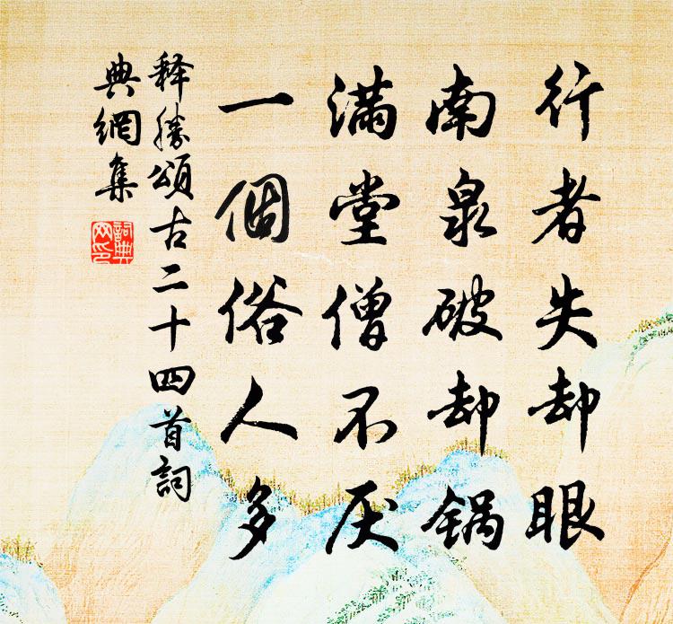 詩詞名句歷史字典書法欣賞書法字典國語詞典說文解字康熙字典古漢語字典標 題 作 者 詩 句 頌古二十四首作者:釋勝 朝代:宋代頌古二十四首原文行者失卻眼,南泉破卻鍋。滿堂僧不厭,一個俗人多。詩詞問答問:頌古二十四首的作者是誰?答:釋勝問:頌古二十四首寫於哪個朝代?答:宋代釋勝頌古二十四首書法欣賞頌古二十四首書法作品詩詞推薦浣溪沙·二月春花厭落梅晏幾道〔宋代〕二月春花厭落梅。仙源歸路碧桃催。渭城絲雨勸離杯。歡意似雲真薄倖,客鞭搖柳正多才。鳳樓人待錦書來。滿庭芳 偕 士安馬明初登荀和叔廣思樓許有壬〔元代〕沙路無泥,柳風如水,嫩涼偏入吟鞍。廣思樓上,雨後看西山。回首炎氛千丈,便長嘯、跳出塵寰。青天外,斜陽蝶戀花楊 * 〔宋代〕初過元宵三五後。曲檻依依,終日搖金牖。瘦損舞腰非為酒。長條聊贈垂鞭手。幾葉小梅春已透。信是風流,占盡聞歸雁宋祁〔宋代〕故歲東南客,新來西北飛。聲迷江月老,陣入塞雲稀。遠恨拋書素,餘音付玉徽。行人落君後,搔首未成歸。浣溪沙王采〔宋代〕珠箔隨檐一桁垂。繡屏遮枕四邊移。春歸人懶日遲遲。舊事只將雲入夢,新歡重借月為期。晚來花動隔牆枝。扇子詩李石〔宋代〕洞庭波浪五湖秋,縹緲雲霄帝子樓。樓上故人窮骨相,簫韶聲裡認仙舟。偈頌十六首釋如淨〔宋代〕善行者不移雙足,善入者不動雙扉。清秋夜冷波心月,誰問安禪友亦稀。豐年行陸游〔宋代〕南村北村春雨晴,東家西家地碓聲。稻陂正滿綠針密,麥隴無際黃雲平。前年穀與金同價,家家涕泣伐桑柘;豈知燕歸梁(中呂調)柳永〔宋代〕輕躡羅鞋掩絳綃。傳音耗、苦相招。語聲猶顫不成嬌。查德見、兩魂消。匆匆草草難留戀、還歸去、又無聊。若諧紀行雜詩李洪〔宋代〕高桅一一上灘船,流汗頳肩盡日牽。笑憶太湖波上宿,雲濤無際欲粘天。驛樓韓偓〔唐代〕流雲溶溶水悠悠,故鄉千里空回頭。三更猶憑闌乾月,淚滿關山孤驛樓。到家旬余意味甚適戲書陸游〔宋代〕天恐紅塵著腳深,不教經歲去山林。欲酬清淨三生願,先洗功名萬里心。石鼎颼飀閒煮茗,玉徽零落自修琴。晚來念奴嬌元好問〔金代〕金神龜按節,先下弦、一夕分明秋色。銀漢光浮天紺滑,星彩遙瞻南極。阿母分龜,桂娥饋藥,稱慶於今夕。解顏暑夜得月袁說友〔宋代〕風攪桐聲碎,螻鳴鼓吹長。半山蟾吐影,一水鑒浮光。冷碧迎秋色,清飈借久涼。不堪雞唱曉,歸枕報朝陽。天津感事二十六首邵雍〔宋代〕隋唐而下貴公卿,近世風波走利名。借問天津橋下水,當時湍急作何聲。寄趙碧瀾右之顧逢〔宋代〕移家歸故第,只在霅溪邊。舊別無旬日,今回恰數年。鶯花晴暖際,風雨晦冥天。總是思君處,孤吟每日憐。偈頌十八首釋師體〔宋代〕一拳也是打爺來,未有輸贏莫放開。割捨拍盲窮性命,觜喎鼻塌見全材。杜鵑花易士達〔宋代〕輕剪梢頭薄薄羅,子規湔血恨難磨。園林莫道香飛盡,嫩綠枝頭不用多。句宋太宗〔宋代〕君臣千載遇。虞美人 雨後同乾譽、才卿置酒來禽花下葉夢得〔宋代〕落花已作風前舞,又送黃昏雨。曉來庭院半殘紅,惟有遊絲,千丈裊晴空。殷勤花下同攜手,更盡杯中酒。美人不名句推薦天與短因緣,聚散常容易。晏幾道《生查子·狂花頃刻香》 綠竹入幽徑,青蘿拂行衣。李白《下終南山過斛斯山人宿置酒》 梨花自寒食,進節只愁余。楊萬里《寒食上冢》 蜂爭粉蕊蝶分香,不似垂楊惜金縷。溫庭筠《惜春詞》 飄零疏酒盞,離別寬衣帶。秦觀《千秋歲·水邊沙外》 前不見古人,後不見來者。陳子昂《登幽州台歌》 強中自有強中手,用詐還逢識詐人。羅貫中《三國演義·第十七回》 都道是金玉良姻,俺只念木石前盟。曹雪芹《終身誤》 借問漢宮誰得似,可憐飛燕倚新妝。李白《清平調·其二》 淡盪春光寒食天。玉爐沉水裊殘煙。夢回山枕隱花鈿。李清照《浣溪沙·淡盪春光寒食天》