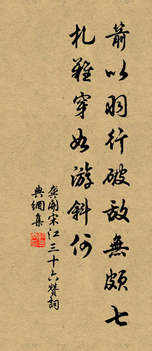 詩詞名句歷史字典書法欣賞書法字典國語詞典說文解字康熙字典古漢語字典標 題 作 者 詩 句 宋江三十六贊作者:龔開 朝代:宋代宋江三十六贊原文箭以羽行,破敵無頗。七札難穿,如游斜何。詩詞問答問:宋江三十六贊的作者是誰?答:龔開問:宋江三十六贊寫於哪個朝代?答:宋代龔開宋江三十六贊書法欣賞宋江三十六贊書法作品詩詞推薦毛詩柏舟陳普〔宋代〕身似柏舟無倚著,心非席石可推移。威儀不被憂心亂,始信生民有秉彝。偈頌一百三十六首釋惟一〔宋代〕赤肉團上,有一無位真人。眼裡耳里,鼻里口裡,頻頻出入,出入頻頻。能言能喚,能屈能伸。能好能惡,能喜能侍謝立齋小酌湖樓陳允平〔宋代〕風卷珠簾客佩清,杜鵑啼老送春聲。水浮亭館花間出,船載笙歌柳外行。千里夕陽歸夢遠,六橋飛絮馬蹄輕。欄乾送蔡山人李白〔唐代〕我本不棄世,世人自棄我。一乘無倪舟,八極縱遠舵。燕客期躍馬,唐生安敢譏。採珠勿驚龍,大道可暗歸。故山送陸澧還吳中(一作李嘉祐詩)劉長卿〔唐代〕瓜步寒潮送客,楊柳暮雨沾衣。故山南望何處,秋草連天獨歸。教授以憶梅韻賦雪詩蕃同之五首趙蕃〔宋代〕窮巷朝仍擁,寒廳午未開。人誰送酒直,鴉為致薪材。已倦除頭垢,寧能拭硯埃。高情蒙枉記,好句數能來。田四秘丞通判鎮戎軍祖無擇〔宋代〕身紆茜緩朝章貴,手把芝函帝命新。方朔上書曾自薦,祁奚外舉果知人。運籌暫逐征西將,持橐看歸拱北辰。我亦雲思胡仲弓〔宋代〕出岫本無心,雲在意亦在。松檜無高枝,舒捲何所礙。曾景建得罪道州聽讀戴復古〔宋代〕聞說烏台欲勘詩,此身幸不墮危機。少陵酒後輕嚴武,太白花前忤貴妃。遷客芬芳窮也達,故人評論是耶非。飽參有感二首(乙卯年有感丙辰年詩成二詩紀甘露之變)李商隱〔唐代〕九服歸元化,三靈葉睿圖。如何本初輩,自取屈氂誅。有甚當車泣,因勞下殿趨。何成奏雲物,直是滅萑苻。證逮寄新衡陽徐使君左司山長趙汝騰〔宋代〕醉墨淋漓天地間,誰知大德不踰閑。世無孔子今希孔,國有顏淵易鑄顏。多士龍門一喬嶽,斯文牛耳兩名山。暮春奉和初春幸太平公主南莊應制邵升〔唐代〕沁園佳麗奪蓬瀛,翠壁紅泉繞上京。二聖忽從鸞殿幸,雙仙正下鳳樓迎。花含步輦空間出,樹雜帷宮畫裡行。無路贈文兆釋惠崇〔宋代〕偶依京寺住,誰復得相尋。獨鶴窺朝講,鄰僧聽夜琴。注瓶沙井遠,鳴磬雪房深。久與松蘿別,空懸王屋心。謝令學道詩張辭〔唐代〕何用梯媒向外求,長生只合內中修。莫言大道人難得,自是行心不到頭。題秀江亭李宗勉〔宋代〕經行塔下幾春秋,每嘆無緣到上頭。今日登臨方覺險,不如歸去臥林丘。立雪洪咨夔〔宋代〕立雪窮蘭若,侵寒破驌驦。雲迷山糊塗,冰壓樹琅璫。瓮底茅柴熟,爐頭榾柮香。樂天隨分足,吾秋老田莊。答王去非覓柳栽劉宰〔宋代〕不惜柔條折贈君,與君分占萬象春。祗愁五柳門前景,不稱三槐堂里人。書簡寂觀金君卿〔宋代〕欹危煙靄間,覆壓山嶽半。境窮天地寒,氣古金碧爛。泉源長清霽,雲木杳凌亂。尋高下來遠,白日已西竄。過趙仲縝韓元吉〔宋代〕山下清溪溪上亭,竹陰芳徑眼增明。已知數日逢寒食,賸喜今朝作好晴。酒美故應容客醉,歌長不自覺詩成。春深寄婺州石君瑞料院陳著〔宋代〕靈光猶巋然,另久忽書傳。風雨各閉戶,山林多謝末。眼花千里外,心事十年前。獨為兒曹喜,通家契有緣。名句推薦桃花盡日隨流水,洞在清溪何處邊。張旭《桃花溪》 忽聞歌古調,歸思欲沾巾。杜審言《和晉陵陸丞早春遊望》 閨中少婦不知愁,春日凝妝上翠樓。王昌齡《閨怨》 兒童散學歸來早,忙趁東風放紙鳶。高鼎《村居》 喜得故人同待詔,擬沽春酒醉京華。高啟《清明呈館中諸公》 青天蜀道難,紅葉吳江冷。張可久《普天樂·秋懷》 別來春半,觸目柔腸斷。李煜《清平樂·別來春半》 何人解賞西湖好,佳景無時。歐陽修《採桑子·何人解賞西湖好》 孩兒立志出鄉關,學不成名誓不還。 * 《七絕·改西鄉隆盛詩贈父親》 江南幾日又天涯,誰與寄相思?董士錫《木蘭花慢·武林歸舟中作》
