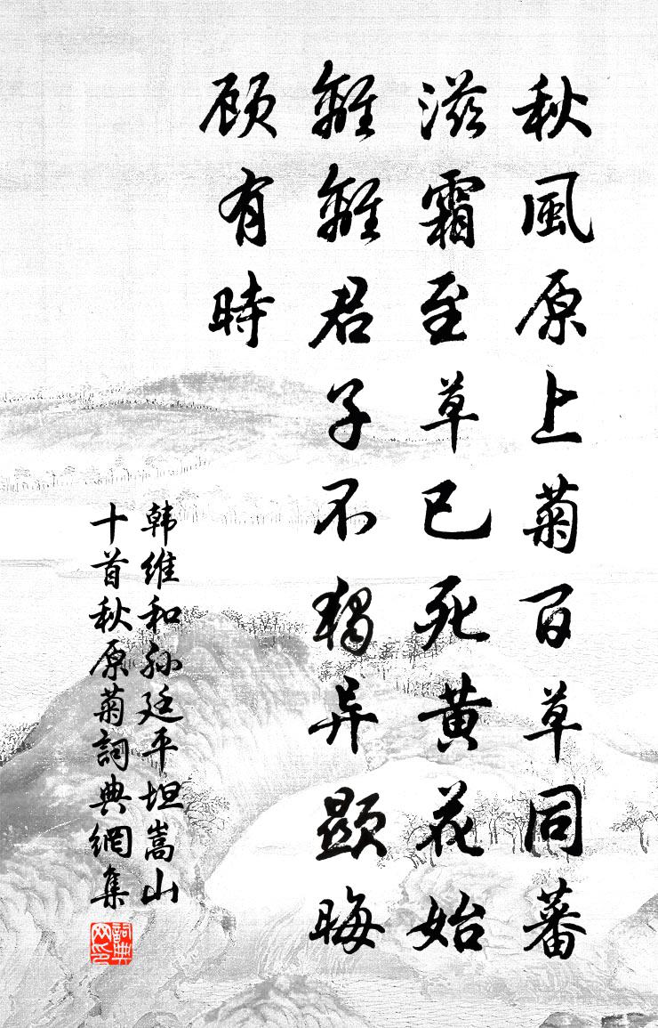 詩詞名句歷史字典書法欣賞書法字典國語詞典說文解字康熙字典古漢語字典標 題 作 者 詩 句 和孫廷平坦嵩山十首秋原菊作者:韓維 朝代:宋代和孫廷平坦嵩山十首秋原菊原文秋風原上菊,百草同蕃滋。霜至草已死,黃花始離離。君子不獨異,顯晦顧有時。詩詞問答問:和孫廷平坦嵩山十首秋原菊的作者是誰?答:韓維問:和孫廷平坦嵩山十首秋原菊寫於哪個朝代?答:宋代韓維和孫廷平坦嵩山十首秋原菊書法欣賞和孫廷平坦嵩山十首秋原菊書法作品詩詞推薦孝感縣張耒〔宋代〕蕭索江千縣,林端見客檣。山川錯吳楚,人物混荊楊。風略寒蘆陣,雲迷夕鳥行。故鄉同見月,誰記白頭郎。和沈書記同訪林處士范仲淹〔宋代〕山中宰相下崖扃,靜接遊人笑傲行。碧嶂淺深驕晚翠,白雲舒捲看春晴。煙潭共愛魚方樂,樵爨誰欺雁不鳴。莫道將軍王安節第四十七文天祥〔宋代〕激烈傷雄才,直氣橫乾坤。惆悵汗血駒,見此忠孝門。天壇陳洵直〔宋代〕峰頂侵雲法象寒,遠遊虛唱肅天官。松吟泉漱人仙去,猶想簫聲落舊壇。和士特栽果十首來禽劉子翬〔宋代〕粲粲來禽味獨香,孤根誰徙向天涯。好尋青李相遮映,風味應同逸少家。新秋白居易〔唐代〕西風飄一葉,庭前颯已涼。風池明月水,衰蓮白露房。其奈江南夜,綿綿自此長。城上初作新亭猶未名也邦人哄然稱為三槐殊不吳芾〔宋代〕我心只是憶天台,欲去無從首重回。若得此時追五柳,絕勝他日面三槐。年年白髮催人老,夜夜青山入夢來。縱有畫角辭何麟瑞〔宋代〕莫吹角,吹得梅花片片落。朝吹暮吹吹不了,盤古不知坐成老。童男童女求蓬山,何如此器束之高閣間。金盤擎露壯節亭二松趙崇鉘〔宋代〕壯節亭前野碧滋,髯龍飛去忽經時。只應黃犢蒼藤路,尚有清泉白石知。和襄陽徐相公商賀徐副使加章綬王傳〔唐代〕朱紫聯輝照日新,芳菲全屬斷金人。華筵重處宗盟地,白雪飛時郢曲春。仙府色饒攀桂侶,蓮花光讓握蘭身。自憐導引樓鑰〔宋代〕吾皇盡孝,宗廟務崇尊。巨典備彌文。巍巍東向開基主,七世祔神孫。追思九閏整乾坤。環宇慕洪恩。從今密邇高頌古一○一首釋子淳〔宋代〕劫火洞然無相宅,金門不睹玉樓家。寶天雲淡銀河冷,浩浩波瀾豈動沙。挽黃循齋陽枋〔宋代〕憶昔論文友,如今舐鼎仙。周經談正印,易學話真傳。一樂堂中語,三生石上緣。蓮峰望昆岳,惆悵白雲連。喜遷鶯(暮春)蔣捷〔宋代〕遊絲纖弱。謾著意絆春,春難憑托。水暖成紋,雲晴生影,雙燕又窺簾幕。露添牡丹新艷,風擺鞦韆閒索。對此景元夕雨中偶成四絕奉寄東齋陳起〔宋代〕車駕行將享孟春,月收梅影可愁人。雨師不管閒舞舞,預向天街灑暗塵。中書令程文簡輓辭三首蘇頌〔宋代〕都門簫鼓動哀音,丹旐西歸詔祖臨。故府簪裾空墮淚,高原松檟已成陰。藩朝宣力由忠藎,彝鼎書功映古今。他日用韻答厲輔卿二首洪咨夔〔宋代〕坐窮無過客,失喜得吾儕。材逸類淮海,詩清如簡齋。山明知玉氣,水涸見霜涯。期子進此道,為親生好懷。再和十首蘇轍〔宋代〕養生尤復要功圓,溜滴南溪石自穿。近見牢山陳道士,微言約我更三年。建溪十詠其十毛竹洞楊億〔宋代〕洞門生異竹,冉冉接同亭。石迸狂鞭怒,霜封密葉青。實應容鳳食,杖欲變龍形。逋客歸何日,岩阿已勒銘。與團圓/喜團圓佚名〔宋代〕絞綃霧縠,沒多重數,緊擬偷憐。孜孜覷著,算前生、只結得眼因緣。眼是心媒,心為情本,里外勾連。天還有意名句推薦不可以一時之譽,斷其為君子;不可以一時之謗,斷其為小人。馮夢龍《警世通言·卷四》 樓頭小婦鳴箏坐,遙見飛塵入建章。王昌齡《青樓曲二首》 佳人彩雲里,欲贈隔遠天。李白《折荷有贈》 大風起兮雲飛揚。威加海內兮歸故鄉。劉邦《大風歌》 江闊雲低、斷雁叫西風。蔣捷《虞美人·聽雨》 生前心已碎,死後性空靈。曹雪芹《紅樓夢·第五回》 天下者非一人之天下,唯有道者處之。姜子牙《六韜·武韜·順啟》 桃花潭水深千尺,不及汪倫送我情。李白《贈汪倫》 求財恨不多,財多害自己。佚名《增廣賢文·上集》 有過則改之,未萌則戒之馮夢龍《警世通言·卷三十八》