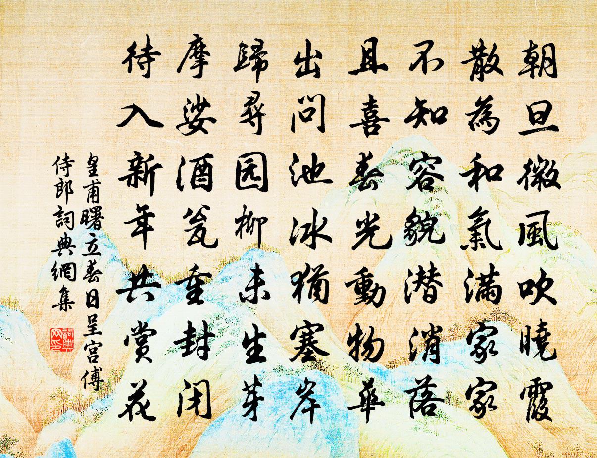 詩詞名句歷史字典書法欣賞書法字典國語詞典說文解字康熙字典古漢語字典標 題 作 者 詩 句 立春日呈宮傅侍郎作者:皇甫曙 朝代:唐代立春日呈宮傅侍郎原文朝旦微風吹曉霞,散為和氣滿家家。不知容貌潛消落,且喜春光動物華。出問池冰猶塞岸,歸尋園柳未生芽。摩娑酒瓮重封閉,待入新年共賞花。詩詞問答問:立春日呈宮傅侍郎的作者是誰?答:皇甫曙問:立春日呈宮傅侍郎寫於哪個朝代?答:唐代問:立春日呈宮傅侍郎是什麼體裁?答:七律皇甫曙立春日呈宮傅侍郎書法欣賞立春日呈宮傅侍郎書法作品注釋全唐詩:卷490-8詩詞推薦朝飢賈島〔唐代〕市中有樵山,此舍朝無煙。井底有甘泉,釜中乃空然。我要見白日,雪來塞青天。坐聞西床琴,凍折兩三弦。飢莫謫居新昌過黃羆嶺胡寅〔宋代〕昔年曾作守,旌騎擁山頭。省己無遺愛,投荒歷舊遊。妻兒相翼衛,風雨漫淹留。力學如何驗,仁人乃不憂。歸燕連文鳳〔宋代〕營巢生計失,余恨更依依。故國知何處,西風滿去衣。花案空昨夢,柳巷竟殘暉。欲問興亡事,無言各自飛。渡楊子江遇顛風和霍希文韻三首袁說友〔宋代〕沖濤逐浪不禁寒,何止舟行百丈灘。柂櫓一聲江已轉,瓜州岸上報平安。後催租行范成大〔宋代〕老父田荒秋雨里,舊時高岸今江水。傭耕猶自抱長飢,的知無力輸租米。自從鄉官新上來,黃紙放盡白紙催。賣衣贈隱者忘機家鉉翁〔宋代〕萬古周流此一機,何嘗絲髮涉人為。不須苦用忘忘意,認取存存不息時。江城子(再送盧倅)葉夢得〔宋代〕芙蓉開過雨初晴。曲池平。畫橋橫。耿耿銀河,遙下蘸空明。一舸吳松歸未得,聊共住,小蓬瀛。問君何事引前旌呼猿胡仲弓〔宋代〕前度寒林去不回,洞門今為小猿開。不因擲果為香餌,未必人呼肯下來。對雪高駢〔唐代〕六出飛花入戶時,坐看青竹變瓊枝。如今好上高樓望,蓋盡人間惡路岐。雪中簡林子長袁說友〔宋代〕玉沙飛墮何袞袞,一夜青山損顏色。此山底事厭青姿,故學何郎輕傅粉。曉來窗戶何人開,僵臥欲起驚皚皚。微風謝人惠舂陵石山胡寅〔宋代〕何人蹙縮九疑山,疊映公家幾硯間。欲識神魚閟凝湛,試看雲氣出孱顏。析蒲已結根千歲,舊蘚猶窺暈一斑。舉餉水調歌頭(次趙帥開西湖韻)林淳〔宋代〕湖波漲新綠,環繞越王山。棠齊清晝餘暇,贏得靜中觀。四面屏圍碧玉,十里障開雲錦,冰監倒晴瀾。目送孤鴻遠馬嵬賈島〔唐代〕長川幾處樹青青,孤驛危樓對翠屏。一自上皇惆悵後,至今來往馬蹄腥。句呂誨〔宋代〕我今從帝為司糾,更有何人植柏台。金剛隨機無盡頌莊嚴淨土分第十釋印肅〔宋代〕非身大莫尋,日落隔天陰。露柱侵雲漢,井是丈三深。頌古八首釋道顏〔宋代〕臘月火燒山,若口是黃蓮。相將歲除夜,竇八而衫穿。大可憐,把手入黃泉。次韻任信儒見過韓元吉〔宋代〕斗雀嗟窮巷,鳴騶枉故人。塵埃生破甑,風雨墊烏巾。別久情逾厚,詩來語更新。囊空得珠玉,此段不全貧。點絳唇王哲〔元代〕可惜嬌兒,惺惺伶俐聰明作。靈台廓。圓明光爍。我許蓬萊約。斷卻麻繩,正好修丹藥。如今卻。買條銅索。縛住寄湖掾楊浩然強至〔宋代〕新持手版苕溪掾,應恨浮名別故鄉。澤國幾瞻飛雁序,春風自入墜鱣堂。坐曹未改平生好,開卷能如往日忙。龍首宋復古度支晚川晴雪文同〔宋代〕霽色變雲林,寒光混煙水。遙山定何處,渺漭才可指。名句推薦白梅懶賦賦紅梅,逞艷先迎醉眼開。曹雪芹《詠紅梅花得“梅”字》 因人成事,其功不難。魏徵《隋書·列傳·卷七》 人無善志,雖勇必傷。劉安及其門客《淮南子·主術訓》 一事真,百事真。馮夢龍《醒世恆言·卷十六》 山高必有怪,嶺峻卻生精。吳承恩《西遊記·第二十七回》 長恨春歸無覓處,不知轉入此中來。白居易《大林寺桃花》 三杯兩盞淡酒,怎敵他、晚來風急?李清照《聲聲慢·尋尋覓覓》 文章合為時而著,歌詩合為事而作。白居易《與元九書》 萬種思量,多方開解,只恁寂寞厭厭地。柳永《憶帝京·薄衾小枕涼天氣》 江晚正愁予,山深聞鷓鴣。辛棄疾《菩薩蠻·書江西造口壁》