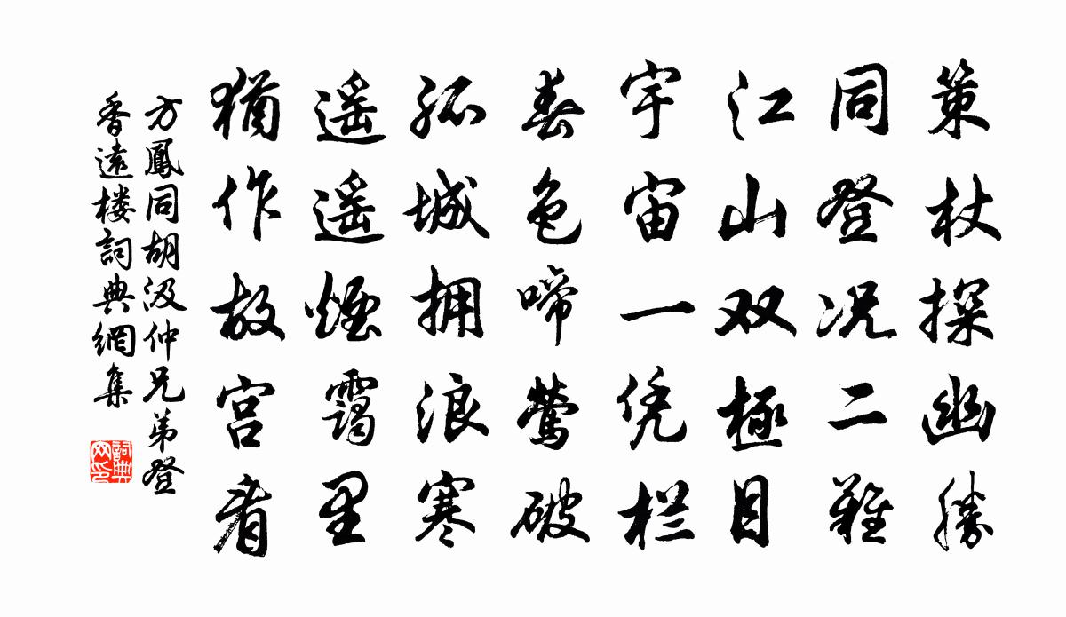 詩詞名句歷史字典書法欣賞書法字典國語詞典說文解字康熙字典古漢語字典標 題 作 者 詩 句 同胡汲仲兄弟登香遠樓作者:方鳳 朝代:宋代同胡汲仲兄弟登香遠樓原文策杖探幽勝,同登況二難。江山雙極目,宇宙一憑欄。春色啼鶯破,孤城擁浪寒。遙遙煙靄里,猶作故宮看。詩詞問答問:同胡汲仲兄弟登香遠樓的作者是誰?答:方鳳問:同胡汲仲兄弟登香遠樓寫於哪個朝代?答:宋代方鳳同胡汲仲兄弟登香遠樓書法欣賞同胡汲仲兄弟登香遠樓書法作品詩詞推薦白蓮雨後漸衰釋居簡〔宋代〕曉池芳柄褭殘馨,褪雨欹風鷺委翎。碧展一奩秋練練,似憐玉色鏡中零。送浙東陸中丞朱慶餘〔唐代〕坐將文教鎮藩維,花滿東南聖主知。公務肯容私暫入,豐年長與德相隨。無賢不是朱門客,有子皆如玉樹枝。自愛題括蒼馮公嶺二首曹豳〔宋代〕村南村北梧桐樹,山後山前白菜花。莫向杜鵑啼處宿,楚鄉寒食客思家。依韻和劉十秋霖梅堯臣〔宋代〕秋草更綠秋林衰,長安遊客未成衣。淒淒斗欲變寒色,一夜獨語看燈輝。漏澤院四絕句陳造〔宋代〕雋游分破北窗眠,笑撚吟髭看控弦。久袖飛馳銀管手,為渠途改角弓篇。和王文州詠雪韻王炎〔宋代〕一穗香雲擁博山,毛錐吸盡墨池灣。詩如驪頷生明月,人似龍媒出帝閒。灑落高情忘固陋,崢嶸健論起衰孱。蒼髯絕句一首蘇籀〔宋代〕雙紋八尺展雕床,蓮艷方空夜玉香。雅秀冰姿延閣彥,豈應簪斷作淒涼。飲桂香茶簡翁及甫李洪〔宋代〕午睡初醒緩注湯,一甌清露沃詩腸。疑君昔日探蟾窟,猶帶天邊桂子香。湖上閒居(一作閒居湖上)竇參〔唐代〕避影將息陰,自然知音稀。向來深林中,偶亦有所窺。飛鳥口銜食,引雛上高枝。高枝但各有,安知宜不宜。止止春日憶家(一作春日歸山)李嘉祐〔唐代〕自覺勞鄉夢,無人見客心。空餘庭草色,日日伴愁襟。出真州文天祥〔宋代〕瓊花堂上意茫然,志士忠臣淚徹泉。賴有使君知義者,人方欲殺我猶憐。小桃紅·江岸水燈盍西村〔元代〕萬家燈火鬧春橋,十里光相照,舞鳳翔鸞勢絕妙。可憐宵,波間湧出蓬萊島。香菸亂飄,笙歌喧鬧,飛上玉樓腰。泉水佚名〔先秦〕毖彼泉水,亦流於淇。有懷於衛,靡日不思。孌彼諸姬,聊與之謀。出宿於泲,飲餞於禰,女子有行,遠父母兄弟柬胡衛道劉過〔宋代〕淮北山南幕府開,江淮誰念有遺才。出門萬里長安道,乞我於潛馭馬來。中秋夜八絕蘇轍〔宋代〕欲見初容燭,將升尚有星。漸高圍漸小,雲外轉亭亭。新雁過妝樓吳文英〔宋代〕夢醒芙蓉。風檐近、揮疑佩玉丁東。翠微流水,都是惜別行蹤。宋玉秋花相比瘦,賦情更苦似秋濃。小黃昏,紺雲眼兒媚(水晶葡萄)張鎡〔宋代〕玄霜涼夜鑄瑤丹。飄落翠藤間。西風萬顆,明珠巧綴,零露初漙。詩人那識風流品,馬乳漫堆盤。玉纖旋摘,銀罌送友人葛紹體〔宋代〕曾嗟別去作西東,今喜重來笑語同。來日未多今又去,相思無奈立東風。長安道中潘閬〔宋代〕遊子辭鄉早,高堂親已老。燕來不東飛,寄書何日到。宿趙屯黃庶〔宋代〕蘆花一股水,弭楫日已暮。山間聞雞犬,無人見煙樹。行逐羊豕跡,始識入市路。菱芡與魚蟹,居人足來去。漁家名句推薦莊生曉夢迷蝴蝶,望帝春心托杜鵑。李商隱《錦瑟》 籬落疏疏一徑深,樹頭花落未成陰。楊萬里《宿新市徐公店》 荻花秋,瀟湘夜,橘洲佳景如屏畫。李珣《漁歌子·荻花秋》 秋色冷並刀,一派酸風卷怒濤。陳維崧《南鄉子·邢州道上作》 知者順時而謀,愚者逆理而動范曄《後漢書·列傳·朱馮虞鄭周列傳》 春悄悄,夜迢迢。碧雲天共楚宮遙。晏幾道《鷓鴣天·小令尊前見玉簫》 人生一世,草長一春。佚名《增廣賢文·上集》 昨夜風開露井桃,未央前殿月輪高。王昌齡《 * 曲》 我閉南樓看道書,幽簾清寂在仙居。李白《早秋單父南樓酬竇公衡》 青,取之於藍而青於藍;冰,水為之而寒於水。荀子《荀子·勸學》