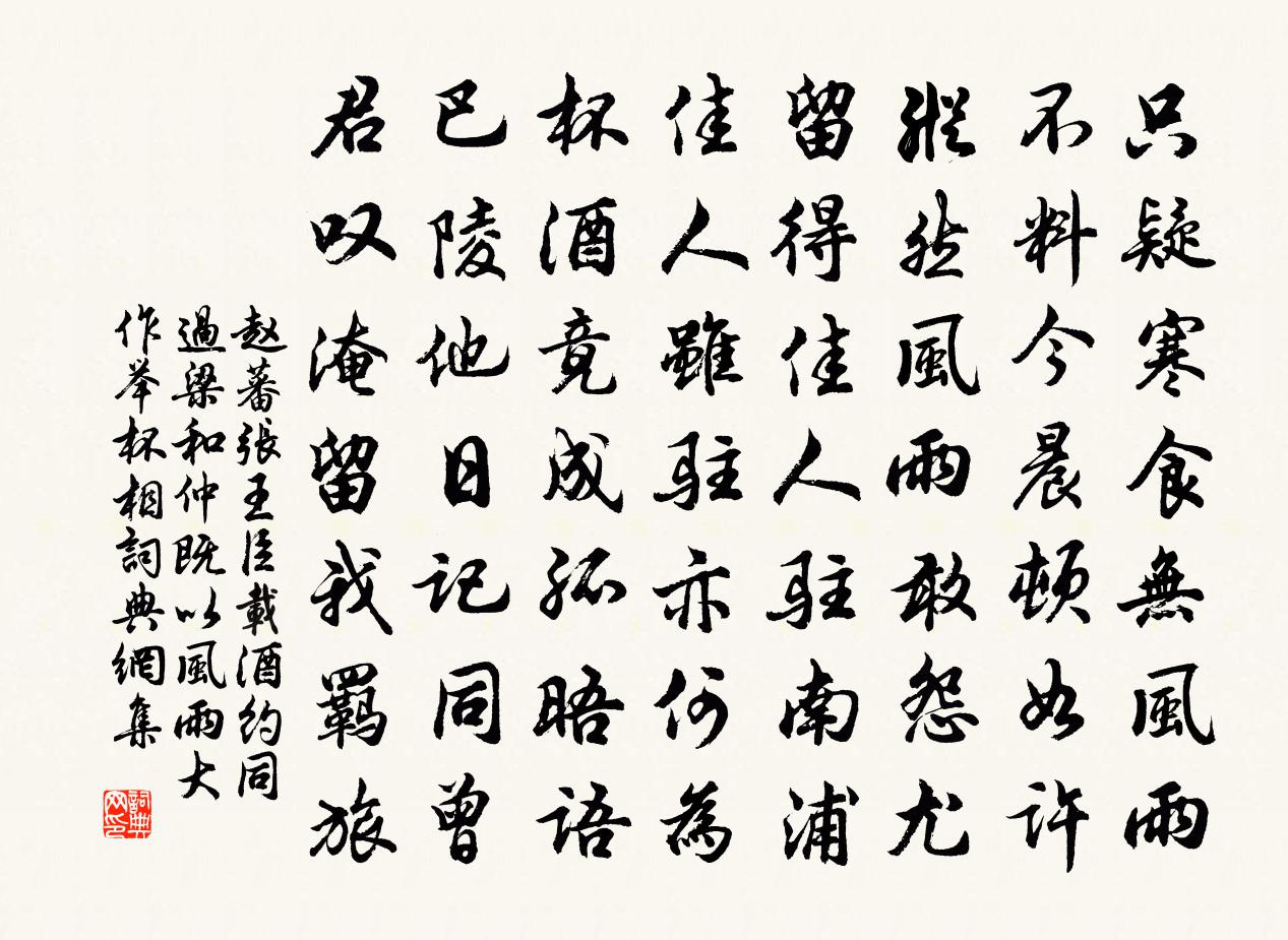 詩詞名句歷史字典書法欣賞書法字典國語詞典說文解字康熙字典古漢語字典標 題 作 者 詩 句 張王臣載酒約同過梁和仲既以風雨大作舉杯相作者:趙蕃 朝代:宋代原文只疑寒食無風雨,不料今晨頓如許。縱然風雨敢怨尤,留得佳人駐南浦。佳人雖駐亦何為,杯酒竟成孤晤語。巴陵他日記同曾,君嘆淹留我羈旅。詩詞問答問:《張王臣載酒約同過梁和仲既以風雨大作舉杯相》的作者是誰?答:趙蕃問:該詩寫於哪個朝代?答:宋代書法欣賞張王臣載酒約同過梁和仲既以風雨大作舉杯相書法作品詩文賞析【原題】:張王臣載酒約同過梁和仲既以風雨大作舉杯相屬而止偶成四韻呈和仲詩詞推薦列仙文金母飛空歌孟郊〔唐代〕駕我八景輿,欻然入玉清。龍群拂霄上,虎旗攝朱兵。逍遙三弦際,萬流無暫停。哀此去留會,劫盡天地傾。當尋病酒新愈獨臥苹風閣戲書陸游〔宋代〕用酒驅愁如伐國,敵雖摧破吾亦病。狂呼起舞先自困,閉戶垂帷真廟勝。今朝屏事臥湖邊,不但心空兼耳靜。 * 玉唾壺岳珂〔宋代〕古來玉唾壺,歌罷壺為缺。憂時一片心,常惜志士烈。{左辟右鳥}鵜瑩出昆吾刀,截肪溫潤如世膏。悲歌聲動行問月二首楊萬里〔宋代〕月色幸自好,元無半點雲。移床來一看,雲月兩昏昏。柳歐陽修〔宋代〕雨闊堤長走畫轅,絮兼梨雪墮春煙。東風苑外千絲老,猶伴吳蠶盡日眠。山村戴復古〔宋代〕野老幽居處,成吾一首詩。桑枝礙行路,瓜蔓網疏籬。牧去牛將犢,人來犬護兒。生涯雖仆略,氣象自熙熙。和象翁絕句衛宗武〔宋代〕春花色色俱成夢,夏實纍纍結滿枝。獨有葵榴媚清晝,薰風時度五弦詩。寄石隱之潘閬〔宋代〕獨上危樓返照間,亂鴉群鳥噪回還。故人歲暮在何處,空見千山與萬山。初發嘉州蘇轍〔宋代〕放舟沫江濱,往意念荊楚。擊鼓樹兩旗,勢如遠征戍。紛紛上船人,櫓急不容語。餘生雖江陽,未省至嘉樹。巉巉雪歌陸游〔宋代〕黑雲黯黯如翻鴉,急霰颯颯疑投沙。初聞萬竅號地籟,已見六出飛天花。寧論異事吠群犬,且喜和氣連千家。穿簾東山廟方回〔宋代〕靈跡從來擅勝游,茲山亦復甲吾州。杉腰一殿懸金屋,雲腳千家聳畫樓。鐘鼓鄰僧新院宇,桑麻平世舊田疇。乾坤把酒對月歌唐寅〔明代〕李白前時原有月,惟有李白詩能說。李白如今已仙去,月在青天幾圓缺?今人猶歌李白詩,明月還如李白時;我當酬主客仲員外見賀正除權德輿〔唐代〕五年承乏奉如綸,才薄那堪侍從臣。禁署獨聞清漏曉,命書慚對紫泥新。周班每喜簪裾接,郢曲偏宜諷詠頻。憶昔秋日山寺懷友人劉滄〔唐代〕蕭寺樓台對夕陰,淡煙疏磬散空林。風生寒渚白蘋動,霜落秋山黃葉深。雲盡獨看晴塞雁,月明遙聽遠村砧。相思次韻太守會宜休亭二首張嵲〔宋代〕屐齒破苔色,林塘欣共尋。水光連竹塢,山翠上衣襟。疏柳搖斜日,高梧轉晚陰。娵偶休入詠,可怕兕觥深。浣溪沙呂渭老〔宋代〕煙柳濛濛鵲做巢。青青弱草帶斜橋。鶯聲多在杏花梢。逐伴不知春路遠,見人時著小詞招。阿誰有分伴 * 。游博羅香積寺(並引)蘇軾〔宋代〕寺去縣七里,三山犬牙,夾道皆美田,麥禾甚茂。寺下溪水可作碓磨,若築塘百步閘而落之,可轉兩輪舉四杵也。偈頌七十六首釋師範〔宋代〕五峰門下,三個五個。衲被幪頭。圍爐打坐,鼻笑瞿曇,平欺達磨。又誰管你,張三李六。諸方爐鞴正炎炎,何似春社陸游〔宋代〕桑眼初開麥正青,勃姑聲里雨冥冥。今朝有喜君知否,到處人家醉不醒。擬九頌平舟程公許〔宋代〕滄海兮渺瀰,杳莫見兮津涯。愕風濤兮項洞,問靈皇兮何之。天蒼蒼兮天色,水混混相接。何人世間心兮過險,陡名句推薦三極彝訓,訓深稽古。致化歸一,分教斯五。劉勰《文心雕龍·宗經》 千尋鐵鎖沉江底,一片降幡出石頭。劉禹錫《西塞山懷古》 賤禮義而貴勇力,貧則為盜,富則為賊。荀子《荀子·樂論》 相看兩不厭,只有敬亭山。李白《獨坐敬亭山》 桃未芳菲杏未紅,沖寒先已笑東風。曹雪芹《紅樓夢·第五十回》 江深竹靜兩三家,多事紅花映白花。杜甫《江畔獨步尋花七絕句》 路入南中,桄榔葉暗蓼花紅。歐陽炯《南鄉子·路入南中》 秋色到空閨,夜掃梧桐葉。夏完淳《卜運算元·秋色到空閨》 黃霧漲天雪晦冥,黑雲拂地風膻腥沈約《昭君辭》 遙想公瑾當年,小喬初嫁了,雄姿英發。蘇軾《念奴嬌·赤壁懷古》