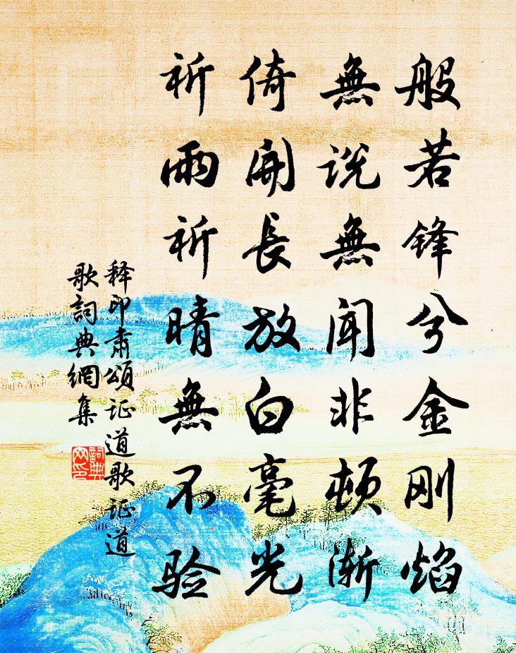 詩詞名句歷史字典書法欣賞書法字典國語詞典說文解字康熙字典古漢語字典標 題 作 者 詩 句 頌證道歌證道歌作者:釋印肅 朝代:宋代頌證道歌證道歌原文般若鋒兮金剛焰,無說無聞非頓漸。倚開長放白毫光,祈雨祈晴無不驗。詩詞問答問:頌證道歌證道歌的作者是誰?答:釋印肅問:頌證道歌證道歌寫於哪個朝代?答:宋代釋印肅頌證道歌證道歌書法欣賞頌證道歌證道歌書法作品詩詞推薦上鄭毅夫許氏〔宋代〕明時樂事輸詩酒,帝里風光剩占春。況是白衣重得侶,不堪青旆自招人。早知玉漏催三鼓,肯把金貂換百巡。大抵六年春贈分司東都諸公白居易〔唐代〕我為同州牧,內愧無才術。忝擢恩已多,遭逢幸非一。偶當谷賤歲,適值民安日。郡縣獄空虛,鄉閭盜奔逸。其間城西書事韓維〔宋代〕蔬畦繞茅屋,林下轆轤遲。霜蔓已除架,風飄空掛籬。寄保暹師釋文兆〔宋代〕近聞高靜趣,猶寄廣陵居。夜會聽琴阻。秋期看月疏。幾成歸越夢,久絕入梁書。四釋分題處,年來一榻虛。李伯紀丞相輓詩二首張浚〔宋代〕十相從明主,唯公望最隆。召周雖異跡,李郭本心同。未遇升天藥,空餘濟世功。薰風歌吹咽,淚盡古城東。偈頌七十六首釋子益〔宋代〕天上月圓,人間月半。明眼衲僧,見似不見。盞子撲落地,楪子成七片。雨中遣興呈遠齋父子孫丈昆仲趙蕃〔宋代〕睡思昏然晝掩門,覺來山雨已翻盆。黃梅應熟騷人念,綠野可耕田父言。林外竹雞時自語,階前花鴨故相喧。詩材出郊陳杰〔宋代〕飛蓋籠晴晝,行廚帳遠林。柳塘風度絮,花逕日移陰。翠袖穿紅迥,清歌繞綠深。獨將衰晚意,危坐數雲岑。哭王僕射相公(名播,時兼鹽鐵,暴薨)劉禹錫〔唐代〕子侯一日病,滕公千載歸。門庭愴已變,風物澹無輝。群吏謁新府,舊賓沾素衣。歌堂忽暮哭,賀雀盡驚飛。與毛女游陳摶〔宋代〕藥苗不滿笥,又更上危顛。回指歸去睡,相將入翠因。老身陸游〔宋代〕老身無處著,登望憶閒遊。白浪浮天遠,黃雲出塞秋。百年殊鼎鼎,萬事只悠悠。歲晚長亭路,寒侵季子裘。句張載〔宋代〕若厭塵沙隨馬足,卻思風浪拍船頭。失調名佚名〔宋代〕春來長是病厭厭。錢塘春感六首王逢〔元代〕瑤池青鳥集觚稜,白塔金鳧閟夜燈。雲母帳虛星采動,水晶宮冷露華凝。驪山草暗墟周業,郿塢花繁失漢陵。白馬矮道者釋紹曇〔宋代〕身如椰子口宏開,看盡諸方鬼戲來。放一頭低人不識,疏山師叔是同胎。次韻王得淦長至陳著〔宋代〕二十四節氣,來自混元前。老息他無分,新陽便有緣。從教寒又暑,慣得海為田。此理須看破,何妨日當的。梅花引 溪舊隱丘處機〔元代〕無名客。無牽迫。無桑無梓無田宅。古岩前。老松邊。長歌隱几,徐徐考太玄。玄中默論無生死。實際何曾分彼此祁門道中即事曹彥約〔宋代〕嶂疊巒層巧送青,一溪幽處小園亭。誰能換得王維手,洗我塵埃作畫屏。如夢令(寄蔡堅老)趙長卿〔宋代〕居士年來病酒。肉食百不宜口。蒲合與波薐,更著同蒿蔥韭。親手。親手。分送臥龍詩友。故山陸游〔宋代〕落澗泉奔舞玉虹,護丹松老臥蒼龍。霜柑籬角寒初熟,野碓雲邊夜自舂。挈榼人沽村市酒,打包僧趁寺樓鍾。幽尋名句推薦君人者不可以不慎取臣,匹夫不可不慎取友。友者,所以相有也。荀子《荀子·大略》 同為懶慢園林客,共對蕭條雨雪天。白居易《雪夜小飲贈夢得》 彩扇紅牙今都在,恨無人、解聽開元曲。蔣捷《賀新郎·夢冷黃金屋》 中山人予之貓,貓善捕鼠及雞。劉基《乞貓》 黃河西來決崑崙,咆哮萬里觸龍門。李白《公無渡河》 世治不輕,世亂不沮;同弗與,異弗非也。戴聖《禮記·儒行》 夜戰桑乾北,秦兵半不歸。許渾《塞下曲》 絲槐煙柳長亭路,恨取次、分離去。惠洪《青玉案·絲槐煙柳長亭路》 兒不嫌母醜,狗不嫌家貧。佚名《增廣賢文·下集》 去年夜半橫江夢,倚危檣,參差曾賦劉辰翁《桂枝香· * 人去》