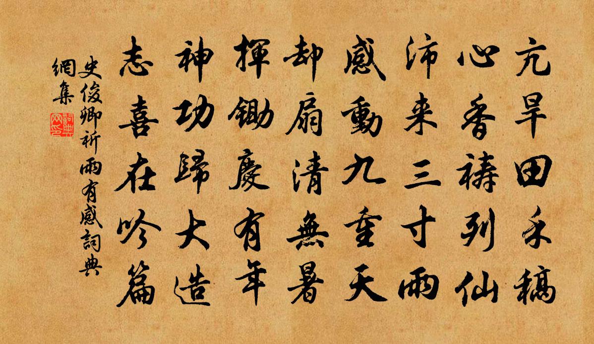 詩詞名句歷史字典書法欣賞書法字典國語詞典說文解字康熙字典古漢語字典標 題 作 者 詩 句 祈雨有感作者:史俊卿 朝代:宋代祈雨有感原文亢旱田禾稿,心香禱列仙。沛來三寸雨,感動九重天。卻扇清無暑,揮鋤慶有年。神功歸大造,誌喜在吟篇。詩詞問答問:祈雨有感的作者是誰?答:史俊卿問:祈雨有感寫於哪個朝代?答:宋代史俊卿祈雨有感書法欣賞祈雨有感書法作品詩詞推薦偈頌一百零二首釋慧遠〔宋代〕醉翁亭畔寒梅折,庶子泉邊瑞雪鋪。不二法門從此入,更於何處覓文殊。句廖挺〔宋代〕餘波下作雙溪水,只欠休文八詠樓。酬馮十七舍人宿衛贈別五韻劉禹錫〔唐代〕少年為別日,隋宮楊柳陰。白首相逢處,巴江煙浪深。使星上三蜀,春雨沾衣襟。王程促速意,夜語殷勤心。卻歸次韻葉司戶許月卿〔宋代〕舟自搖搖釣瀨濱,睦州司戶得詩人。對床夜雨如蘇子,滿座春風似伯淳。文武略窺瑤蓼射,婺衢爭耀錦鄉春。金華有懷參政范公因書桂隱近事奉寄二首張鎡〔宋代〕迂隣尋阿作治中,閒事歸來卻不慵。曉炷佛香聊作觀,晚投社飽亦稱儂。荷花制就身宜著,菰米收成手自舂。最是和趙生二首胡寅〔宋代〕遍游南北與西東,欲訪人間國士風。處世甚疎皆笑我,宅心無累獨奇公。詩才自愧非三上,酒聖相從又一中。芍藥減字木蘭花洪皓〔宋代〕蜂房餘液。寫就南枝凌正色。折乾垂芳。點綴如生秘暗香。壽陽妝樣。縴手拈來簪髻上。恍若還家。暫睹真花壓百王子開朝散早年以疾病謝事還江陰求詩為別三張耒〔宋代〕濟物昔所務,舍耕還自非。駸駸老將至,忽忽意多違。問有王夫子,柴車謝事歸。令人三嘆息,羞澀向塵衣。和樂天題真娘墓劉禹錫〔唐代〕薝蔔林中黃土堆,羅襦繡黛已成灰。芳魂雖死人不怕,蔓草逢春花自開。幡蓋向風疑舞袖,鏡燈臨曉似妝檯。吳王采菱曲江淹〔南北朝〕秋日心容與。涉水望碧蓮。紫菱亦可采。試以緩愁年。參差萬葉下。泛漾百流前。高彩隘通壑。香氛麗廣川。歌出知邵武縣禱雨大有感應任滿作詩紀其事張士遜〔宋代〕乞靈曾爇一爐煙,言下滂沱救旱田。今日解龜留數字,要教來者更恭虔。桂隱紀詠依綠亭張鎡〔宋代〕月出煙暝時,水調誰家唱。短櫂欲相尋,先經此亭上。示施又新同舍蘇籀〔宋代〕華發些些似不公,辰申齪齪有何庸。力拋羈紲片時適,談謔槃筵一笑烘。山剎汲壺茶可點,匠人礲斲事方叢。麥秋至上高邑阮閱〔宋代〕上蔡人歸古縣封,蜀江依舊水流東。末山雲散庵猶在,敖嶺丹成井已空。奉和魯望漁具十五詠罱皮日休〔唐代〕煙雨晚來好,東塘下罱去。網小正星□,舟輕欲騰翥。誰知荇深後,恰值魚多處。浦口更有人,停橈一延佇。句梅堯臣〔宋代〕亞夫金鼓從天落,韓信旌旗背水陳。次賦順適堂韻葉茵〔宋代〕萬卷藏書抵萬金,翛然軒宇絕塵侵。順時不作榮枯想,適意元無勝負心。蒲石疏簾真道院,柏香淨幾小叢林。四時集靈台二首張祜〔唐代〕日光斜照集靈台,紅樹花迎曉露開。昨夜上皇新授籙,太真含笑入簾來。虢國夫人承主恩,平明騎馬入宮門。卻嫌贈殷山人李遠〔唐代〕有客抱琴宿,值予多怨懷。啼烏弦易斷,嘯鶴調難諧。曲罷月移幌,韻清風滿齋。誰能將此妙,一為奏金階。同年秘書丞陳動之輓詞二首歐陽修〔宋代〕富貴聲名豈足論。死生榮辱等埃塵。青衫照日夸春榜,白首餘年哭故人。盛德不忘存志刻,話言能記有朋親。吳江名句推薦正是天山雪下時,送君走馬歸京師。岑參《天山雪歌送蕭治歸京》 人學始知道,不學亦徒然。佚名《增廣賢文·上集》 差之毫厘,失之千里。佚名《增廣賢文·上集》 致虛極;守靜篤。萬物並作,吾以觀復。老子《老子·道經·第十六章》 眾口鑠金,積毀銷骨。司馬遷《史記·張儀列傳》 君者,舟也;庶人者,水也。水則載舟,水則覆舟。荀子《荀子·哀公》 幾日喜春晴,幾夜愁春雨。高觀國《卜運算元·泛西湖坐間寅齋同賦》 寄言儔侶,莫負廣寒沈醉。文徵明《念奴嬌·中秋對月》 獨出前門望野田,月明蕎麥花如雪。白居易《村夜》 凡百事之成也,必在敬之;其敗也,必在慢之。荀子《荀子·議兵》