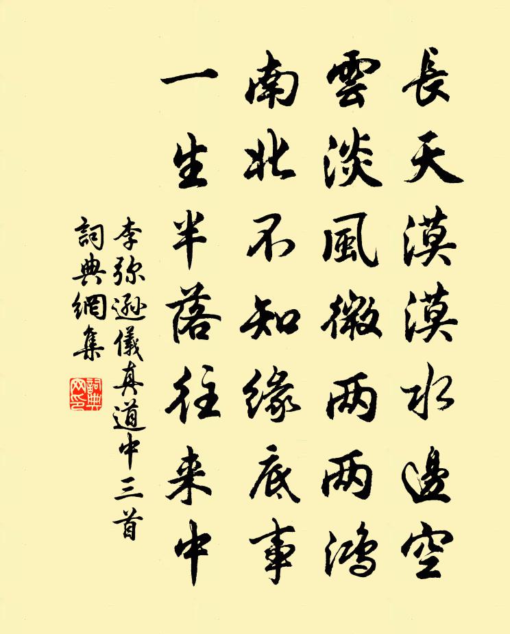 詩詞名句歷史字典書法欣賞書法字典國語詞典說文解字康熙字典古漢語字典標 題 作 者 詩 句 儀真道中三首作者:李彌遜 朝代:宋代儀真道中三首原文長天漠漠水邊空,雲淡風微兩兩鴻。南北不知緣底事,一生半落往來中。詩詞問答問:儀真道中三首的作者是誰?答:李彌遜問:儀真道中三首寫於哪個朝代?答:宋代李彌遜儀真道中三首書法欣賞儀真道中三首書法作品詩詞推薦十一月七日五首張耒〔宋代〕寒暑添線衲,朝晡折足鐺。無言病居士,面壁老胡僧。佛祖豈欺我,乾坤終有憑。窮年無一事,高臥醉騰騰。道中四絕鄭剛中〔宋代〕過雨山間雲出沒,夕陽天際鳥浮沈。男兒馬上志四海,不是尋常客子心。游臨丞輓詩魏了翁〔宋代〕論激回天力,身開夾日勛。危言起平勃,奸膽落伾文。淚灑衡山月,神淒蜀嶺雲。若微劉柱史,千古閟清芬。古斷腸曲三十首周端臣〔宋代〕竹葉裙紗摺摺香,荷風占斷晚西涼。年來歡事愁邊減,別後秋更夢外長。送梁學士知襄州梅堯臣〔宋代〕騎吹荊州去,喬林漢水前。鄉亭逢故老,牛酒問高年。翠巘臨關路,黃柑逐賈船。習家池館在,賓從與留連。齒痛有感陸游〔宋代〕眼暗頭童負聖時,齒牙欲脫更堪悲。暮年漸解人間事,蒸食哀梨亦自奇。送舍弟杜荀鶴〔唐代〕我受羈棲慣,客情方細知。好看前路事,不比在家時。勉汝言須記,聞人善即師。旅中無廢業,時作一篇詩。夜坐再用韻二首裘萬頃〔宋代〕家有輞川集,人如王右丞。琴書多暇日,觴詠盡高朋。擬脫雲山屐,來分夜案燈。新詩要傳寫,病眼任瞢騰。次漢英教授示和尹少稷韻四首汪應辰〔宋代〕疇昔持民欲見賢,肯容閭巷快爭先。豈知咫尺隔千里,空誦白雲長在天。水調歌頭(楊提刑子謨生日)魏了翁〔宋代〕有匪碧岩使,長珮奏琅球。門前初暑才漲,一室淡於秋。簾卷峨眉煙雨,袖挾西川風露,滿眼綠陰稠。人物眇然甚偈頌二百零五首釋正覺〔宋代〕身里出門,門裡出身。白雲能作客,明月解隨人。段成式《酉陽雜俎》引古語佚名〔唐代〕三守庚申三屍伏,七守庚申七尺滅。送田道士使蜀投龍宋之問〔唐代〕風馭忽泠然,雲台路幾千。蜀門峰勢斷,巴字水形連。人隔壺中地,龍游洞裡天。贈言回馭日,圖畫彼山川。天津橋南山中各題一句李益〔唐代〕野坐分苔席, 南歌子呂勝己〔宋代〕湛露涼亭館,香風散芰荷。晚來月色似金波。間綠圍紅、同伴雪兒歌。年少風流足,情深歡會多。佳人月下拜嫦娥論詩三十首·二十六元好問〔金代〕金入洪爐不厭頻,精真那計受纖塵? 蘇門果有忠臣在,肯放坡詩百態新? 踏莎行李廷忠〔宋代〕星野涵輝,雲峰環翠。南園迎臘開梅蕊。瑤台仙子笑相逢,金釵行里拼沈醉。照乘驪珠,出閒天驥。相隨壽母多年南歌子(王清叔會同舍賞蓮花,席間命官奴索詞)姚述堯〔宋代〕羅蓋輕翻翠,冰姿巧弄紅。晚來習習度香風。疑是華山仙子、下珠宮。柳外神仙侶,花間錦繡叢。競將玉質比芳容杜宇周承勛〔宋代〕四海常為客,三春卻倦遊。能飛歸不得,雖去有何求。故國千年恨,行人萬里愁。年來風過耳,無淚與君流。交翠亭方來〔宋代〕簾溪窗外草茸茸,生意春融我意同。為甚此園多翠草,也因曾識紫陽翁。名句推薦三杯兩盞淡酒,怎敵他、晚來風急?李清照《聲聲慢·尋尋覓覓》 柳下桃蹊,亂分春色到人家。秦觀《望海潮·洛陽懷古》 誠信者,天下之結也。管仲《管子·樞言》 君子之學也,入乎耳,著乎心荀子《荀子·勸學》 黃河遠上白雲間,一片孤城萬仞山。王之渙《涼州詞二首·其一》 聽人以言,樂於鐘鼓琴瑟。荀子《荀子·非相》 鴻羽難憑芳信短,長安猶近歸期遠。盧祖皋《倦尋芳·香泥壘燕》 畫船捶鼓催君去。高樓把酒留君住。舒亶《菩薩蠻·畫船捶鼓催君去》 水急客舟疾,山花拂面香李白《秋浦歌十七首》 一行足以玷終身,故古人飭躬若璧,惟恐有瑕疵也。王永彬《圍爐夜話·第四八則》
