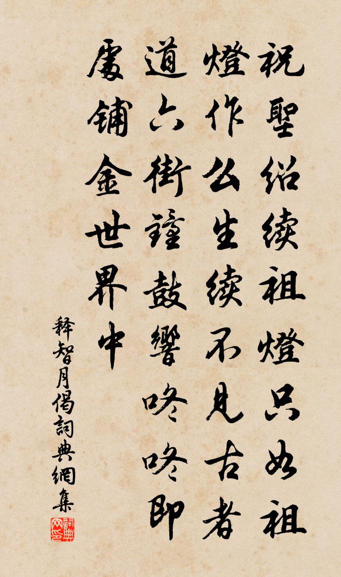 詩詞名句歷史字典書法欣賞書法字典國語詞典說文解字康熙字典古漢語字典標 題 作 者 詩 句 偈作者:釋智月 朝代:宋代偈原文祝聖紹,續祖燈,只如祖燈作么生。續不見古者道,六街鐘鼓響咚咚,即處鋪金世界中。詩詞問答問:偈的作者是誰?答:釋智月問:偈寫於哪個朝代?答:宋代釋智月偈書法欣賞偈書法作品詩詞推薦伯山因其侄來惠書報以二絕趙蕃〔宋代〕蕙畝蘭開梅吐枝,近來凡有幾篇詩。已令經紀江頭竹,早晚為君修短籬。蘇才翁與予定林下之約今被命提點湖南刑獄恐韓維〔宋代〕軒冕予已輕,山水君所欒。相逢說高興,南望欲奔趠。今君被國恩,明刑弼予教。群公許風棱,列郡瞻氣貌。朝廷早行司馬光〔宋代〕寒犬吠柴門,荒雞鳴遠村。河聲空自急,月影不曾渾。木末星猶白,榛中露已繁。客心獨惆悵,四顧與誰言。春詞方岳〔宋代〕花不知愁句又塵,晚寒獨自倚欄頻。一分心事一分雨,春負予耶予負春。送閻紫微歸蜀喻良能〔宋代〕曲江分袂十年中,一笑相逢楚水東。西掖判花知思涌,南牆喔竹坐詩窮。秋風但覺艅艎駛,晝繡何妨畫戟雄。道過鸚鵡曲 農夫渴雨馮子振〔元代〕年年牛背扶犁住。近日最懊惱殺農父。稻苗肥恰待抽花,渴煞青天雷雨。恨殘霞不近人情,截斷玉虹南去。望人間冬至釋慧空〔宋代〕冬後一陽生,東君曾未睹。百草總不知,梅花先漏泄。鐘聲出遠林,雁陣橫殘月。更擬問如何,弄巧翻成拙。虞美人管鑒〔宋代〕海棠花下春風裡。曾拼千場醉。如今老去謾情多。步繞芳叢無力、奈春何。蜀鄉不遠長安遠。相向空腸斷。不如攜句宋祁〔宋代〕珠簾約住牡丹風。伯夷詩強至〔宋代〕昔紂為不道,毒心無生靈。四海如在鼎,誰能救將烹。周武從天人,戎衣舉仁兵。伯夷獨何為,乃諫不聽行。紂徒清曉行散楊萬里〔宋代〕清曉東園政好嬉,忽然佇立小遲遲。為逢咫尺青松上,無數群鶯政亂啼。海賦木華〔魏晉〕昔在帝媯,臣唐之代,天綱浡潏,為凋為瘵;洪濤瀾汗,萬里無際;長波涾𣵺,迆涎八裔。於是晚春關中黃滔〔唐代〕忍歷通莊出,東風舞酒旗。百花無看處,三月到殘時。游塞聞兵起,還吳值歲飢。定唯荒寺里,坐與噪蟬期。蝶戀花(春殘)趙長卿〔宋代〕綠盡燒痕芳草遍。不暖不寒,切莫辜良宴。罨畫屏風開羽扇。薄羅衫子仙衣練。晚雨小池添水面。戲躍赬鱗,又向此君室方岳〔宋代〕曲士多在今,節士多從古。此君豈易得,僅可一二數。代任閬州和人重午二首項安世〔宋代〕游龍蹴浪錦江高,節物驚人感二毛。京洛承平真富貴,江湖風物歡蕭騷。荃蕪有恨流千古,駑驥當年共一槽。聖處送道士於千齡游南嶽崔塗〔唐代〕物外與誰期,人間又別離。四方多事日,高岳獨游時。猿狖瀟湘樹,煙波屈宋祠。無因陪此去,空惜鬢將衰。淳熙元年端午帖子詞皇帝合六首崔敦詩〔宋代〕御柳垂波綠,宮槐覆幄涼。香風隨步輦,偏到殿中央。胡夫人輓詩周麟之〔宋代〕舊倚韓康伯,高堂坐累茵。曩先歸厚夜,今又失靈椿。族黨各車會,階庭五鼎陳。季能當大事,無負玉堂人。浮梁范成大〔宋代〕大灘石如林,小灘石如櫱。微生拋擲過,兩槳砉將割。一灘復一灘,食頃經七八。崎嶇幸脫免,已足凋鬢髮。我家名句推薦治國猶如栽樹,本根不搖,則枝葉茂榮。吳兢《貞觀政要·卷一·論政體》 小荷才露尖尖角,早有蜻蜓立上頭。楊萬里《小池》 紅橋路,正一派、畫船蕭鼓中流住。納蘭性德《摸魚兒·午日雨眺》 夫治身與治國,一理之術也。呂不韋《呂氏春秋·覽·審分覽》 千層石樹遙行路,一帶山田放水聲。姚鼐《山行·布穀飛飛勸早耕》 一壺酒,一竿身,快活如儂有幾人。李煜《漁父·浪花有意千里雪》 漫江碧透,百舸爭流。 * 《沁園春·長沙》 鳥向平蕪遠近,人隨流水東西。劉長卿《謫仙怨·晴川落日初低》 野老念牧童,倚杖候荊扉。王維《渭川田家》 處大無患者恆多慢,處小有憂者恆思善陳壽《三國志·蜀書·杜周杜許孟來尹李譙郤傳》