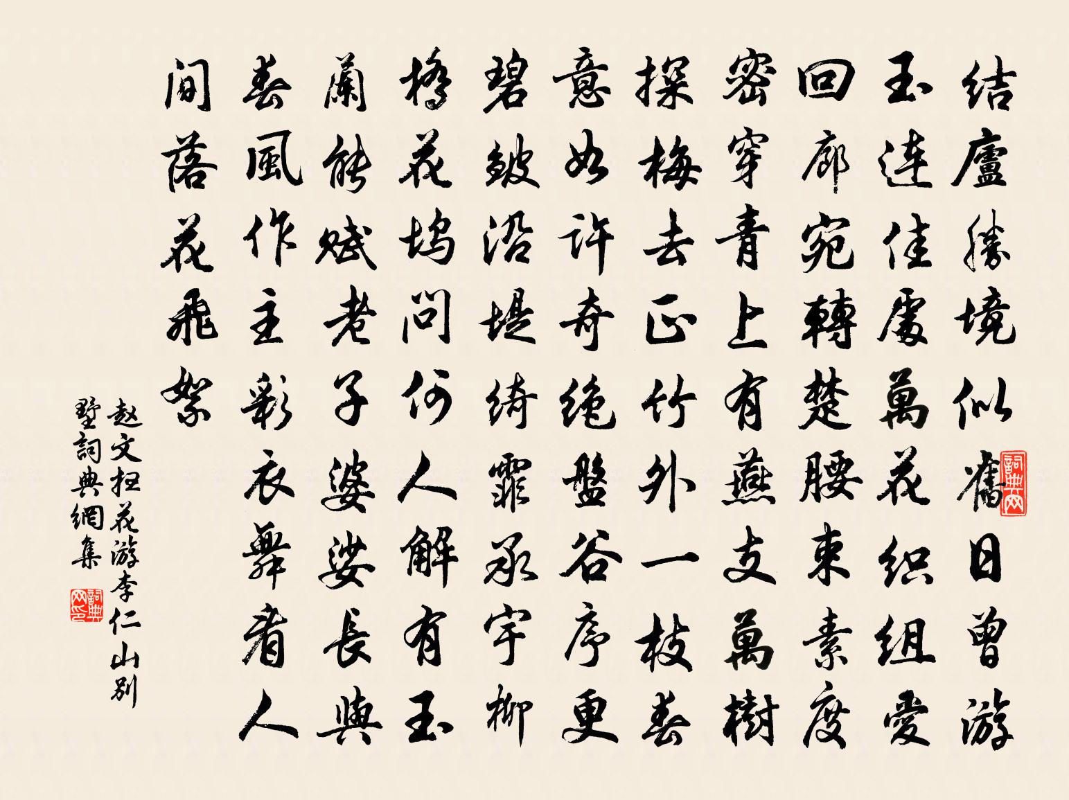 詩詞名句歷史字典書法欣賞書法字典國語詞典說文解字康熙字典古漢語字典標 題 作 者 詩 句 掃花游(李仁山別墅)作者:趙文 朝代:宋代掃花游(李仁山別墅)原文結廬勝境,似舊日曾游,玉連佳處。萬花織組。愛迴廊宛轉,楚腰束素。度密穿青,上有燕支萬樹。探梅去。正竹外一枝,春意如許。奇絕盤谷序。更碧皺沿堤,綺霏承宇。柳橋花塢。問何人解有,玉蘭能賦。老子婆娑,長與春風作主。彩衣舞。看人間、落花飛絮。詩詞問答問:掃花游(李仁山別墅)的作者是誰?答:趙文問:掃花游(李仁山別墅)寫於哪個朝代?答:宋代趙文掃花游(李仁山別墅)書法欣賞掃花游(李仁山別墅)書法作品詩詞推薦仲夏細雨曾幾〔宋代〕霢霂無人見,芭蕉報客聞。潤能添硯滴,細欲亂爐薰。竹樹驚秋半,衾裯愜夜分。何當一傾倒,趁取未歸雲。登總持寺閣張九齡〔唐代〕香閣起崔嵬,高高沙版開。攀躋千仞上,紛詭萬形來。草間商君陌,雲重漢後台。山從函谷斷,川向斗城回。林里由西嶺行後洞山路張栻〔宋代〕西嶺更西路,雲嵐最窈深。水流千澗底,樹合四時陰。幽絕無僧住,閒來有客吟。山行三十里,鐘磬忽傳音。上元田太靖〔宋代〕元宵燈火照樓台,車馬駢駢去又來。田郎試向樓上望,燈前好個阿孩孩。題趙睎遠二畫樓鑰〔宋代〕藻翻數尾已如生,妙絕魚兒作隊行。不是深知濠上趣,未應筆底得縱橫。涪州汪元量〔宋代〕曉立驗檣烏,時聞鳥獸呼。斯須風力健,遮莫水程迂。赤岩石稠疊,白鹽山獨孤。眼前猶有險,不盡更危途。懷向古仇遠〔宋代〕曾同野灶煮溪魚,別鶴歸遲信息疏。不是山中無楮葉,尋常嬾寄入城書。句張窈窕〔唐代〕滿院花飛人不到,含 * 語燕雙雙。木蘭花慢周密〔宋代〕疏鐘敲暝色,正遠樹、綠愔愔。看渡水僧歸,投林鳥聚,煙冷秋屏。孤雲。漸沈雁影,尚殘簫、倦鼓別遊人。宮柳辛未七夕李商隱〔唐代〕恐是仙家好別離,故教迢遞作佳期。由來碧落銀河畔,可要金風玉露時。清漏漸移相望久,微雲未接過來遲。豈能清明楊公遠〔宋代〕清明又向客中過,憶著家山事若何。未及掃松徒悵恨,偶因得句漫吟喔。六旬身切憂懷少,九十春光陰雨多。對景折桂令·七夕贈歌者喬吉〔元代〕崔徽休寫丹青,雨弱雲嬌,水秀山明。箸點歌唇,蔥枝縴手,好個卿卿。水灑不著春妝整整,風吹的倒玉立亭亭,平望蚊子二十六韻吳融〔唐代〕天下有蚊子,候夜噆人膚。平望有蚊子,白晝來相屠。不避風與雨,群飛出菰蒲。擾擾蔽天黑,雷然隨舢艫。利嘴送王周士赴發運司屬官陳與義〔宋代〕寧食三斗塵,有手不揖無詩人。寧飲三斗酒,有耳不聽無味句。牆東草深蘭發薰,君先夢我我夢君。小窗誦詩燈花讀白樂天讀者論壇集虞儔〔宋代〕說觀白傅一篇詩,長日何須一局碁。字細縱然勞眼力,理長尤是契心期。誇張歌酒渾相似,消遣窮愁亦自知。大節餞高仁卿農丞奉使還北牟巘五〔宋代〕常平舊法最為良,頗記中丞耿壽昌。此意推行在人耳,肯教豐歉制低昂。物化劉克莊〔宋代〕今朝風物甚美,明日陰晴未知。夕陽無回照理,落花有上天時。挽何南坡王柏〔宋代〕刻苦工夫真實心,一言體用已全陳。聖賢斷續三千載,伯仲漸摩八十春。保護斯文勤且讓,作成吾黨敬而親。我來癸丑正月新開東園楊萬里〔宋代〕長恨無錢買好園,好園還在屋東邊。周遭旋辟三三徑,只怕芒鞋卻費錢。秋意胡仲參〔宋代〕梧葉飄殘客夢驚,擁衾危坐到天明。片心除是眉頭識,萬感都從念腳生。江上鱸肥銷旅況,樓前雁過帶邊聲。挑燈名句推薦何日請纓提銳旅,一鞭直渡清河洛。岳飛《滿江紅·登黃鶴樓有感》 應憐屐齒印蒼苔,小扣柴扉久不開。葉紹翁《遊園不值》 深知身在情長在,悵望江頭江水聲。李商隱《暮秋獨游曲江》 五更鼓角聲悲壯,三峽星河影動搖。杜甫《閣夜》 情之所鍾,雖醜不嫌。沈復《浮生六記·閨房記樂》 柳帶搖風漢水濱,平蕪兩岸爭勻。牛希濟《臨江仙·柳帶搖風漢水濱》 菩提本無樹,明鏡亦非台。惠能《菩提偈》 凡德者,以無為集,以無欲成,以不思安,以不用固。韓非及後人《韓非子·解老》 捐軀赴國難,視死忽如歸!曹植《白馬篇》 肥水東流無盡期。當初不合種相思。姜夔《鷓鴣天·元夕有所夢》
