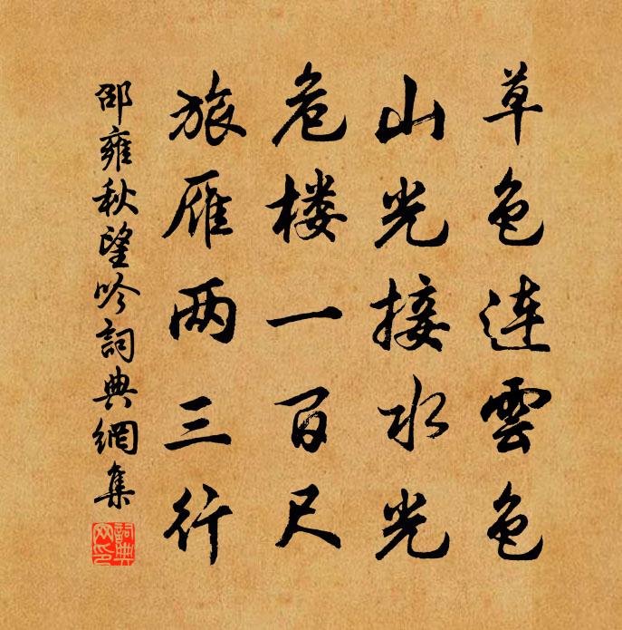 詩詞名句歷史字典書法欣賞書法字典國語詞典說文解字康熙字典古漢語字典標 題 作 者 詩 句 秋望吟作者:邵雍 朝代:宋代秋望吟原文草色連雲色,山光接水光。危樓一百尺,旅雁兩三行。詩詞問答問:秋望吟的作者是誰?答:邵雍問:秋望吟寫於哪個朝代?答:宋代邵雍秋望吟書法欣賞秋望吟書法作品詩詞推薦贈解詩歌人薛能〔唐代〕同有詩情自合親,不須歌調更含嚬。朝天御史非韓壽,莫竊香來帶累人。鄭州孫山〔宋代〕南北更無三座寺,東西只有一條街。四時八節無筵席,半夜三更有界牌。吳音子佚名〔宋代〕欲要神仙做,抱元*,胎息綿綿。一回*滿一回煎。陰陽媾,赤龍蟠。地戶牢封玄門啟,滾丹砂、透入泥丸。崑崙風水洞林逋〔宋代〕平昔常聞風水洞,重山復水去無窮。因緣偶入雲泉路,林下先聞接客鍾。浣溪沙·門隔花深舊夢遊吳文英〔宋代〕門隔花深夢舊遊,夕陽無語燕歸愁。玉纖香動小簾鉤。落絮無聲春墜淚,行雲有影月含羞。東風臨夜冷於秋。賀新郎(春思)劉過〔宋代〕院宇重重掩。醉沈沈、亭陰轉午,繡簾高卷。金鴨香濃噴寶篆,驚起雕梁語燕。正一架、酴醿開遍。嫩萼梢頭舒素漁父歌二首歐陽炯〔唐代〕擺脫塵機上釣船,免教榮辱有流年。無系絆,沒愁煎,須信船中有散仙。風浩寒溪照膽明,小君山上玉蟾生。荷露送游大冶歸建陽王炎〔宋代〕西風來雁歲俗晚,衰柳鳴蟬人語離。市道交遊何足數,君家父子總相知。讀書定要見古人,立事正須年少時。話舊郊廟歌辭。太清宮樂章。再上佚名〔唐代〕仙宗績道,我李承天。慶深虛極,符光象先。俗登仁壽,化闡蟺涓。五千貽範,億萬斯年。梅林即事四首劉應時〔宋代〕竹塢松溪雪半埋,興來無處著吟懷。茅檐盡出橫斜影,寂寞黃昏月上階。十月旦讀子美北風吹瘴癘羸老思散策之句初寮朱翌〔宋代〕戲語隴頭子,與若本等夷。朱紫強包裹,本非我所宜。失腳落番山,杳杳隨風吹。將買二頃田,樹以枳棘籬。還我宮詞王珪〔唐代〕麗日祥煙鎖禁林,櫻桃初熟可成陰。年年翠輦來游幸,花落 * 一寸深。惠安縣齋詠梅陳執中〔宋代〕去年邊上見梅花,醉眼淹留未到家。今日嶺南攀折得,忽驚身又在天涯。又約趙大再游小陽明其山全似峽中點菸一亭可蘇泂〔宋代〕客路心常慰,歸棲氣苦低。經行天柱北,夢想雪峰西。翠壁千岩長,蒼煙半點迷。何當同拄杖,重此聽猿啼。寓寺八首張耒〔宋代〕翠眉長好何曾損,寄語啼禽漫不閒。應為殘春足愁恨,長疑蹙破鏡中山。華山歌劉禹錫〔唐代〕洪壚作高山,元氣鼓其橐。俄然神功就,峻拔在寥廓。靈跡露指爪,殺氣見稜角。凡木不敢生,神仙聿來托。天資棋佚名〔唐代〕野客圍棋坐,支頤向暮秋。不言如守默,設計似平讎。決勝雖關勇,防危亦合憂。看他終一局,白卻少年頭。奉陪韋中丞使君游鶴林寺皇甫曾〔唐代〕古寺傳燈久,層城閉閣閒。香花同法侶,旌旆入深山。寒磬虛空里,孤雲起滅間。謝公憶高臥,徒御欲東還。偈傾一百六十九首釋智朋〔宋代〕寒則普天寒,熱則普天熱。透出寒暑關,何曾離窠窟。賦得春風扇微和陳通方〔唐代〕習習和風扇,悠悠淑氣微。陽升知候改,律應喜春歸。池柳晴初拆,林鶯暖欲飛。川原浮彩翠,台館動光輝。泛艷名句推薦別離在今晨,見爾當何秋。韋應物《送楊氏女》 猿鳥猶疑畏簡書,風雲常為護儲胥。李商隱《籌筆驛》 蘭溪三日桃花雨,半夜鯉魚來上灘。戴叔倫《蘭溪棹歌》 老驥伏櫪,志在千里。曹操《龜雖壽 / 神龜雖壽》 看萬山紅遍,層林盡染;漫江碧透,百舸爭流。 * 《沁園春·長沙》 當斷不斷,反受其亂。司馬遷《史記·齊悼惠王世家》 無端和淚拭胭脂,惹教雙翅垂張泌《蝴蝶兒·蝴蝶兒》 莫道君行早,更有早行人。佚名《增廣賢文·上集》 蟬噪林逾靜,鳥鳴山更幽。王籍《入若耶溪》 平岡細草鳴黃犢,斜日寒林點暮鴉。辛棄疾《鷓鴣天·陌上柔桑破嫩芽》