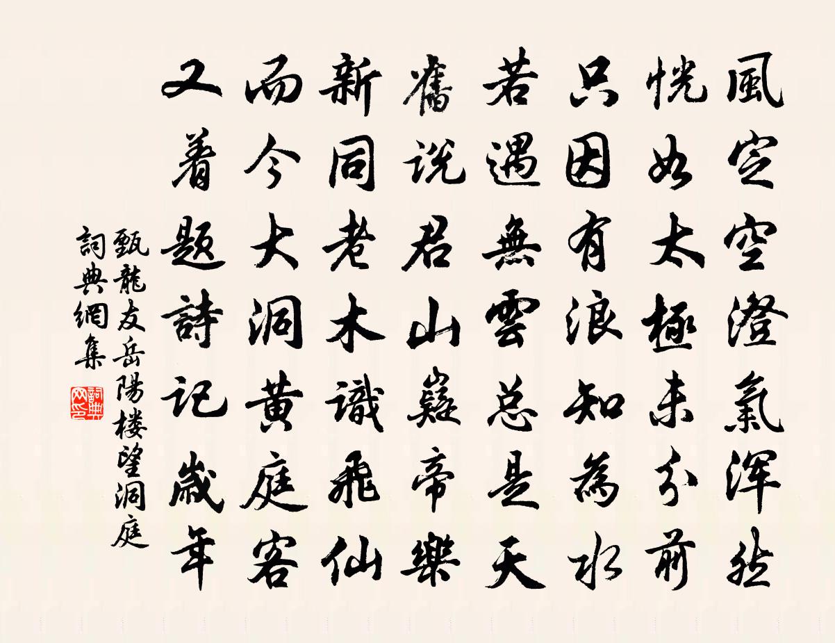 詩詞名句歷史字典書法欣賞書法字典國語詞典說文解字康熙字典古漢語字典標 題 作 者 詩 句 岳陽樓望洞庭作者:甄龍友 朝代:宋代岳陽樓望洞庭原文風定空澄氣渾然,恍如太極未分前。只因有浪知為水,若遇無雲總是天。舊說君山嶷帝樂,新同老木識飛仙。而今大洞黃庭客,又著題詩記歲年。詩詞問答問:岳陽樓望洞庭的作者是誰?答:甄龍友問:岳陽樓望洞庭寫於哪個朝代?答:宋代甄龍友岳陽樓望洞庭書法欣賞岳陽樓望洞庭書法作品詩詞推薦題盱胎軍東南第一山二首楊萬里〔宋代〕建隆家業大於天,慶曆春風一萬年。廊廟謀謨出童蔡,笑談京洛慱幽燕。白溝舊在鴻溝外,易水今移淮水前。川後朝中措(和孔倅·郡齋新栽竹)王之道〔宋代〕君心節直更心虛。移植並庭除。好在紅蕖相映,捲簾如見吳姝。清風明月,君無我棄,我不君疏。況有騷人墨客,臨江仙 與客湖上飲歸葉夢得〔宋代〕不見跳魚翻曲港,湖邊特地經過。蕭蕭疏雨亂風荷。微雲吹散,涼月墜平波。白酒一杯還徑醉,歸來散發婆娑。無獨坐絕句二首陸游〔宋代〕蛙鳴乃是怒,鵩嘯固非妖。獨宿空山夜,何妨伴寂寥。八月二十日與館中同舍游西湖作葛立方〔宋代〕繫舟孤山腳,曳杖聊意行。三賢已仙去,丹青儼南榮。由來作詩苦,鼎峙太瘦生。碑板摘奇艷,銀鉤出金聲。湖山方山有求轉語之作並用韻二章杜范〔宋代〕四時冬復春,造化一機會。朔風空草木,余卉猶病醉。梅花於其間,居殿復居最。三春在何許,不右粉須外。我嘗戲元弼陳師道〔宋代〕翩翩別去七經年,特特歸來兩浩然。東道有時推謝令,後堂無地著彭宣。奉和陸使君長源水堂納涼效曹劉體皎然〔唐代〕柳家陶暑亭,意遠不可齊。煩襟盪朱弦,高步援綠荑。愛公滿渟客,來是清風攜。瀅渟前溪上,曠望古郡西。六月送李能李新〔宋代〕擷蕙仙人洲,日下舞雩歸。晴光闊天宇,羃羃祥煙飛。旦起修羊酒,來觀石麟兒。刮眼玉骨異,無用金絡羈。長楊同諸友山行分袂言別五首程公許〔宋代〕共蠟登山屐,俄尋下水船。到家人怪問,滿袖挾風煙。武帝徐鈞〔宋代〕東南離析僅遺餘,枉受污名僭帝名。輸卻當年曹馬巧,不先受禪且驅除。釣台陳宓〔宋代〕雲台貂冕成堆土,釣瀨羊裘照九秋。認得南柯不回音,清名萬古尚流溪。六月六日小集二首楊萬里〔宋代〕青李來禽已眼明,新瓜入夏見何曾。酒邊忘卻人間暑,消盡金盆一文冰。江城子 和韻姜中丞,兼寄趙侍御明叔張之翰〔元代〕黃金台下識行驂。著朝衫。宦情酣。不料維揚,留住老曹參。舊說長江千里外,今只在,小樓南。金焦倒影碧潭潭廖仙岩吳世范〔宋代〕治民因得道,浮世學應難。自是神仙骨,非乾龍虎丹。松篁排洞罅,樓閣倚雲端。此日朝真去,慚為五品官。晚梅高安齋〔宋代〕買得街頭最晚梅,瀟瀟風雨對吟杯。莫嫌吟蕊能稀少,不學春光爛熳開。固城范成大〔宋代〕柳棬涼罐汲泉遙,味苦仍鹹似海潮。卻憶徑山龍井水,一杯洗眼洞層霄。寄釋子良史酒韋應物〔唐代〕秋山僧冷病,聊寄三五杯。應瀉山瓢里,還寄此瓢來。冬日陸游〔宋代〕短景匆匆過,新寒亹亹來。客游聊戲耳,世事亦悠哉!綠動連村麥,香吹到處梅。錦城花柳窟,歸去看春回。清水驛叢竹天水趙雲余手種一十二莖柳宗元〔唐代〕檐下疏篁十二莖,襄陽從事寄幽情。只應更使伶倫見,寫盡雌雄雙鳳鳴。名句推薦記玉關踏雪事清游,寒氣脆貂裘。張炎《八聲甘州·記玉關踏雪事清游》 月去疏簾才數尺,烏鵲驚飛,一片傷心白。宋琬《蝶戀花·旅月懷人》 此心隨去馬,迢遞過千峰。方乾《送從兄郜 / 韋郜 / 途中別孫璐》 孤客傷逝湍,徒旅苦奔峭。謝靈運《七里瀨》 過橋分野色,移石動雲根。賈島《題李凝幽居》 垂楊拂綠水,搖艷東風年。李白《折楊柳》 烏啼隱楊花,君醉留妾家。李白《楊叛兒》 湘西一杯酒,渺渺紅葉換。趙蕃《次韻酬吳德夫去秋送行之作》 燕雁無心,太湖西畔隨雲去。姜夔《點絳唇·丁未冬過吳松作》 使能,國之利也。左丘明《左傳·文公·文公六年》
