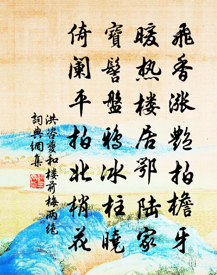 詩詞名句歷史字典書法欣賞書法字典國語詞典說文解字康熙字典古漢語字典標 題 作 者 詩 句 和樓前梅兩絕作者:洪咨夔 朝代:宋代和樓前梅兩絕原文飛香漲艷拍檐牙,暖熱樓居鄂陸家。寶髻盤鴉冰柱曉,倚闌平拍北梢花。詩詞問答問:和樓前梅兩絕的作者是誰?答:洪咨夔問:和樓前梅兩絕寫於哪個朝代?答:宋代洪咨夔和樓前梅兩絕書法欣賞和樓前梅兩絕書法作品詩詞推薦出郊再用韻賦三解吳潛〔宋代〕山朋水友訊頻收,怪我明農事轉悠。南墅麋猿專一壑,東溪島鶩據三洲。人閒顛倒舟移夜,客里淒涼坐閱秋。六十重九登滁城樓憶前歲九日歸灃上赴崔都水及諸…悽然懷舊韋應物〔唐代〕今日重九宴,去歲在京師。聊回出省步,一赴郊園期。嘉節始雲邁,周辰已及茲。秋山滿清景,當賞屬乖離。凋散秋夜聞笛薩都剌〔元代〕何人吹笛秋風外,北固山前月色寒。亦有江南未歸客,徘徊終夜倚闌乾。花降圖唐寅〔明代〕滿樹天香書掩門,無端春意褪紅焜。恩情只在牙床上,閒剎香閨兩繡墩。高齋韓東尉用前韻見寄次韻謝楊公遠〔宋代〕世間名利我無緣,飽看黃花又一年。鬢有幾識根帶雪,心無一事可欺天。築居易辦觀梅閣,取醉難謀種秫田。欲謁木蘭花慢 代人作劉敏中〔元代〕渺雲間天淡,離別意、一消魂。憶金縷珠喉,冰弦玉筍,明月幽人。風流舊家心事,指南山、松柏托殷勤。菸草夕梁楚祠孫元晏〔唐代〕曾與蕭侯醉玉杯,此時神影盡傾頹。莫雲千古無靈聖,也向西川助敵來。好事近(賦茉莉)姜夔〔宋代〕涼夜摘花鈿,苒苒動搖雲綠。金絡一團香露,正紗廚人獨。朝來碧縷放長穿,釵頭掛層玉。記得如今時候,正荔枝早春鄭剛中〔宋代〕雨過花梢些子濕,曉來窗下霎時寒。江鄉此際春猶靳,長是疏梅帶雪看。自贊釋大觀〔宋代〕是境不涉,逢緣不借。惡人隨順,喜人凌跨。撥千聖剩語為畫處山川,笑從上發機如巾結兔馬。絲糝弗容留,虛空竹張耒〔宋代〕自吾居山中,默默無與歡。朝晡誰相對,賴此青琅玕。堂東一畝池,遠分西澗泉。蕭蕭一萬竿,結根護池壖。婉婉琴曲歌辭別鶴張籍〔唐代〕雙鶴出雲溪溪,分飛各自迷。空巢在松杪,折羽落江泥。尋水終不飲,逢林亦未棲。別離應易老,萬里兩淒淒。七言十二句贈駕部吳郎中七兄白居易〔唐代〕四月天氣和且清,綠槐陰合沙堤平。獨騎善馬銜鐙穩,初著單衣肢體輕。退朝下直少徒侶,歸舍閉門無送迎。風生葉濤致遠見和二詩複次其韻(濤顛倒元韻。)蘇軾〔宋代〕平生無一女,誰復嘆耳耳。滯留生此兒,足慰周南史。那知非真實,造物聊戲爾。煩惱初無根,恩愛為種子。煩公倚樓胡仲弓〔宋代〕樓高天一握,山入白雲根。寺在牛鳴地,人行犬吠村。晴窗薰野馬,寒木下孤猿。吟罷月初上,詩僧來扣門。冠丁謂〔宋代〕盛禮尊元服,嘉名重進賢。窮奢譏鵔鵲,極品貴貂蟬。就列峨章甫,瞻顏仰邃延。誰知遠遊制,寵錫自高天。淥波亭向傳式〔宋代〕我愛東南郡,恩容守會稽。府當秦望北,園枕臥龍西。水為流觴引,亭因正俗題。松篁清有韻,桃李密成蹊。一沼擬古九首陶淵明〔魏晉〕榮榮窗下蘭,密密堂前柳。初與君別時,不謂行當久。出門萬里客,中道逢嘉友。未言心相醉,不在接杯酒。蘭枯七夕陳普〔宋代〕但把凡身小品論,不須榻頞問星辰。女郎戀別淚如雨,遑托金針度與人。菊殘有感趙蕃〔宋代〕病骨支寒政覺難,莫驚蒲柳望秋殘。淒涼不但嘆荒菊,寂寞更堪傷敗蘭。有鬢已霜那得制,無英可落若為餐。玉山名句推薦事親孝,與士信,臨財廉,取予義,分別有讓,恭儉下人,常思奮不顧身以徇國家之急。班固《漢書·傳·司馬遷傳》 居高位者易驕,處佚樂者易侈。張廷玉《明史·列傳·卷二十四》 砌下落花風起,羅衣特地春寒。馮延巳《清平樂·雨晴煙晚》 舉頭紅日白雲低,四海五湖皆一望。唐寅《伯虎扮乞兒,作詩騙酒》 沉舟側畔千帆過,病樹前頭萬木春。劉禹錫《酬樂天揚州初逢席上見贈》 胡風吹代馬,北擁魯陽關。李白《豫章行》 寵辱不驚,肝木自寧陳繼儒《小窗幽記·集靈篇》 羊腸白道穿雲出,雁齒紅橋亞水低。許德溥《西橋柳色》 他鄉生白髮,舊國見青山。司空曙《賊平後送人北歸》 一葉度春風,芳芳自相接。蕭衍《芳樹》