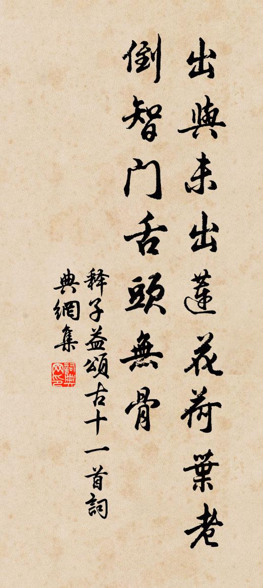 詩詞名句歷史字典書法欣賞書法字典國語詞典說文解字康熙字典古漢語字典標 題 作 者 詩 句 頌古十一首作者:釋子益 朝代:宋代頌古十一首原文出與未出,蓮花荷葉。老倒智門,舌頭無骨。詩詞問答問:頌古十一首的作者是誰?答:釋子益問:頌古十一首寫於哪個朝代?答:宋代釋子益頌古十一首書法欣賞頌古十一首書法作品詩詞推薦簡道安葛天民〔宋代〕相將除夜南風起,雁已聲聲向北飛。驟暖定知為雪骨,瘦年終不似冬肥。日來病可方開酒,節下春回稍減衣。正好雪後月夜登樓顧逢〔宋代〕雪屋凝寒凍不流,碧天如水似中秋。一樓月色無人共,聽盡鐘聲未下樓。次韻王將仕二首白玉蟾〔宋代〕白霧重重山復山,山光樹色有無間。是中紫翠皆詩料,病起無聊著句難。風雨宿江上高士談〔元代〕風雨蕭蕭作暮寒,半晴煙靄有無間。殘紅一抹沉天日,濕翠千重隔岸山。短髮不羞黃葉亂,寸心長羨白鷗閒。濤聲岐亭五首蘇軾〔宋代〕昨日雲陰重,東風融雪汁。遠林草木暗,近舍煙火濕。下有隱君子,嘯歌方自得。知我犯寒來,呼熊意頗急。撫掌僧窗薛能〔唐代〕不悟時機滯有餘,近來為事更乖疏。朱輪皂蓋蹉跎盡,猶愛明窗好讀書。孤客釋文珦〔宋代〕眾人皆汲汲,孤管自俞俞。方外居來久,囊中物盡無。行將筇作伴,講以石為徒。若問何宗旨,飢來飯一盂。豐乾寒拾贊釋心月〔宋代〕雙磵底,五峰前。塊石上,磨松煙。多無一兩字,少有三百篇,明明此意落誰邊。善頌堂袁說友〔宋代〕家法傳忠孝,朝英仰正平。抗詞嚴廟制,勇去樂親榮。一室從新扁,群公詠落成。清風天籟靜,斜日雪山橫。養志後省紫薇花任希夷〔宋代〕清曉開軒俯鳳池,小山經雨石增輝。琉璃葉底珊瑚乾,立出池邊是紫薇。贈李端履馬光祖〔宋代〕辦得錢來直是難,錢錢要使及煢鰥。莫教散入他人手,減百抽分或細奸。寄文叔且問畏知近訊五首趙蕃〔宋代〕醉里揮毫君不嗔,平生嗜酒見天真。離觴曾為黃花滿,別日行看梅又新。米元章臨謝安八月帖贊岳珂〔宋代〕八月一帖,無為寶晉之刻,則其初也。兵毀而後重取而鐫,遺其精而得其粗也。京口供軍之碑,紹興所傳,芾之書和鮮于大受崇先觀餞別曾元中陳師道〔宋代〕此別未為遠,兩都東西州。情親有乖隔,江湖成阻修。脫塵度翠密,徐行當尋幽。各有惜別懷,共此一日留。意合挽師步理牟巘五〔宋代〕已飽憂患味,方收翰墨動。龍飛新進士,猿臂老將軍。千里推車軸,群工愧斧斤。天乎如有意,更為續斯文。句釋惠崇〔宋代〕殘月楚山曉,孤煙江廟春。李員外秦援宅觀妓沈佺期〔唐代〕盈盈粉署郎,五日宴春光。選客虛前館,徵聲遍後堂。玉釵翠羽飾,羅袖鬱金香。拂黛隨時廣,挑鬟出意長。囀歌宋城宰韓秉文惠日鑄茶蘇轍〔宋代〕君家日鑄山前住,冬後茶芽麥粒粗。磨轉春雷飛白雪,甌傾錫水散凝酥。溪山去眼塵生面,簿領埋頭汗匝膚。一啜狂吟劉克莊〔宋代〕兩輪屋角走如棱,爭奈樗翁老病何。富貴時來年少去,神仙者少死人多。形羸全賴兒扶掖,詩退猶須友切磋。莫嗟新渡寺送任仲微蘇軾〔宋代〕春陰欲落雪,野氣方升雲。我游清潁尾,想見翠被君。古來聚散地,與子復言分。倦遊安稅駕,瘦田失歸耘。獨宿名句推薦果仁者,人多畏,言不諱,色不媚。李毓秀《弟子規·親仁》 無人信高潔,誰為表予心?駱賓王《詠蟬 / 在獄詠蟬》 客子光陰詩卷里,杏花訊息雨聲中。陳與義《懷天經智老因訪之》 獨倚闌乾凝望遠。一川菸草平如剪。謝逸《蝶戀花·豆蔻梢頭春色淺》 對秋深,離恨苦,數夜滿庭風雨。孫光憲《更漏子·對秋深》 灼灼野花香,依依金柳黃。佚名《菩薩蠻·霏霏點點回塘雨》 清水出芙蓉,天然去雕飾。李白《經亂離後天恩流夜郎憶舊遊書懷贈江夏韋太守良宰》 凌余陣兮躐余行,左驂殪兮右刃傷。屈原《國殤》 世業事黃老,妙年孤隱淪宋之問《始安秋日》 三極彝訓,訓深稽古。致化歸一,分教斯五。劉勰《文心雕龍·宗經》
