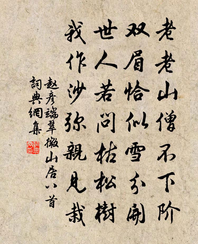 詩詞名句歷史字典書法欣賞書法字典國語詞典說文解字康熙字典古漢語字典標 題 作 者 詩 句 翠微山居八首作者:趙彥端 朝代:宋代翠微山居八首原文老老山僧不下階,雙眉恰似雪分開。世人若問枯松樹,我作沙彌親見栽。詩詞問答問:翠微山居八首的作者是誰?答:趙彥端問:翠微山居八首寫於哪個朝代?答:宋代趙彥端翠微山居八首書法欣賞翠微山居八首書法作品詩詞推薦得片石著歲寒欄乾外二首錢時〔宋代〕梅竹交陰晚更奇,等閒片石亦相宜。此時亭上瀟瀟雨,牆外行人卻未知。春日宴樂遊園賦韻得接字王勃〔唐代〕帝里寒光盡,神皋春望浹。梅郊落晚英,柳甸驚初葉。流水抽奇弄,崩雲灑芳牒。清尊湛不空,暫喜平生接。雨中即事晁說之〔宋代〕寥寥茲夏晚,秋韻已蕭然。風雨疏籬外,詩書曲幾前。道心勤自厲,愁緒每相牽。秦樹連烽火,吳鞋落海瓀。不能搗衣曲張玉孃〔宋代〕入夜玷聲滿四婁,一天霜月秋雲輕。自煌歲歲衣裁就,欲寄無因到遠人。月泉周仲卿〔宋代〕石罅玉為髓,月梭金作棱。蒼苔誰鑿破,白雪自堅凝。穿豈太山霤,清於萬壑冰。此中無六月,門外氣如蒸。謝人惠琴材謝邈〔唐代〕風撼桐絲帶月明,羽人乘醉截秋聲。七弦妙制饒仙品,三尺良材稱道情。池小未開春浪泛,岳低猶欠暮雲生。何因玉樓春高觀國〔宋代〕多時不踏章台路。依舊東風芳草渡。鶯聲喚起水邊情,日影炙開花上霧。謝娘不信佳期誤。認得馬嘶迎繡戶。今宵三登樂陳三聘〔宋代〕注望曉山,晴色麗、晨餐應飽。縠紋平、漲天渺渺。倚藤枝、撐艇子,昔游曾到。江山自古,水雲轉好。悵年來、艷聲歌(太平時七首)賀鑄〔宋代〕蜀錦塵香生襪羅。小婆娑。個儂無賴動人多。是橫波。樓角雲開風卷幕,月侵河。纖纖持酒艷聲歌。奈情何。小重山(吳鬆浮天閣送別)蔡伸〔宋代〕樓外江山展翠屏。沈沈虹影畔,彩舟橫。一尊別酒為君傾。留不住,風色太無情。斜日半山明。畫欄重倚處,獨銷壽成惠聖慈佑太皇太后合端午帖子衛涇〔宋代〕人間無處避炎蒸,身在瑤台最上層。學士大書金字帖,宮中巧篆降綃繒。遇雨放朝余至掖門方審戲呈同舍宋庠〔宋代〕詔恩蠲謁靜朝扉,掀淖都街獨未知。同舍恣成莊蝶夢,可憐臣朔忍朝飢。望建康諸山孫應時〔宋代〕白沙城上望金陵,滿眼風菸草樹青。山色千年圍故國,江流萬里赴滄溟。驚心採石瓜洲渡,搔首長乾白下亭。一笑好事近王炎〔宋代〕時節近元宵,天意人情都好。煙柳露桃枝上,覺今年春早。遏雲一曲鳳將雛,疑是在蓬島。玉筍扶杯瀲灩,願黑頭九日張蘊〔宋代〕細看黃花把一枝,東籬猶是昔人非。題糕酒外豪心在,吹帽風前素髮稀。雁叫霜天悲故國,鴉翻溪樹背寒暉。百年頭陀僧陸龜蒙〔唐代〕萬峰圍繞一峰深,向此長修苦行心。自掃雪中歸鹿跡,天明恐被獵人尋。與生公游石窟山張九齡〔唐代〕探秘孰雲遠,忘懷復爾同。日尋高深意,宛是神仙中。躋險構靈室,詭制非人功。潛洞黝無底,殊庭忽似夢。豈如題謝昌國桂山堂楊萬里〔宋代〕艮齋印袖出名光,歸臥西江一草堂。種滿山中渾是桂,怪來月窟更無香。九秋金粟供朝飯,三徑黃花並夕糧。履上吳宮石張詠〔宋代〕何人移置向何年,牢落空庭見斷頑。竹外松間滋澹竚,土昏苔染更斕斑。貪憐翫月名偏好,莫問朝天信不還。閒醉賀新郎 題錢楞仙同年玉堂歸娶圖二首曾國藩〔清代〕寂寞深閨里。憶東風,泥金乍報,若何歡喜?撤帳筵圍停燭夜,細問當時原委。更密詢燒香詩婢。西舍東鄰多士女名句推薦人不見,春在綠蕪中。祖可《小重山·誰向江頭遺恨濃》 雁濕行無次,花沾色更鮮。李世民《詠雨》 民非谷不生。陳壽《三國志·吳書·吳主傳》 善政得民財,善教得民心。孟子《孟子·盡心章句上·第十四節》 仁人之於弟也,不藏怒焉,不宿怨焉,親愛之而已矣。孟子《孟子·萬章章句上·第三節》 遊人日暮相將去,醒醉喧譁。歐陽修《採桑子·清明上巳西湖好》 福在積善,禍在積惡。黃石公《素書·安禮》 一條藤徑綠,萬點雪峰晴。李白《冬日歸舊山》 立身成敗,在於所染吳兢《貞觀政要·卷十·論慎終》 天涯也有江南信。梅破知春近。黃庭堅《虞美人·宜州見梅作》