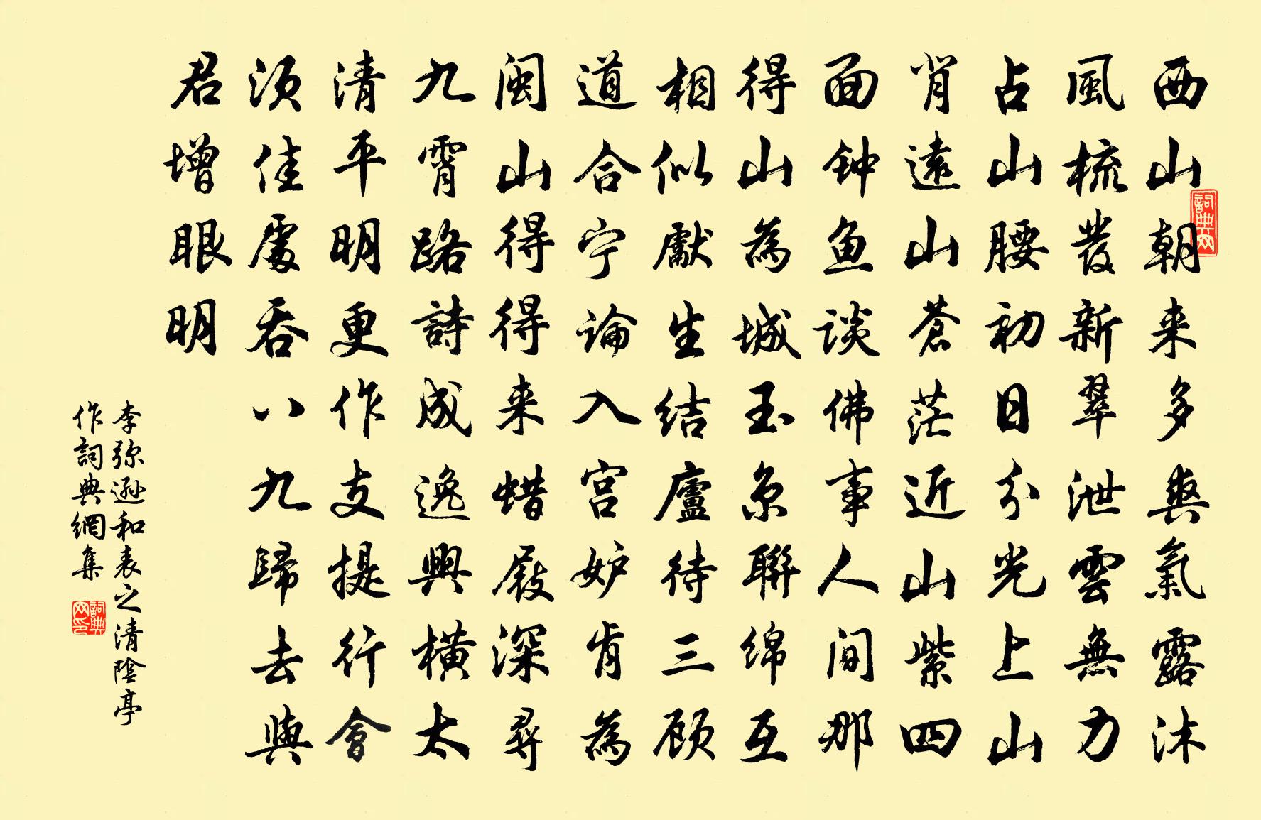 詩詞名句歷史字典書法欣賞書法字典國語詞典說文解字康熙字典古漢語字典標 題 作 者 詩 句 和表之清陰亭作作者:李彌遜 朝代:宋代和表之清陰亭作原文西山朝來多爽氣,露沐風梳發新翠。泄雲無力占山腰,初日分光上山背。遠山蒼茫近山紫,四面鐘魚談佛事,人間那得山為城,玉京聯綿互相似。先生結廬待三顧,道合寧論入宮妒。肯為閩山得得來,蠟屐深尋九霄路。詩成逸興橫太清,平明更作支提行。會須佳處吞八1|1九,歸去與君增眼明。詩詞問答問:和表之清陰亭作的作者是誰?答:李彌遜問:和表之清陰亭作寫於哪個朝代?答:宋代李彌遜和表之清陰亭作書法欣賞和表之清陰亭作書法作品詩詞推薦和田仲宣見贈蘇軾〔宋代〕頭白江南醉司馬,寬心時復喚殷兄。寒潮不應淮無信,客路相隨月有情。未許低頭拜東野,徒言共飲勝公榮。好詩重送鄭宥歸蜀因寄何兆李端〔唐代〕黃花西上路何如,青壁連天雁亦疏。為報長卿休滌器,漢家思見茂陵書。壽公禪老游冥何昌弼〔宋代〕不學參禪不學文,百年么樂任天真。曾聞神定逾三日,疑是今生再世人。登繞花台二首何澹〔宋代〕詩翁當日上凌風,面面看花得句工。我亦巡檐來索笑,古今人意略相同。春耕陸游〔宋代〕今年液水滿西疇,父老人人卜有秋。只要耕犁及時節,裹茶買餅去租牛。寄茅山道友三絕周文璞〔宋代〕九錫碑亭日欲曛,有人趺坐對爐薰。憑誰傳語桓司馬,句曲山中只白雲。蝶戀花 正月十一日 以上二首見白雲文集卷四許謙〔元代〕楊柳池塘春信早。簾卷東風,猶帶餘寒峭。暖透博山紅霧繞。洞簫扶起歌聲杳。初試花冠金凰小。鬢亂釵橫,長怯三舍人題名於後省皆賦詩因寄呈劉貢父孔武仲〔宋代〕西垣寂寞今已久,三賢文章鳳池手。朝來不復巒山中,後至儻誰居客右。華堂刻石映今古,秀句連章動星斗。鴒原窮冬積陰曾豐〔宋代〕將雨未成雨,久霜無復霜。青天方變色,白日且韜光。乘勢群陰逞,歸根萬物亡。猶余南過雁,歲晚客他鄉。郡圃杏花二首楊萬里〔宋代〕小樹嫣然一兩枝,晴醇雨醉忽相宜。絕憐欲白仍紅處,政是微開半吐時。得幸東風無與對,主張春色郠還誰。海棠黃鶴洞中仙 繼重陽韻馬鈺〔元代〕大悟明明也。大智閒閒也。大道行行應自然,風風馬。永永逍遙也。大水高高也。大火炎炎也。大藥輝輝晃寶瓶。別崔少府高適〔唐代〕知君少得意,汶上掩柴扉。寒食仍留火,春風未授衣。皆言黃綬屈,早向青雲飛。借問他鄉事,今年歸不歸。和兩山二首仇遠〔宋代〕窮鄉何處覓新豐,身世悠悠醉夢中。未學伏波屍馬革,且隨甫里問龜蒙。檐頭喜有桑榆日,兵後那無草木風。亦欲既為誼夫賦墳廬詩乃蒙和韻再成十首為謝兼簡郭印〔宋代〕秋螢腐草化,芝菌出枯朽。形質但變遷,中有一物久。喜郭希范上自癢歸胡仲參〔宋代〕馬蹄明日是君家,千里歸來傍節華。幾夜深閨寒寂寂,有人和淚卜燈花。寓江州分司衙隨筆五首董嗣杲〔宋代〕前憂將盡捐,後慮方覺夥。舉動必有礙,側近類鱉跛。但知就酸吟,不悔為計左。秋令向老去,甘困樊籠鎖。愁境鷓鴣天陳三聘〔宋代〕昨夜東風怒不成。曉來猶自掃殘英。半酸梅子連枝重,無力楊花到地輕。情易感,涕先零。玉虬香冷更淒清。事如送蘇州姚長史韓翃〔唐代〕江城驛路長,煙樹過雲陽。舟領青絲纜,人歌白玉郎。葛衣行柳翠,花簟宿荷香。別有心期處,湖光滿訟堂。寄河上段十六(一作王維詩)盧象〔唐代〕與君相識即相親,聞道君家住孟津。為見行舟試借問,客中時有洛陽人。送台州沈虞卿使君入朝孫應時〔宋代〕鼓聲霜曉寒,冠蓋滿街路。詔書日邊到,使君朝天去。攀車願公留,稚耋紛無數。信哉慈父母,赤子中心慕。七州名句推薦征馬分飛日漸斜,見此空為人所嗟。孟浩然《高陽池送朱二》 少壯不努力,老大徒傷悲!佚名《長歌行》 離堂思琴瑟,別路繞山川。陳子昂《春夜別友人二首·其一》 歸來報名主,恢復舊神州。岳飛《送紫岩張先生北伐》 一張一弛,文武之道戴聖《禮記·雜記下》 綠杯紅袖趁重陽。人情似故鄉。晏幾道《阮郎歸·天邊金掌露成霜》 無言獨上西樓,月如鉤。李煜《相見歡·無言獨上西樓》 不痴不聾,不作家翁。司馬光《資治通鑑·唐紀四十》 湘西一杯酒,渺渺紅葉換。趙蕃《次韻酬吳德夫去秋送行之作》 盛年不重來,一日難再晨。陶淵明《雜詩·人生無根蒂》