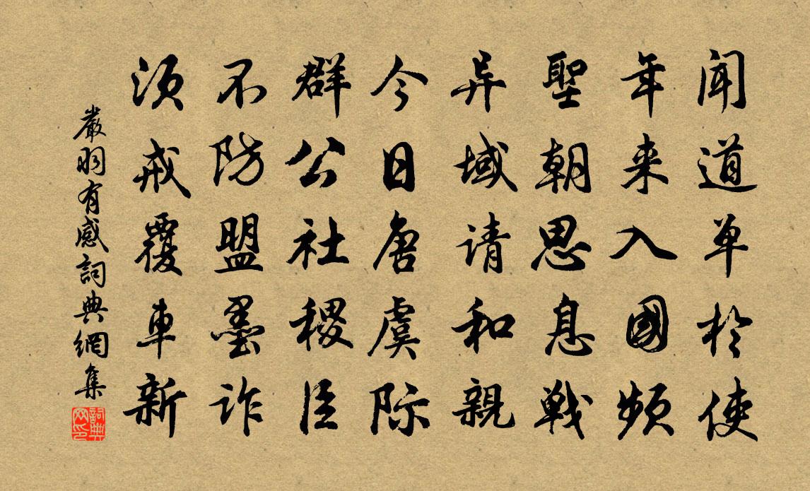 詩詞名句歷史字典書法欣賞書法字典國語詞典說文解字康熙字典古漢語字典標 題 作 者 詩 句 有感作者:嚴羽 朝代:宋代有感原文聞道單于使,年來入國頻。聖朝思息戰,異域請和親。今日唐虞際,群公社稷臣。不防盟墨詐,須戒覆車新。詩詞問答問:有感的作者是誰?答:嚴羽問:有感寫於哪個朝代?答:宋代問:有感是什麼體裁?答:五律嚴羽有感書法欣賞有感書法作品詩詞推薦題仰孝廉事實後葉適〔宋代〕孝子久傳名,誠通物表靈。當年虎失猛,此日竹還青。墓墾無留菽,庭荒枕舊廳。惟存古題志,寶惜勝如經。乙丑元日口號十首劉克莊〔宋代〕痴呆已肖木雞狀,行走不減竹馬時。太平期恰當今日,嬉戲翁渾如小兒。和陳處士在雍丘見寄徐鉉〔唐代〕衰薄喜多幸,退公誰與閒。高人乘興去,相望兩程間。卷箔有微雪,登樓無遠山。清談勝題贈,何日杖藜還。櫻桃花范成大〔宋代〕借暖沖寒不用媒,勻朱勻粉最先來。玉梅一見憐痴小,教向傍邊自在開。鷓鴣天姬翼〔元代〕金菊疏籬擅化工。草蟲切切話秋容。荷衰萍老蘆花白,撩亂西風墜葉紅。山減瘦,水爭雄。驅馳萬有盡歸宗。道人送隱上人還玉峰二首釋寶曇〔宋代〕故山為我小遲留,楓落吳江冷不收。歸去不知身是夢,青燈相對說它州。和端式十題春塘冰司馬光〔宋代〕春塘含薄冰,淅瀝隱隈曲。晴日射寒芒,柔風折哀玉。草樹曾未知,波光已先綠。君山王濯〔唐代〕無際波光滉太虛,君山一點暮雲孤。危樓欄檻能多少,展盡江湖萬里圖。留題吳促庶省副北軒畫壁兼呈楊樂道陳院龍圖王珪〔唐代〕文書滿眼紛紛里,忽覺滄波起荻洲。紅日不知華省暮,扁舟如下洞庭秋。林泉傲物非無約,軒冕拘人此未休。與拂更漏子(林鐘商)張先〔宋代〕錦筵紅,羅幕翠。侍宴美人姝麗。十五六,解憐才。勸人深酒杯。黛眉長,檀口小。耳畔向人輕道。柳陰曲,是兒南鄉子呂勝己〔宋代〕斗笠棹扁舟。碧水灣頭放自流。盡日垂絲魚不上,優遊。更覺心松奈得愁。行客語滄洲。笑道漁翁太拙休。萬事要奉楊公近蒙答四六狀極為精麗晁說之〔宋代〕博物張公適聖神,經營佐國不謀身。一槍採擷朝林下,八駿遨遊暮海濱。詩就秦州寧獨樂,政成周道要相親。敗軍游李少師園十題芡池范祖禹〔宋代〕向日鋪青蓋,浮波散綠盤。明珠洛浦佩,白玉水仙丹。和陽秀才惠詩七絕杜范〔宋代〕區區敢計一身存,剝盡皮毛尚有根。有客款門歌慷慨,清負為我濯塵褌。送韓仲文歸京口連文鳳〔宋代〕有客京口號竹坡,蒼然碧玉橫清波。淒涼馳陌走風雨,游塵飛撲征衫多。書齋黃敏求〔宋代〕新辟書齋鶴機寬,一簾風月盡幽閒。百年易向忙中過,萬事偏於好處慳。漫說折腰營斗米,何如留眼看雲山。只消龜溪即事五首高斯得〔宋代〕王庭陟俊茂,三年虱其間。愚忠竟何補,積咎成丘山。愧彼海上漚,臨機鴥其翻。昭□□□□,嗟嗟亦胡顏。汝今和顏長官百詠漁父朱繼芳〔宋代〕璧月滄波上下天,秋風搖落四無邊。玉龍盡喚眠鷗起,兩岸蘆花不見船。題張山人幽居趙庚夫〔宋代〕昔隱君平卜,今聞事又非。肘猶懸蠹簡,身止掛鶉衣。芒屨沿山去,茅檐講易歸。先儒皆若此,切莫嘆時違。登高杜甫〔唐代〕風急天高猿嘯哀,渚清沙白鳥飛回。無邊落木蕭蕭下,不盡長江袞袞來。萬里悲秋常作客,百年多病獨登台。艱難名句推薦吳洲如見月,千里幸相思。李白《送張舍人之江東》 雪嶺金河獨向東,吳山楚澤意無窮清江《送婆羅門》 老驥伏櫪,志在千里。曹操《龜雖壽 / 神龜雖壽》 倚遍闌乾,只是無情緒。李清照《點絳唇·閨思》 雄關漫道真如鐵,而今邁步從頭越。 * 《憶秦娥·婁山關》 臨水一長嘯,忽思十年初。白居易《垂釣》 欲祭疑君在,天涯哭此時。張籍《沒蕃故人》 君看六幅南朝事,老木寒雲滿故城。韋莊《金陵圖》 大江流日夜,客心悲未央。謝朓《暫使下都夜發新林至京邑贈西府同僚》 原濁者,流不清;行不信者,名必耗。墨子《墨子·02章 修身》