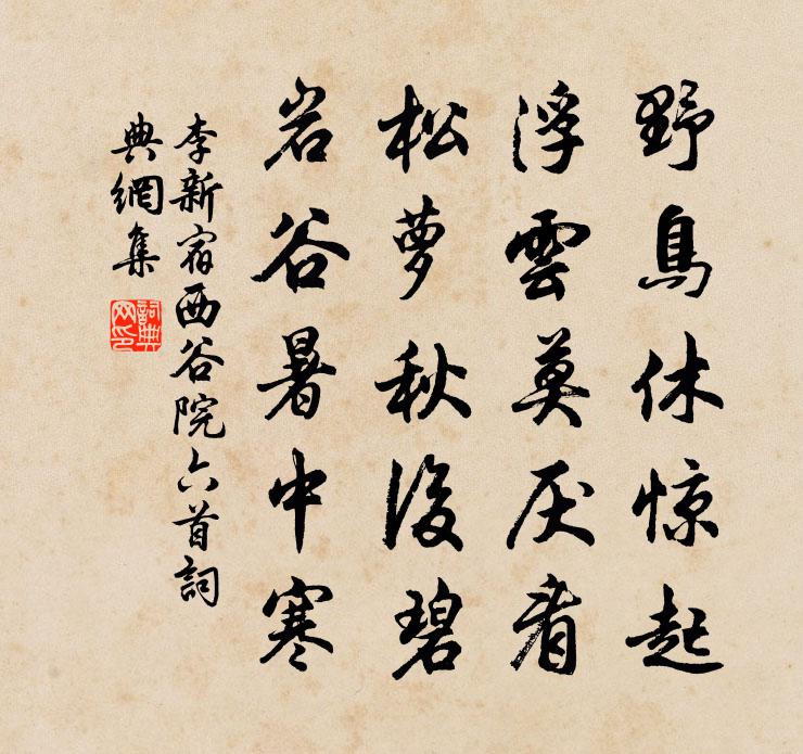 詩詞名句歷史字典書法欣賞書法字典國語詞典說文解字康熙字典古漢語字典標 題 作 者 詩 句 宿西谷院六首作者:李新 朝代:宋代宿西谷院六首原文野鳥休驚起,浮雲莫厭看。松蘿秋後碧,岩谷暑中寒。詩詞問答問:宿西谷院六首的作者是誰?答:李新問:宿西谷院六首寫於哪個朝代?答:宋代李新宿西谷院六首書法欣賞宿西谷院六首書法作品詩詞推薦六祖贊釋普濟〔宋代〕應無所住,白日迷路。失腳黃梅,道傳千古。不是風動非幡動。會也蚍蜉撼鐵柱。次韻路德章吳斗南同迓朱侍講項安世〔宋代〕兩年京洛筆生埃,忽見清詩眼為開。蕭灑並將秋色寫,雄豪更帶夜潮來。可憐拄腹五千卷,誰與澆愁三百杯。莫遺和秦奉之題蘄春驛浸月軒王之道〔宋代〕千山初過雨,萬籟不鳴風。寶鑑沉寒水,冰輪上太空。竹梢低蘸碧,楓葉冷浮紅。終欲金沙去,經營一畝宮。游秀府擇勝園周端臣〔宋代〕擇勝前朝錫雅名,不多花木四時榮。樓當列岫仍臨水,地此諸園最傍城。池暖錦鱗冬亦泳,洞寒丹鶴曉先鳴。宗王山行見鵲巢蔣冽〔唐代〕鵲巢性本高,更在西山木。朝下清泉戲,夜近明月宿。非直避網羅,兼能免傾覆。豈憂五陵子,挾彈來相逐。歸鴻閣王銍〔宋代〕初離江渚荻生芽,飛到龍荒雪滿沙。寄語不須傳信遠,將軍憂國不憂家。送汪永豐被薦解組還朝曾豐〔宋代〕等之土蒲同,他豈不雲便。顧寧圖此君,曾不鄙吾縣。小折彭澤腰,仰看督郵面。何以剸爾繁,胸次剛百練。何以詩答李時發見賀書省除命渠雲嘗言矣孔武仲〔宋代〕傾蓋相期自有人,贈言先許出埃塵。若非清議曾推挽,安得公朝有選掄。州縣徙勞雖已厭,置郵傳命或非真。期公春夜雪再用韻十首楊公遠〔宋代〕向曉披衣更擁衾,略無一事惱胸襟。起來點檢窗前雪,地上無多屋上深。清平樂·鶯啼殘月韋莊〔唐代〕鶯啼殘月,繡閣香燈滅。門外馬嘶郎欲別,正是落花時節。妝成不畫蛾眉,含愁獨倚金扉。去路香塵莫掃,掃即郎石盆寺李含章〔宋代〕巨石保年琢,為盆勢莫裁。圓疑通澤國,深可並天台。法水長時滿,青蓮向日開。無人知此喻,寂寞首空回。九日章甫〔宋代〕登高長是易銷魂,多病新來目更昏。強引兒童追節物,久拚身世任乾坤。江風冷拂烏紗帽,籬菊香浮老瓦盆。回首送翼之過天台趙汝鐩〔宋代〕天台山水窟,人道是仙家。白鶴掛寒溜,赤城飛暮霞。獨攜筇杖過,莫畏石橋斜。牢記經行處,歸來向我夸。嘆息高翥〔宋代〕嘆息閒身不自如,長年借屋客中居。事多隻為人情熟,貧甚還因世法疏。兄弟候歸應有夢,交遊散去更無書。攢心春分後一日山堂述事張鎡〔宋代〕老圃工夫愈可嘉,種藤縈樹盡開花。人間似我能閒少,石上看雲到日斜。樵徑有苔休埽葉,茅庵無客亦煎茶。兩邊贈杭僧道潛蘇轍〔宋代〕月中依松鶴,露下抱葉蟬。賦形已孤潔,發響仍清圓。潛師本江海,浪跡游市廛。髭長不能翦,衲壞聊復穿。瘦骨會景堂鮮于侁〔宋代〕金城環雉堞,雲屋瞰闤貴。雙林聳江右,九隴覘天外。夕月十首佚名〔宋代〕[太簇宮徽]逆日著明,麗天作配。潔誠以祠,禮行肅拜。光凝冕服,氣肅環佩。庶幾昭格,祗而不懈。妙庭觀用東坡韻王銍〔宋代〕侍宴瑤池更不歸,茂陵千古掛余悲。祗今山下傳遺姓,應守瓊田舊玉芝。山縣趙希邁〔宋代〕山縣渾如野客家,游蜂數點趁朝衙。簿書押了無公事,小吏呼來掃落花。名句推薦木從繩則正,後從諫則聖。佚名《尚書·商書·說命上》 君若清路塵,妾若濁水泥;曹植《明月上高樓》 精誠由中,故其文語感動人深。王充《論衡·卷十三·超奇篇》 對飲食,勿揀擇。食適可,勿過則。李毓秀《弟子規·謹》 書中自有黃金屋,書中自有顏如玉趙恆《勸學詩》 浪花有意千里雪,桃花無言一隊春。李煜《漁父·浪花有意千里雪》 古宮閒地少,水港小橋多。杜荀鶴《送人游吳》 垂下簾櫳。雙燕歸來細雨中。歐陽修《採桑子·群芳過後西湖好》 一身轉戰三千里,一劍曾當百萬師。王維《老將行》 危橋屬幽徑,繚繞穿疏林。柳宗元《巽公院五詠·苦竹橋》