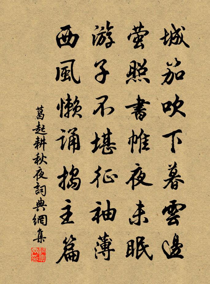 詩詞名句歷史字典書法欣賞書法字典國語詞典說文解字康熙字典古漢語字典標 題 作 者 詩 句 秋夜作者:葛起耕 朝代:宋代秋夜原文城笳吹下暮雲邊,螢照書帷夜未眠。遊子不堪征袖薄,西風懶誦搗主篇。詩詞問答問:秋夜的作者是誰?答:葛起耕問:秋夜寫於哪個朝代?答:宋代葛起耕秋夜書法欣賞秋夜書法作品詩詞推薦書駿馬圖陳深〔宋代〕王良伯樂骨已朽,曹霸丹青亦希有。開圖欻見神駿姿,對酒高歌雄劍吼。只今騏驥困監車,落日長鳴漫昂首。嗤嗤福昌雜詠五首張耒〔宋代〕張翰飄然欲鱠鱸,周南久客意何如。風悲故國荊榛地,日落空城雉兔墟。明月搗衣聞洛杵,故人憑雁寄南書。旅歌招許主客歐陽修〔宋代〕欲將何物招嘉客,惟有新秋一味涼。更掃廣庭寬百畝,少容明月放清光。樓頭破監看將滿,瓮面浮蛆撥已香。仍約瑞光亭丘葵〔宋代〕昔聞石幢寺,今見瑞光亭。一水東南碧,四榕冬夏青。往來多俗子,老病抱遺經。親冢招提北,回頭涕泗零。擬盧仝詩錢易〔宋代〕門前飛楊花,屋後惡水鳴青蛙。案上兩卷書,堯典與舜典,留與添丁作生涯。題奉慈寺楊德麟〔唐代〕日月金輪動,旃檀碧樹秋。塔分鴻雁翅,鍾掛鳳凰樓。送元勛不伐侍親之官泉南八首李廌〔宋代〕君房言語妙知名,元凱春秋癖已成。作者風流公莫讓,要令江海聽文鳴。偶成夏竦〔宋代〕非才遍歷清華地,悟佛方為止足身。浮名浮利莫相試,三千世界一微塵。頌古三十一首釋安永〔宋代〕電光影裹,緇素區分。纖毫不犯,總教滅門。九日寄微之白居易〔唐代〕眼闇頭風事事妨,繞籬新菊為誰黃。閒遊日久心慵倦,痛飲年深肺損傷。吳郡兩回逢九月,越州四度見重陽。怕飛袷饗太廟佚名〔宋代〕猗我僖祖,德潛而棄。慶之所基,日茂以崇。施及後嗣,天命有融。廟歌載之,播於無窮。送鄭居之賴鑄〔宋代〕窗前落葉正蕭蕭,夜雨寒燈共寂寥。君是居人余是客,明朝相候合江橋。池上二首蘇軾〔宋代〕小池新鑿會天雨,一部鼓吹從何來。有蟾正碧亂草色,時泅出沒東南隈。井幹跳梁亦足樂,洞庭魚龍何有哉。能歌寄桐江隱者 [一作許渾詩。]杜牧〔唐代〕潮去潮來洲渚春,山花如繡草如茵。嚴陵台下桐江水,解釣鱸魚能幾人?次韻徐應祺小樓韓元吉〔宋代〕瀲瀲清波泊路衢,垂垂高柳對扶疏。已知百尺樓堪臥,況有三重茅可居。我老詎能賡鮑謝,君才端合紹嚴徐。直須金剛隨機無盡頌離色離相分第二十釋印肅〔宋代〕煙村三月雨,物物皆相許。只欠自承當,顯露堂堂底。捉筆次前韻杜范〔宋代〕小雨添溪滑,新晴散野清。寸襟如水闊,一槳共雲輕。坦坦道皆直,縈縈逕自橫。天衢從此卜,何用問前程。初夏同桑甥世昌過鄰家陸游〔宋代〕空谷舊生涯,蕭條只自嗟。妻饞嗔護筍,兒病失澆花。赤米老能飽,濁醪貧可賒。徵科幸差簡,扶杖過鄰家。和范倅十首曹勛〔宋代〕幕天席地供余酌,惜月留雲憶舊書。今日海邊訊息斷,空令稚子摘芳蔬。次花翁喜雪快晴韻杜范〔宋代〕何人急急走靈符,扶醒摐摐十萬夫。隘巷未收穿履跡,短檐已倚曬書儒。日開雪色如翻手,景屬詩家費捻須。起望名句推薦疏條交映,有時見日。吳均《與朱元思書》 故人南燕吏,籍籍名更香。岑參《至大梁卻寄匡城主人》 五月雖熱麥風清,檐頭索索繰車鳴。王建《田家行》 賢者舉而上之,富而貴之,以為官長,不肖者抑而廢之。墨子《墨子·09章 尚賢(中)》 人不可貌相,海水不可斗量。馮夢龍《醒世恆言·卷三》 做弄得、酒醒天寒,空對一庭香雪。張炎《疏影·梅影》 松竹含新秋,軒窗有餘清。崔元翰《奉和聖制中元日題奉敬寺》 長安白日照春空,綠楊結煙垂裊風。李白《陽春歌》 三十功名塵與土,八千里路雲和月。岳飛《滿江紅·寫懷》 紅旗捲起農奴戟,黑手高懸霸主鞭。 * 《七律·到韶山》
