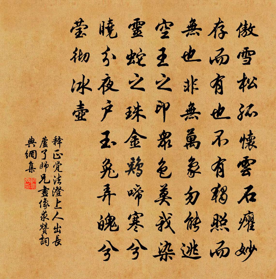 詩詞名句歷史字典書法欣賞書法字典國語詞典說文解字康熙字典古漢語字典標 題 作 者 詩 句 法澄上人出長蘆了師兄畫像求贊作者:釋正覺 朝代:宋代原文傲雪松孤,懷雲石癯。妙存而有也不有,獨照而無也非無。萬象勿能逃空王之印,眾色莫我染靈蛇之珠。金雞啼寒兮曉分夜戶,玉兔弄魄兮瑩徹冰壺。詩詞問答問:《法澄上人出長蘆了師兄畫像求贊》的作者是誰?答:釋正覺問:該詩寫於哪個朝代?答:宋代書法欣賞法澄上人出長蘆了師兄畫像求贊書法作品詩詞推薦踏莎行(追往事)毛滂〔宋代〕芳氣霏微,薄衣料峭。何人正倚桃花笑。流紅不出武陵溪,這回空與春風到。尊俎全稀,風情終較。安仁老也誰知秦婦吟韋莊〔唐代〕中和癸卯春三月,洛陽城外花如雪。東西南北路人絶,綠楊悄悄香塵滅。路旁忽見如花人,獨向綠楊陰下歇。鳳側送盧潘尚書之靈武韋蟾〔唐代〕賀蘭山下果園成,塞北江南舊有名。水木萬家朱戶暗,弓刀千隊鐵衣鳴。心源落落堪為將,膽氣堂堂合用兵。卻使感遇二十五首張耒〔宋代〕懷王棄屈子,憔悴楚江湄。終然葬魚腹,終古耀文詞。千年洛陽客,作賦不無譏。謂當棄之去,覽德乃下之。君臣除夜方岳〔宋代〕眼底童烏已七齡,吾伊略亦記群經。丁寧莫就中書試,只可松邊竹下聽。華陽堂二詠白玉蟾〔宋代〕不著人間一點塵,滿堂儘是學仙人。衣衫總帶煙霞色,杖屨相隨雲水身。鐵笛橫吹滄海月,紙袍包盡洞天春。而今夜坐讀離騷張嵲〔宋代〕山風颯颯木蕭蕭,挑盡青燈夜正遙。但得誅茅臨澗水,長年飲酒詠離騷。定風波王吉昌〔元代〕功煉心開智藏圓。靈明一點邁嬋娟。物外崢嶸惟獨步,玄玄。不空不有貌難詮。觸處全伸無礙相,虛空打破應無邊探幽釋文珦〔宋代〕秋色令人愛,青藜助遠探。柿楓丹互映,天水碧相涵。絕景沙鷗占,幽程野老諳。謂予雲外去,更有古龍潭。春怨王令〔宋代〕掃地待花落,惜花輕眷塵。遊人空眷戀,踏去卻尋春。四用韻奉酬楊公遠〔宋代〕文獻中州仰大邦,姓名由此帶天香。襟懷月照江湖水,談笑風生齒頰霜。天理每從閒處見,詩篇常向靜中忙。明朝偈頌二十五首釋如淨〔宋代〕黃金妙相,驢腮馬觜。咦,賊是小人,智過君子。從丘十四借韓文二首黃庭堅〔宋代〕中有先君手澤,丹鉛點勘書詩。莫惜借行千里,他日還君一鴟。龍鍾陸游〔宋代〕龍鍾一老寄荒村,鼎食山棲久已分。平日氣吞雲夢澤,暮年緣在武夷君。搶榆敢羨垂天翼,倚市從嗤刺繡文。幸有次韻張中白元日方回〔宋代〕瓣香清曉肅冠紳,戶外遙山展翠顰。瘦影自憐耽醉叟,歡聲何限喜晴人。匆匆節序梅花老,袞袞塵埃世事新。自有古鼎作香爐范成大〔宋代〕雲雷縈帶古文章,子子孫孫永奉常。辛苦勒銘成底事?如今流落管燒香。瓠子歌劉徹〔兩漢〕河湯湯兮激潺湲。北渡回兮迅流難。搴長筊兮湛美玉。河公許兮薪不屬。薪不屬兮衛人罪。燒蕭條兮噫乎何以御水黃河多淘河之屬有曰漫畫者常以觜畫水求魚有晁說之〔宋代〕淘河復淘河,后土激浪沙分波。大石羽轉雜龍鼉,汝欲澄清力幾多。官家費盡水衡錢,萬夫政待汝漪漣。天上有河讀賈區、賈島集貫休〔唐代〕區終不下島,島亦不多區。冷格俱無敵,貧根亦似愚。青雲終嘆命,白閣久圍爐。今日成名者,還堪為爾吁。花山寺方信孺〔宋代〕萬花春老正紅酣,不是叢林優缽曇。山下女郎來問訊,未饒萱草解宜男。名句推薦兵強勝人,人強勝天佚名《逸周書·卷三·文傳解》 天時人事日相催,冬至陽生春又來。杜甫《小至》 何當載酒來,共醉重陽節。孟浩然《秋登蘭山寄張五》 埋骨何須桑梓地,人生無處不青山。 * 《七絕·改西鄉隆盛詩贈父親》 東風漸綠西湖柳,雁已還、人未南歸。周密《高陽台·送陳君衡被召》 分不盡,半涼天。可憐閒剩此嬋娟。吳文英《思佳客·閏中秋》 含弘光大,品物鹹亨。佚名《易傳·彖傳上·坤》 天地合而萬物生,陰陽接而變化起,性偽合而天下治。荀子《荀子·禮論》 離別一何久,七度過中秋。蘇轍《水調歌頭·徐州中秋》 著葉滿枝翠羽蓋,開花無數黃金錢杜甫《秋雨嘆三首》