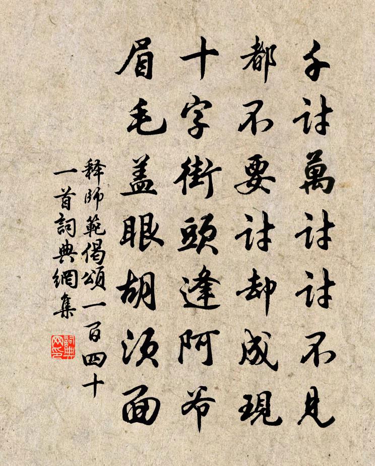 詩詞名句歷史字典書法欣賞書法字典國語詞典說文解字康熙字典古漢語字典標 題 作 者 詩 句 偈頌一百四十一首作者:釋師範 朝代:宋代偈頌一百四十一首原文千討萬討討不見,都不要討卻成現。十字街頭逢阿爺,眉毛蓋眼鬍鬚面。詩詞問答問:偈頌一百四十一首的作者是誰?答:釋師範問:偈頌一百四十一首寫於哪個朝代?答:宋代釋師範偈頌一百四十一首書法欣賞偈頌一百四十一首書法作品詩詞推薦雜感白居易〔唐代〕君子防悔尤,賢人戒行藏。嫌疑遠瓜李,言動慎毫芒。立教固如此,撫事有非常。為君持所感,仰面問蒼蒼。犬齧息國汪遵〔唐代〕家國興亡身獨存,玉容還受楚王恩。銜冤只合甘先死,何待花間不肯言。粉蝶兒姬翼〔元代〕綠鬢朱顏,那禁兩輪烏兔。被恩枷、愛繩纏住。重如山,深似海,渾身擔負。轉頭看,只贏得、一丘閒土。些子時謝人惠詩二首姜特立〔宋代〕爐鎚鍛鍊不遺力,造化窮皺無遁情。每對時人思杜老,不知能事屬先生。贈劉靜翁頌四首黃庭堅〔宋代〕萬緣空處真如佛,八面風中不動尊。困便橫眠飢吃飯,十方無壁又無門。觀瀾亭許將〔宋代〕危亭高處倚岩隈,西望蒲菖海浪回。山戴鰲頭天外出,水浮鰍穴地中來。千重側崦扶搖沒,萬里分流混沌開。蔡州蔣亭薛能〔唐代〕草徑徹林間,過橋如入山。蔡侯添水榭,蔣氏本柴關。靜泛窮幽趣,驚飛濕醉顏。恨無優俸買,來得暫時閒。步與奉和九月九日登慈恩寺浮圖應制孫佺〔唐代〕應節萸房滿,初寒菊圃新。龍旗煥辰極,鳳駕儼香闉。蓮井偏宜夏,梅梁更若春。一忻陪雁塔,還似得天身。鳥窠贊釋師範〔宋代〕佛法有些子,言中設網羅。布毛吹起處,依舊不離窠。從李崇道覓潘衡墨四首趙蕃〔宋代〕人言潘谷久騰空,衡也崎嶇隱墨中。谷見坡詩衡用訣,了知真是一家風。文宣王及其弟子贊宋高宗〔宋代〕彼美邽子,先聖是承。牆仞已及,堂陛將升。良玉斯琢,寒水必水。錫壤平陸,茂實騫騰。鵲橋仙(旬會作)郭應祥〔宋代〕六丁文焰,六韜武略,那更六經心醉。六人相對座生風,繼六逸、當年舊事。六州清唱,六么妙舞,執樂仍呼六妓鷓鴣天元好問〔金代〕八月蘆溝風路清。短衣孤劍此飄零。蒼龍雙關平生恨,只有西山滿意青。塵擾擾,雁冥冥。因君南望涌金亭。還家和端式十題古木陰司馬光〔宋代〕古木夏陰薄,蕭蕭蠹葉微。豈無綠樹深,愛此風煙姿。高僧此休息,肩倚瘦筇枝。念奴矯·送陳正言家鉉翁〔宋代〕南來數騎,問征塵、正是江頭風惡。耿耿孤忠磨不盡,惟有老天知得。短棹浮淮。輕氈渡漢,回首觚稜泣。緘書欲驟雨方回〔宋代〕道妙無生有,神凝氣孕形。為誰膏草木,何物起雷霆。本質端能受,元功同獨靈。老夫已枯槁,衰白肯新青。博山台黃庭堅〔宋代〕宮亭只說香爐峰,此地今見博山台。紫煙孤起麗朝日,定是海山飛得來。化工造物能神奇,不必驚世出蓬萊。千來富陽道中二首項安世〔宋代〕一帶江流兩岸山,玉花珠髻滿雲鬟。一聲鳴櫓俱回首,小杜舟中醉眼看。紫騮馬李益〔唐代〕爭場看鬥雞,白鼻紫騮嘶。漳水春閨晚,叢台日向低。歇鞍珠作汗,試劍玉如泥。為謝紅梁燕,年年妾獨棲。菩薩蠻·半煙半雨溪橋畔黃庭堅〔宋代〕半煙半雨溪橋畔。漁翁醉著無人喚。疏懶意何長。春風花草香。江山如有待。此意陶潛解。問我去何之。君行到自名句推薦厚祿故人書斷絕,恆飢稚子色淒涼。杜甫《狂夫》 舉目山河異,偏傷周顗情。李白《金陵新亭》 行行無別語,只道早還鄉。袁凱《京師得家書》 成大功者不小苛。劉向《說苑·政理》 夜來攜手夢同游,晨起盈巾淚莫收。白居易《夢微之》 後夜相思,塵隨馬去,月逐舟行。劉過《柳梢青·送盧梅坡》 燎沉香,消溽暑。周邦彥《蘇幕遮·燎沉香》 友者、所以相有也。道不同,何以相有也?荀子《荀子·大略》 秋晚佳晨重物華,高台復帳駐鳴笳。宋祁《九日置酒》 是節東籬菊,紛披為誰秀。杜甫《九日寄岑參》