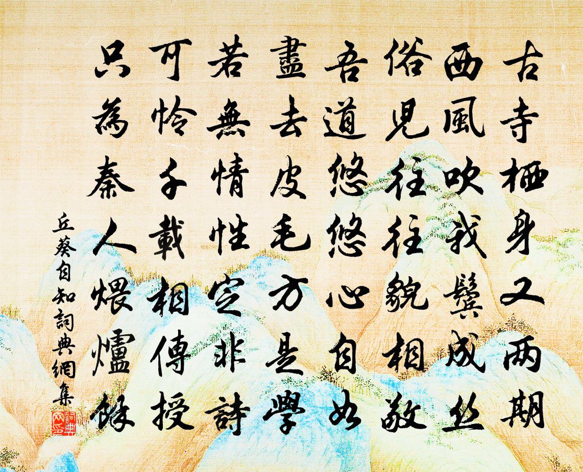 詩詞名句歷史字典書法欣賞書法字典國語詞典說文解字康熙字典古漢語字典標 題 作 者 詩 句 自知作者:丘葵 朝代:宋代自知原文古寺棲身又兩期,西風吹我鬢成絲。俗兒往往貌相敬,吾道悠悠心自如。盡去皮毛方是學,若無情性定非詩。可憐千載相傳授,只為秦人煨爐余。詩詞問答問:自知的作者是誰?答:丘葵問:自知寫於哪個朝代?答:宋代丘葵自知書法欣賞自知書法作品詩詞推薦南嶽戴復古〔宋代〕南雲漂渺連蒼穹,七十二峰朝祝融。凌空棟宇赤帝宅,修廊翼翼生寒風。朝家遣使嚴祀典,御香當殿開宸封。願四送王簡卿歸天台二首姜夔〔宋代〕迎風吹白髮,送客向黃岩。在事何為爾,如君自不凡。城陰當復會,詩卷可頻緘。縱別無多久,江沙望遠帆。次韻恩平郡王丹桂史浩〔宋代〕銀潢滾滾碧流長,洗出清秋百種芳。著蕊半殷生桂子,離群獨立有天香。仙人肅啄遙相過,野老婆娑日在傍。正喜夜坐有懷寄張士遜寇準〔宋代〕清秋吟更僻,況復古亭間。少夢蟲聲碎,無風樹影閒。月華澄曲沼,霜氣滿空山。不見張夫子,誰人共往還。金縷曲顧貞觀〔清代〕季子平安否?便歸來,平生萬事,那堪回首!行路悠悠誰慰藉,母老家貧子幼。記不起,從前杯酒,魑魅搏人座見與林止庵葉半隱分賦郡中古蹟得魯公祠右軍艾性夫〔宋代〕遺像猶能立懦夫,懸知生氣攝萑苻。三郎阿堵知何用,只識營州阿犖奴。昏昏水氣吐玄雲,自是先生筆有神。不洗四月初四日聞績溪凡十五都賊焚欲盡傍出焚歙方回〔宋代〕昔日初聞寇,諸人早出師。焚燒寧太廣,收勦已無遺。斧鉞何曾鈍,雷霆豈肯心。遷延非決策,那得更狐疑。摸魚兒(楊教之齊安任)鄧剡〔宋代〕笑平生、布帆無恙,堂堂穩送君去。江聲悲壯崖殷血,曾是英雄行處。今亦古。甚一點東風,天不周郎與。城幡夜酬海宗二侍者釋重顯〔宋代〕蓀之得蘭,其道匪難。扶吾病起,如珠在盤。一兮二兮,自看誰看。林景思寄贈五言,以長句謝之楊萬里〔宋代〕華亭花沉虞卿,惠山尤延之。每見無雜語,只說林景思。試問景思有何好,佳句驚人人絕倒。句句飛從月外來,可瑞鷓鴣趙希蓬〔宋代〕把定離觴不肯斟。聞君未醉盡衷情。丁香空結千般恨,柳線難縈一片心。只把文章酧素願,莫貪歌舞阻歸程。憑君夕次竟陵張祜〔唐代〕南風吹五兩,日暮竟陵城。腸斷巴江月,夜蟬何處聲。和章序臣梅花二首王之道〔宋代〕三月詩筒絕往來,有時談麈許追陪。梅花雅欲撩佳句,犯雪凌霜為我開。法曲(入破第四)曹勛〔宋代〕黃鐘正嚴凜,飛舞屑瓊瑰。清賞豐年瑞。雲液喜傳杯。陰爻會見復,動一陽、生浩氣。誰問添宮線,煉功在金液。上馮使君渡水僧障子貫休〔唐代〕跣足拄巴藤,潺湲渡幾曾。盡權無著印,不是等閒僧。熊耳應初到,牛頭始去登。畫來偏覺好,將寄柳吳興。牡丹賦舒元輿〔唐代〕 古人言花者,牡丹未嘗與焉。蓋遁乎深山,自幽而著。以為貴重所知,花則何遇焉?天后之鄉,西河也,有眾偈頌四十一首釋慧暉〔宋代〕花落秦川流水香,雨清荷玉妙珠藏。只么堂堂訊息子,見來一點不相當。靜夜鐘聲樓上冷,殘春岑色付紅陽。好是菩薩蠻·梅雪周邦彥〔宋代〕銀河宛轉三千曲。浴鳧飛鷺澄波綠。何處是歸舟。夕陽江上樓。天憎梅浪發。故下封枝雪。深院捲簾看。應憐江上郡齋水閣閒書衰後文同〔宋代〕衰後常親藥餌,憂來頗憶林泉。身坐謝莊小閣,心游沈約東田。次韻鑒中八詠於石〔宋代〕會稽山水國,崇山幽事多。當時觴詠處,春淨化顏酡。磊落黃金罍,玲瓏白玉珂。行樂須及時,美人在丘阿。名句推薦只言啼鳥堪求侶,無那春風欲送行。高適《夜別韋司士》 不盡眼中青,是愁來時節張元乾《石州慢·寒水依痕》 借問酒家何處有?牧童遙指杏花村。杜牧《清明》 制在己曰重,不離位曰靜。重則能使輕,靜則能使躁。韓非及後人《韓非子·喻老》 崖崩路絕猿鳥去,惟有喬木攙天長。蘇軾《李思訓畫長江絕島圖》 兼相愛,交相利。墨子《墨子·15章 兼愛(中)》 氣軟來風易,枝繁度鳥遲。李爽《芳樹》 長記海棠開後,正傷春時節李清照《好事近·風定落花深》 晨興理荒穢,帶月荷鋤歸。陶淵明《歸園田居·其三》 鎮日思歸歸未得,孤負殷勤杜宇。王瀾《念奴嬌·避地溢江書於新亭》