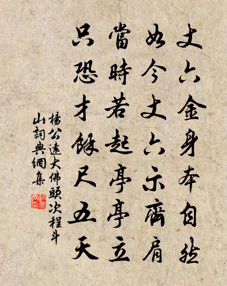 詩詞名句歷史字典書法欣賞書法字典國語詞典說文解字康熙字典古漢語字典標 題 作 者 詩 句 大佛頭次程斗山作者:楊公遠 朝代:宋代大佛頭次程斗山原文丈六金身本自然,如今丈六示齊肩。當時若起亭亭立,只恐才余尺五天。詩詞問答問:大佛頭次程斗山的作者是誰?答:楊公遠問:大佛頭次程斗山寫於哪個朝代?答:宋代楊公遠大佛頭次程斗山書法欣賞大佛頭次程斗山書法作品詩詞推薦虞美人·春情只到梨花薄納蘭性德〔清代〕春情只到梨花薄,片片催零落。夕陽何事近黃昏,不道人間猶有未招魂。銀箋別夢當時句,密綰同心苣。為伊判作禁火日(第七句缺一字)溫庭筠〔唐代〕駘蕩清明日,儲胥小苑東。舞衫萱草綠,春鬢杏花紅。馬轡輕銜雪,車衣弱向風。□愁聞百舌,殘睡正朦朧。晚春送牡丹李建勛〔唐代〕攜觴邀客繞朱闌,腸斷殘春送牡丹。風雨數來留不得,離披將謝忍重看。氛氳蘭麝香初減,零落雲霞色漸乾。借問浯溪林訪〔宋代〕文士相輕自古然,堪嗟嘲詠費雕鐫。元顏文筆非餘子,示可毛疵議昔賢。韓子華吳長文石昌三舍人見訪梅堯臣〔宋代〕當時載酒客,共過草玄人。今日一寒士,能來三侍臣。竹門容大馬,金絡照諸鄰。雞瘦莫為具,阮家依舊貧。清平樂(江上重九)黃機〔宋代〕西風獵獵。又是登高節。一片情懷無處說。秋滿江頭紅葉。誰憐鬢影淒涼。新來更點吳霜。孤負萸囊菊盞,年年客滿江紅(次韻吊汶陽李誠之待制)晁補之〔宋代〕華鬢春風,長歌罷、傷今感昨。春正好、瑤墀已嘆,侍臣冥寞。牙帳塵昏餘劍戟,翠帷月冷虛弦索。記往歲、龍坂游郭希呂石洞二十詠月峽劉過〔宋代〕兩岩限東西,里有一帶天。老蟾更多事,駕月下潺湲。句錢惟演〔宋代〕漢幟隨移帳,燕鴻伴解鞍。次韻晁大舅祖子應趙蕃〔宋代〕離騷皎皎在湖湘,冀北茫茫失乘黃。徒手豈能探虎穴,敝車安得繞羊腸。外家文律況吾祖,有作歲時常一囊。天遣寄趙德莊以過去生中作弟兄為韻七首韓元吉〔宋代〕憶昨鐘山來,君亦湓浦去。今年赴湓浦,鐘山復君住。出處每相似,屢觸眾狙怒。毀譽久自定,子賢吾亦庶。琴王昌齡〔唐代〕孤桐秘虛鳴,樸素傳幽真。仿佛弦指外,遂見初古人。意遠風雪苦,時來江山春。高宴未終曲,誰能辨經綸。游淮雲寺牟融〔唐代〕白雲深鎖沃州山,冠蓋登臨眾仰攀。松徑風清聞鶴唳,曇花香暝見僧還。玄機隱隱應難覺,塵事悠悠了不關。興盡長灘夢李紳元稹〔唐代〕孤吟獨寢意千般,合眼逢君 * 。慚愧夢魂無遠近,不辭風雨到長灘。苕溪僧妙詢於其所居淨域開小軒楚僧舉季若為王銍〔宋代〕一性本為性明,返為性群物迷性。境淨皆徑山,心清即苕溪。啟扉迥臨湖,湖寬覺天低。花木春艷艷,松竹涼淒淒再次前韻四首蘇轍〔宋代〕謬將疏野託交游,平日論心亦有由。科第聯翩叨舊契,利名疏闊少新憂。清談已覺忘朱夏,濁酒先防虐素秋。多病大行皇帝輓詩六首劉克莊〔宋代〕英鑒高千古,名尤不假人。周惟十夫哲,漢止一儒醇。聖筆嚴褒貶,臣材豈擬倫。驪珠六十九,誰謂橐中貧。夜飲以白糖嚼梅花楊萬里〔宋代〕剪雪作梅只堪嗅,點蜜如霜新可口。一花自可咽一杯,嚼盡寒花幾杯酒。先生清貧似飢蚊,饞涎流到瘦脛根。贛江題及之後山新築茅舍趙汝鐩〔宋代〕瀟灑人間世,柴門夾兩槐。詩僧恰方去,俗客不曾來。翠合苔初長,紅嬌杏半開。南邊許多地,臘月竹須栽。北高峰董嗣杲〔宋代〕旛竿裊影入青冥,暮鼓朝鐘鎮不停。劫火幾灰龕底像,西風兩減塔層鈴。市人祈福心苗異,廟祝求金口角靈。三十名句推薦綠竹含新粉,紅蓮落故衣。王維《山居即事》 還怕兩人俱薄命,再緣慳、剩月零風裡。納蘭性德《金縷曲·亡婦忌日有感》 牆外行人,牆裡佳人笑。蘇軾《蝶戀花·春景》 今日雲景好,水綠秋山明。李白《九日》 此情可待成追憶?只是當時已惘然。李商隱《錦瑟》 啼鶯舞燕,小橋流水飛紅。白樸《天淨沙·春》 邂逅淇南,歲寒獨在,故人襟抱。王惲《水龍吟·送焦和之赴西夏行省》 城雪初消薺菜生,角門深巷少人行。楊載《到京師》 狗馬飾雕文,土木被緹繡。范曄《後漢書·列傳·宦者列傳》 明月照積雪,朔風勁且哀。謝靈運《歲暮》