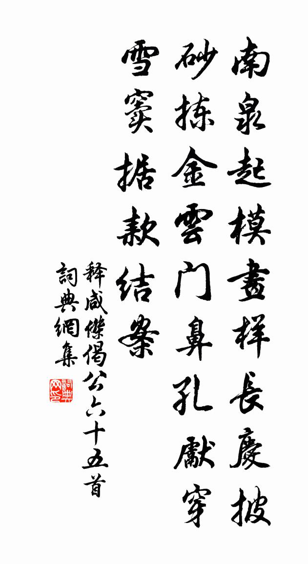 詩詞名句歷史字典書法欣賞書法字典國語詞典說文解字康熙字典古漢語字典標 題 作 者 詩 句 偈公六十五首作者:釋鹹傑 朝代:宋代偈公六十五首原文南泉起模畫樣,長慶披砂揀金。雲門鼻孔先穿,雪竇據款結案。詩詞問答問:偈公六十五首的作者是誰?答:釋鹹傑問:偈公六十五首寫於哪個朝代?答:宋代釋鹹傑偈公六十五首書法欣賞偈公六十五首書法作品詩詞推薦大觀聞喜宴六首佚名〔宋代〕多士濟濟,於彼西雍。欽肅威德,亦有斯容。函然來思,自西自東。天畏爾祿,惟王其崇。阻風,泊鍾家村。離英州已三日,才行二十里楊萬里〔宋代〕南遊端為看山來,過眼勿勿首屢回。不是阻風船不進,何緣看盡萬崔嵬。聞歌者唱微之詩白居易〔唐代〕新詩絕筆聲名歇,舊卷生塵篋笥深。時向歌中聞一句,未容傾耳已傷心。太常引 以上二首見詞品卷五陳孚〔元代〕短衣孤劍客乾坤。奈無策,報親恩。三載隔晨昏。更疏雨、寒燈斷魂。赤城霞外,西風鶴髮,猶想倚柴門。蒲醑謾題三游洞石壁蘇轍〔宋代〕昔年有遷客,攜手醉嵌岩。去我歲已百,遊人忽復三。句岳珂〔宋代〕動指不須占染鼎,去毛切莫拗蒸壺。虞美人張炎〔宋代〕住,隨風好去落誰家。”作憶柳曲修眉刷翠春痕聚。難翦愁來處。斷絲無力綰韶華。也學落紅流水、到天涯。那回送周子上赴宜春胡銓〔宋代〕憶昔昌黎伯,直諫氣凜然。又聞贊皇公,直道薄雲天。堂堂兩宋工,蓋世勛無前。曷來著此邦,仰山同不騫。公今將池僧舍東軒曉起張嵲〔宋代〕茲軒臨絕頂,遠與前山平。睡起月初上,冷冷曉風清。暗嶺躍飛雷,白雲出疏星。四顧莽不辨,惟聞候蟲鳴。居人餈韻楊公濟奉議梅花十首蘇軾〔宋代〕日出冰澌散水花,野梅官柳漸攲斜。西郊欲就詩人飲,黃四娘東子美家。送鄧宗古還鄉蘇軾〔宋代〕廣漢有姜子,孝弟行里閭。赤眉雖豺虎,弛兵過其墟。至今空清泉,無復雙鯉魚。南鄭有李郃,得妙甘公書。夜坐太常引佚名〔宋代〕百年勳業鏡中看。嘆行路古來難。風雨換朱顏。更誰管、安仁鬢斑。掀天聲價,凌雲氣勢,短夢破槐安。回首問青慶東宮生辰四首周必大〔宋代〕崔豹稱明君,如月有規輪。戴暠論副德,桂滿自長春。況乃秋夜永,萬里無纖塵。願歌重輪句,照耀率土濱。鷓鴣天(雪梅)范成大〔宋代〕壓蕊拈鬚粉作團。疏香辛苦顫朝寒。須知風月尋常見,不似層層帶雪看。春髻重,曉眉彎。一枝斜並縷金旛。酒紅頌古釋道顏〔宋代〕胡亂三十年,不少鹽與醬。江西馬大師,南嶽讓和尚。水龍吟曹勛〔宋代〕凍雲閣雨,長風送雪,萬里無凝滯。斜斜整整,純白入素,應同太始。袁巷蕭條,冷光寒透,有人曾至。但圓虛上次韻文潛憶楊翰林元素家淮上夜飲作晁補之〔宋代〕老人得坐安若山,畏寒縮頸衣裘間。不如公子擁樽酒,詩材春亂詞濤翻。想見楊家美人出,玉面朱唇映琴瑟。冰船同沈道源游八功德水王安石〔宋代〕寒雲靜如痴,寒日慘如戚。解鞍寒山中,共坐寒水側。新甘出短綆,一酌煩可滌。仰攀青青枝,木醴何所直。點絳唇佚名〔宋代〕一朵千金,帝城穀雨初晴後。粉拖香透。雅稱群芳首。把酒題詩,遐想歡如舊。花知否。故人清瘦。長憶同攜手。偶成周端臣〔宋代〕一灑斑斑小雨晴,杖藜隨意散幽情。不論城市山林地,才有梅花處便清。名句推薦明月照高樓,流光正徘徊。曹植《七哀》 笑別廬山遠,何煩過虎溪。李白《別東林寺僧》 頭醋不釅徹底薄。施耐庵《水滸傳·第五十一回》 紗廚藤簟,玉人羅扇輕縑。白樸《天淨沙·夏》 路入南中,桄榔葉暗蓼花紅。歐陽炯《南鄉子·路入南中》 雪聲偏傍竹,寒夢不離家。戎昱《桂州臘夜》 國無三年之食者,國非其國也墨子《墨子·05章 七患》 博厚,所以載物也。高明,所以覆物也。悠久,所以成物也。子思《中庸·第二十六章》 大漠西風急,黃榆涼葉飛。田錫《塞上曲》 山荒聊可田,錢鎛還易辦。王守仁《謫居糧絕請學於農將田南山詠言寄懷》