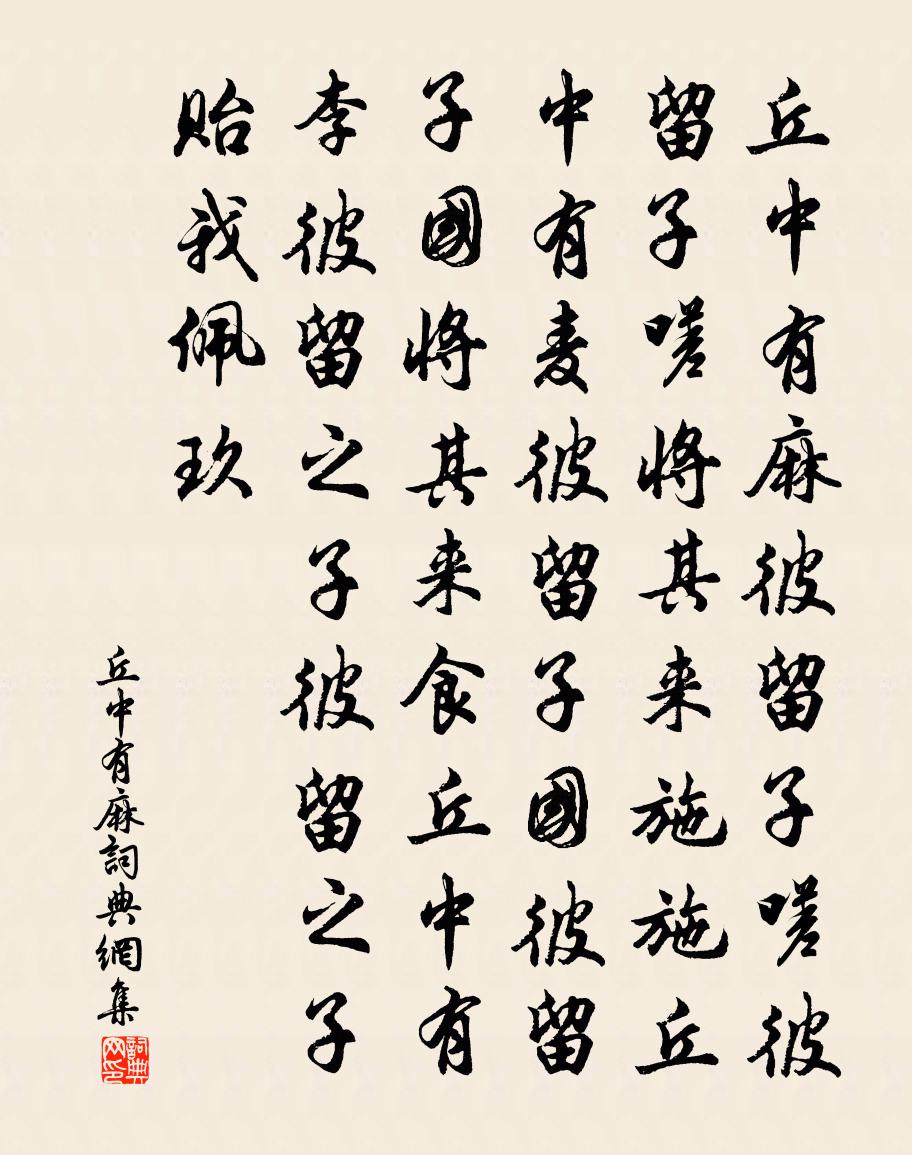 按照多數學者的說法,這是一首情詩,是以一個姑娘的口吻寫出來的。詩中提到的事件,恰恰是姑娘與情郎激情幽會的地點:“丘中有麻”“丘中有麥”“丘中有李”,那一蓬蓬高與肩齊的 * 地,那一片片密密的麥田壠間,那一棵棵綠蔭濃郁的李子樹下,都是姑娘與情郎情愛激發的地方。所以,當姑娘回味這種強烈的情愛行為時,總也忘不了那個神奇的地方。尤其是詩的第一、二章,都有“彼留子”的明確指涉。而第一章的“將其來施施”,第二章的“將其來食”,更明確地寫出,姑娘與情郎的幽會不僅僅是一次,而是多次。他們在 * 地里、小麥壠頭、李子樹下,演出過一次次激情的戲劇,付出了整個身心。他們的情愛是真實的,也是牢固的。他們並沒有追求一次性的瘋狂,而是讓純真的愛掀起一層又一層的熱浪,永久地持續。第三章的最後,寫到“彼留之子,貽我佩玖”,用物質的形式(佩玉),把非物質的關係(情愛)確定下來,以玉的堅貞純潔牢固,表示兩人的愛情的永恆。可以想像,接著下去,姑娘將與情郎共偕連理,成家育子,延續生命。一個新的家庭,將延續那一段熱烈純真的愛情。這就是姑娘在歌唱愛情時寄託的熱望。