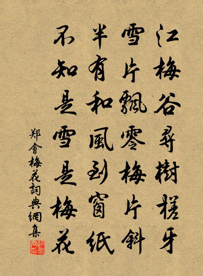 詩詞名句歷史字典書法欣賞書法字典國語詞典說文解字康熙字典古漢語字典標 題 作 者 詩 句 梅花作者:鄭會 朝代:宋代梅花原文江梅谷尋樹槎牙,雪片飄零梅片斜。半有和風到窗紙,不知是雪是梅花。詩詞問答問:梅花的作者是誰?答:鄭會問:梅花寫於哪個朝代?答:宋代鄭會梅花書法欣賞梅花書法作品詩詞推薦四威儀釋慧空〔宋代〕臥,合眼乾坤都蓋過。沒人知,晨雞剛說破。讀張文潛詩二首楊萬里〔宋代〕山谷前頭敢說詩,絕稱漱井掃花詞。後來全集教渠見,別有天珍渠得知。園田嘆四絕范成大〔宋代〕台家水利有科條,膏潤千年廢一朝。安得能言兩黃鵠,為君重唱復陂謠。溫陵吳氏瓠齋余謙一〔宋代〕大樗大椿等類,率是內篇寓言。我謂惠王瓠種,合種 * 漆園。十一月七日雪中聞宋中道與其內祥源觀燒香梅堯臣〔宋代〕三日不相見,逢人問始知。同車侵朔雪,臨水拜靈龜。絮撲鴛鴦帶,花團蛺蝶枝。如何東郭叟,足跡自穿綦。和李相公初歸平泉過龍門南嶺遙望山居即事劉禹錫〔唐代〕暫別明庭去,初隨優詔還。曾為鵬鳥賦,喜過鑿龍山。新墅煙火起,野程泉石間。岩廊人望在,只得片時閒。偈頌一百零二首釋紹曇〔宋代〕生平說大脫空,今受活地獄報。一片無骨舌頭,數日和根爛了。奉和聖制潼關口號應制張說〔唐代〕天德平無外,關門東復西。不將千里隔,何用一丸泥。別東林寺僧李白〔唐代〕東林送客處,月出白猿啼。笑別廬山遠,何煩過虎溪。生查子周紫芝〔宋代〕金鞍欲別時,芳草溪邊渡。不忍上西樓,怕看來時路。簾幕卷東風,燕子雙雙語。薄倖不歸來,冷落春情緒。賦西漢魏徵〔唐代〕受降臨軹道,爭長趣鴻門。驅傳渭橋上,觀兵細柳屯。夜宴經柏谷,朝游出杜原。終藉叔孫禮,方知皇帝尊。寄徐縣丞趙師秀〔宋代〕自爾為官去,吾扉亦返關。池成逢夜雨,籬壞出秋山。歲事登禾稼,朝綱去草菅。題書寄漳水,專俟好詩還。平湖樂·采菱人語隔秋煙王惲〔元代〕采菱人語隔秋煙,波靜如橫練。入手風光莫流轉,共留連,畫船一笑春風面。江山信美,終非吾土,問何日是歸年下第後歸永樂里自題二首趙嘏〔唐代〕無地床無媒只一床身,歸來床空拂滿床塵床。尊前盡日誰相對,唯有南山似故人。玄發侵愁忽似翁,暖塵寒袖共東游密庵致明有喜雨詩次原韻劉子翬〔宋代〕雨氣經岩上,僧窗暗復明。溪流生急響,松吹助狂傾。{左禾右罷}稏無邊潤,蘧篨一味清。仁心樂同飽,擁鼻發溪堂留題蘇軾〔宋代〕三徑縈迴草樹蒙,忽驚初日上千峰。平湖種稻如西蜀,高閣連雲似渚宮。殘雪照山光耿耿,輕冰籠水暗溶溶。溪邊送樞直梅學士守并州宋祁〔宋代〕素領登朝舊,黃樞遞直新。還持漢家節,坐福晉墟民。旆羽凌霜曉,袍花犯雪春。連雲祖壇幄,隘道舞驂塵。檄楯贈黃叔向二絕戴栩〔宋代〕常恐清吟不療時,軟弓輕劍學兵書。君今得句欹紗帢,馬上功名更莫疎。次張學錄韻十首陳造〔宋代〕學者闖聖門,贔屭未易入。鄉子用深造,以文作梯級。擢秀峰程敦厚〔宋代〕化境何年斲取還,嶄然擢秀瘴茅間。我來授記開潛閱,從此佳名溢世寰。名句推薦自昔佳人多薄命,對古來、一片傷心月。辛棄疾《賀新郎·用前韻送杜叔高》 今歲早梅開,依舊年時月。張孝祥《卜運算元·雪月最相宜》 啼時驚妾夢,不得到遼西。金昌緒《春怨 / 伊州歌》 未知生,焉知死?孔子弟子《論語·先進篇》 梧桐真不甘衰謝,數葉迎風尚有聲。張耒《夜坐·庭戶無人秋月明》 郎到斷橋須有路,儂住處,柳如金。張惠言《江城子·填張春溪西湖竹枝詞》 善欲人見,不是真善;惡恐人知,便是大惡。朱柏廬《朱子家訓·全文》 怒猊抉石,渴驥奔泉宋祁、歐陽修、范鎮、呂夏卿等《新唐書·列傳·卷八十五》 日出東南隅,照我秦氏樓。佚名《陌上桑》 別離在今晨,見爾當何秋。韋應物《送楊氏女》