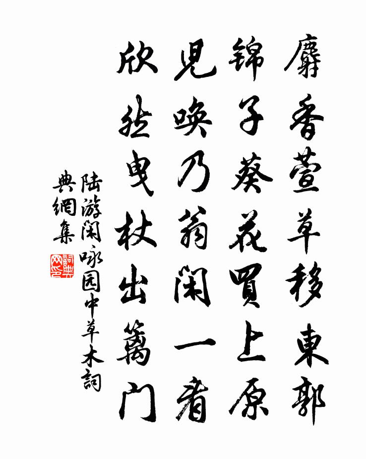 詩詞名句歷史字典書法欣賞書法字典國語詞典說文解字康熙字典古漢語字典標 題 作 者 詩 句 閒詠園中草木作者:陸游 朝代:宋代閒詠園中草木原文麝香萱草移東郭,錦子葵花買上原。兒喚乃翁閒一看,欣然曳杖出籬門。詩詞問答問:閒詠園中草木的作者是誰?答:陸游問:閒詠園中草木寫於哪個朝代?答:宋代問:陸游的名句有哪些?答:陸游名句大全陸游閒詠園中草木書法欣賞閒詠園中草木書法作品詩詞推薦步虛詞劉禹錫〔唐代〕阿母種桃雲海際,花落子城二千歲。海風吹折最繁枝,跪捧瓊□獻天帝。劉公亭王和中〔宋代〕檻外長江江外山,江光山色遠相連。人耕桑柘無窮地,鳥渡煙雲不盡天。寒日竹籠沽酒市,晚風笛起釣魚船。中夜對月小酌客愁陸游〔宋代〕今夕復何夕,素月流清輝,徘徊入我堂,化作白玉墀。棲鳥滿高樹,空庭結煙霏。可憐如許景,早眠人不知。我幸春詞絕句五首秦觀〔宋代〕風驅白雨洗園林,蔽地飛花一寸深。狂紫浪紅俱已矣,老春雖在亦何心。贈黃氏子小德陳師道〔宋代〕黃童三尺世無雙,筆頭滾滾懸秋江。不憂老子難為父,平生崛強今心降。我來喜共阿戎語,應敵縱橫如急雨。生子句呂夷簡〔宋代〕江涵帝子翬飛閣,山際真君鶴馭天。仙遊潭五首南寺蘇轍〔宋代〕澄潭下無底,將渡又安能。慣上橫空木,輕生此寺僧。曉魚聞考考,石塔見層層。不到殊非惡,他年記未曾。菩薩蠻(自宜興還西岡作)蘇庠〔宋代〕園林寂寂春歸去。蒙蒙柳下飛香絮。野水接雲橫。綠煙啼曉鶯。江南鶗鴂夢。山色朝來重。小艇小灣頭。萍花萍葉記正月二十五日西湖之游十五首方回〔宋代〕來輿去馬禁城空,豐樂樓消一炬紅。說與吳儂莫惆悵,龍墀猶化梵王宮。方水滴子万俟紹之〔宋代〕質由良冶就,心向主人傾。外倣片金制,中藏勺水清。兔毫芳露染,龍尾濕雲生。終令雙眸炯,曾窺妙女成。曉過葉家橋二首楊萬里〔宋代〕雞唱嗔人睡,鴉啼唁客勞。近山煙外遠,矮竹苣邊高。老矣猶長鋏,悠哉未大刀。繞圩無雜樹,一色柳新繅。滿庭芳 臧劉石公獻石羊索詞馬鈺〔元代〕拔山舉鼎,射虎穿楊。難同搬運青羊。悟得玄中玄妙,豁豁洋洋。自然如痴似醉,遠人情、風害猖佯。環堵里,且黃孝恭失官多作歌詩極於哀麗宋庠〔宋代〕禿瓮無版出無軒,清藻千章愬舊冤。可惜騷人能設問,皇天終不答根源。賦催妝穆修〔宋代〕嚴妝應在繡閨中,似斗春芳拆曉風。試問夭桃臨碧沼,何如艷質對青銅。初秋王同祖〔宋代〕晚趁涼颸上小樓,忽看梧葉始驚秋。悲懷無奈狂風雨,數尺歸鴉懶轉頭。小酌敬岩梅下和立齋韻王柏〔宋代〕平生手種梅,不作和羹念。其所起予者,歲寒心一片。孤芳以氣傳,萬物自形禪。暗香疎影句,知心亦已淺。雖以送趙大夫護邊(一作送趙都護赴安西)孫逖〔唐代〕外域分都護,中台命職方。欲傳清廟略,先取劇曹郎。已佩登壇印,猶懷伏奏香。百壺開祖餞,駟牡戒戎裝。青海論項賈似道〔宋代〕緊隘花班項, * 黑漆光。縱有完顏勇,終須受禍殃。春詞七首白玉蟾〔宋代〕瘦沈皤潘莫自匆,花邊有酒且從容。春三二月東風裡,鶯百千聲翠柳中。別趙叔趙蕃〔宋代〕漢廷無出右,天下舉歸心。歲晚雪霜乾,春餘桃李陰。班崇貳卿貴,掾落五溪深。勿謂無回雁,郵傳可嗣音。名句推薦一片春愁待酒澆。江上舟搖,樓上簾招。蔣捷《一剪梅·舟過吳江》 未知生,焉知死?孔子弟子《論語·先進篇》 風雨替花愁。風雨罷,花也應休。趙秉文《青杏兒·風雨替花愁》 霰淅瀝而先集,雪粉糅而遂多。謝惠連《雪賦》 清濁,小大,短長,疾徐,哀樂,剛柔,遲速,高下,出入,周疏,以相濟也。左丘明《左傳·昭公·昭公二十年》 當君懷歸日,是妾斷腸時。李白《春思》 一夜嬌啼緣底事,為嫌衣少縷金華。韋莊《與小女》 侵陵雪色還萱草,漏泄春光有柳條。杜甫《臘日》 夜來幽夢忽還鄉,小軒窗,正梳妝。相顧無言,惟有淚千行。蘇軾《江城子·乙卯正月二十日夜記夢》 秋波落泗水,海色明徂徠。李白《魯郡東石門送杜二甫》
