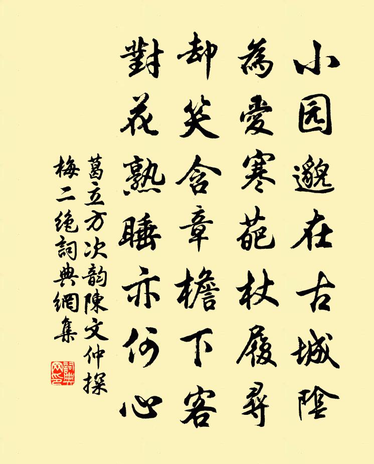 詩詞名句歷史字典書法欣賞書法字典國語詞典說文解字康熙字典古漢語字典標 題 作 者 詩 句 次韻陳文仲探梅二絕作者:葛立方 朝代:宋代次韻陳文仲探梅二絕原文小園邈在古城陰,為愛寒葩杖履尋。卻笑含章檐下客,對花熟睡亦何心。詩詞問答問:次韻陳文仲探梅二絕的作者是誰?答:葛立方問:次韻陳文仲探梅二絕寫於哪個朝代?答:宋代葛立方次韻陳文仲探梅二絕書法欣賞次韻陳文仲探梅二絕書法作品詩詞推薦送趙汝楫分教建安胡仲弓〔宋代〕又領皋比走建安,青衿喜色上眉端。詩因老去難言別,氈到春來不覺寒。當日紫陽傳授學,他年粉省校讎官。聖門借山谷後山詩編於劉宜之司戶因書所見呈宜敖陶孫〔宋代〕拾遺琴詩視孔子琴道,豫章琴配孟顏後琴山。自餘眾作等別派,彪虥貍豹虎一斑。我修直筆公萬世,議論不到甘謿奉和聖制重陽日即事武元衡〔唐代〕玉燭降寒露,我皇歌古風。重陽德澤展,萬國歡娛同。綺陌擁行騎,香塵凝曉空。神都自藹藹,佳氣助蔥蔥。律呂答文與可以六言詩相示因道濟南事作十首蘇轍〔宋代〕飲酒方橋夜月,釣魚畫舫秋風。冉冉荷香不斷,悠悠水面無窮。先君守官司醴陵日予嘗隨先生讀書嶽麓山法華鄭剛中〔宋代〕愚翁髫髦昔垂耳,曾向華台借窗幾。小冠短褐隨先生,風雨孤燈讀經史。氣粗膽大眼無人,拔擢犀象角連齒。那知朝中措 九日小集,時楊世長將赴南宮辛棄疾〔宋代〕年年團扇怨秋風。愁絕寶杯空。山下臥龍豐度,台前戲馬英雄。而今休矣,花殘人似,人老花同。莫怪東籬韻減,蒙劉元中數示東坡詩徐恢〔宋代〕無邪公文天所贊,汩汩詞源倒河漢。一篇新出紙為貴,萬國爭傳金可換。晚節投荒無芥蔕,畢景著書自娛玩。天之出關宿盤豆館對叢蘆有感李商隱〔唐代〕蘆葉梢梢夏景深,郵亭暫欲灑塵襟。昔年曾是江南客,此日初為關外心。思子台邊風自急,玉娘湖上月應沉。清聲西江月 壽杜醉經左丞劉敏中〔元代〕有道實關消長,無心不異行藏。問公獨樂醉經堂。何似凌煙閣上。畫戟清香宴寢,春風玉樹諸郎。台星明勛紫霞觴客有遺予畫梅花者淡墨暈成因命之曰梅影曹緯〔宋代〕憶昔神遊姑射山,夢中栩栩片時還。冰膚不許尋常見,故隱輕雲薄霧間。九月五日晴暖步後園范成大〔宋代〕海氣烘晴入斷霞,半空雲影界山斜。輕羅小扇游蜂畔,只比東風有菊花。秋思於石〔宋代〕遠水遙天起斷鴻,秋光冷淡客情濃。一川疏雨平沙牧,半樹斜陽隔塢舂。落葉輕於流俗態,寒花羞作少年容。憑高阿通自閩中歸甫九歲頗有老成之風作此詩示之陸游〔宋代〕通子還家已九齡,從師衿佩兩青青。長成勉作功名計,勿學衰翁老一經。自山中泛舟歸郡城陸游〔宋代〕我呼小艇浮南津,落日亂山銜半輪。背船雙鷺低掠水,下灘峭風冷逼人。中流回望始太息,煙中白塔高嶙峋。適從望江南(仆既為宋壺山說其自說未盡處,壺山必有答語,仆自嘲三解)戴復古〔宋代〕石屏老,家住海東雲。本是尋常田舍子,如何呼喚作詩人。無益費精神。千首富,不救一生貧。賈島形模元自瘦,庵中晨起書觸目陸游〔宋代〕初歸誓墓老鄉邦,手結茆茨近小江。北渚露沾行藥屐,東廂日射勘書窗。孤忠自信丹心折,萬事空成雪鬢霜。長媿書庭蕉王過仁〔明代〕檐前蕉葉綠成林。長夏全無暑氣侵。但得雨聲連夜靜。何妨月色半床陰。新詩舊葉題將遍。老調疏桐恨傳深。莫笑詠鶴周端臣〔宋代〕覓來雛鶴養經年,認得呼名傍客前。放去幾隨雲過海,歸來一片雪翻天。翎梳修竹林間日,影照寒梅澗下泉。眷戀偈頌一百二十三首釋祖欽〔宋代〕撮土成金古趙州,據人來問直相酬。聲前有意今誰委,門外一江春水流。依韻和解空長老雪頌陳襄〔宋代〕片片分明是六花,迷人只見亂如麻。窮閻處士愁穿屐,明眼高僧笑點茶。十二玉樓開閬苑,三千銀界遍河沙。解空名句推薦良藥苦口利於病,忠言逆耳利於行。宋濂、王褘《元史·列傳·卷五十五》 望以斜陽欲盡時,不見西飛雁。程垓《卜運算元·獨自上層樓》 山驛淒涼,燈昏人獨寢。陸游《清商怨·葭萌驛作》 夜雪初霽,薺麥彌望。姜夔《揚州慢·淮左名都》 扣舷獨嘯,不知今夕何夕。張孝祥《念奴嬌·過洞庭》 隋堤上、曾見幾番,拂水飄綿送行色。周邦彥《蘭陵王·柳》 故人江海別,幾度隔山川。司空曙《雲陽館與韓紳宿別》 見梨花初帶夜月,海棠半含朝雨。万俟詠《三台·清明應制》 商葉墮乾雨,秋衣臥單雲。孟郊《秋懷十五首》 生財有大道,生之者眾,食之者寡,為之者疾,用之者舒,則財恆足矣。曾子《禮記·大學》