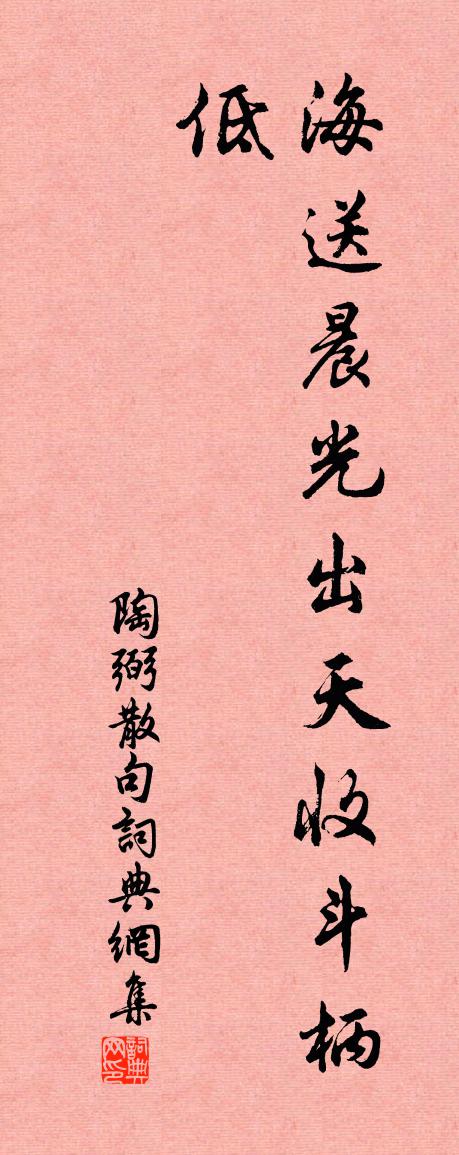 詩詞名句歷史字典書法欣賞書法字典國語詞典說文解字康熙字典古漢語字典標 題 作 者 詩 句 句作者:陶弼 朝代:宋代句原文海送晨光出,天收斗柄低。詩詞問答問:句的作者是誰?答:陶弼問:句寫於哪個朝代?答:宋代陶弼句書法欣賞句書法作品詩詞推薦惜分飛(客懷)柴元彪〔宋代〕候館天寒燈半滅。對著燈兒淚咽。此恨難分說。能禁幾度黃花別。乍轉寒更敲未歇。蛩語更添悽惻。今夜歸心切。詩曹植〔魏晉〕君王禮英賢。不吝千金璧。從容冰井台。清池映華薄。鏡離台薛濤〔唐代〕鑄瀉黃金鏡始開,初生三五月徘徊。為遭無限塵蒙蔽,不得華堂上玉台。晨起聞杜鵑趙蕃〔宋代〕水聲嘈雜蛙聲小,客子披衣坐侵曉。平生嗜懶每貪眠,行李催人未渠了。不勝倦嘆歌方苦,更聽林間杜鵑語。杜鵑平蔡州三首劉禹錫〔唐代〕蔡州城中眾心死,妖星夜落照壕水。漢家飛將下天來,馬箠一揮門洞開。賊徒崩騰望旗拜,有若群蟄驚春雷。狂童披雲亭釋文珦〔宋代〕我愛山中人,冥心信綢緞寂。危亭上絕巘,不染世人跡。群峰合空翠,疑若天宇窄。午夜獨長嘯,雲開山月白。張十八白居易〔唐代〕諫垣幾見遷遺補,憲府頻聞轉殿監。獨有詠詩張太祝,十年不改舊官銜。杞梁墓汪遵〔唐代〕一叫長城萬仞摧,杞梁遺骨逐妻回。南鄰北里皆孀婦,誰解堅心繼此來。雜興梅堯臣〔宋代〕苦楝樹,青鵓鴣。啄鹽土,鳴嗚嗚。老鴉銜茶子,爭噪落嶺隅。不覺茶滿山,漁利入江湖。鹽由鵓鴣起,茶由老鴉詰燕戴復古〔宋代〕去年汝來巢我屋,梁間污泥高一尺。啄腥拋穢不汝厭,生長群雛我護惜。家貧惠愛不及人,自謂於汝獨有力。不望禪寂之所有賣花聲出廊廡間清婉動耳孫惟信〔宋代〕曲巷深房憶帝州,賣花庭宇最風流。窗紗破曉斜開扇,簾繡籠陰半上鉤。少日喜拈春在手,暮年羞戴雪盈頭。泉南屈原祠宋祁〔宋代〕楚江南望見脩門,靈鼓聲沈蕙捲樽。五日長蛟虛望祭,九關彫虎枉招魂。蘭苕獵翠淒寒露,楓葉搖丹嘯暝猿。賈誼已亥雜詩 261龔自珍〔清代〕絕色呼他心未安,品題天女本來難。梅魂菊影商量遍,忍作人間花草看。玉樓春晏幾道〔宋代〕清歌學得秦娥似,金屋瑤台知姓字。可憐春恨—生心,長帶粉痕雙袖淚。從來懶話低眉事,今日新聲誰會意。坐中漕闈揭曉後述懷施樞〔宋代〕畫眉深淺與時殊,肯向堂前怨舅姑。自是吾儂多蹇薄,可堪爾汝肆揶揄。心知不是池中物,眼獨羞看屋上烏。得喪宴春台慢(仙呂宮)張先〔宋代〕麗日千門,紫煙雙闕,瓊林又報春回。殿閣風微,當時去燕還來。五侯池館頻開。探芳菲、走馬天街。重簾人語,偈頌十四首釋印肅〔宋代〕大家同受用此且富貴,不妨普庵一穴真風水。乾坤巽,本無位。二十四向絕遮欄,非舌頭人云心地。也無賤,也無滿庭芳 赴登州黃大醮馬鈺〔元代〕松柏岩前,煙霞洞裡,清風吹動靈苗。水升火降,大藥自然燒。歌舞相陪童稚,利名棄、不讓漁樵。忘人我,清貧秋懷二首王炎〔宋代〕朅來雲夢澤南州,風物蕭蕭兩見秋。三徑草荒真左計,一官冰冷更何求。莫招毛潁論時事,且喚曲生澆客愁。短艇久雨陸游〔宋代〕黃葉雨中盡,飢鴻煙際來。時艱歲仍惡,身死病相催。西埭無行路,南山有疾雷。囊空罷沽酒,一醉轉悠哉。名句推薦守恬淡以養道,處卑下以養德,去嗔怒以養性,薄滋味以養氣。陳繼儒《小窗幽記·集景篇》 不道愁人不喜聽。空階滴到明。万俟詠《長相思·雨》 落盡梨花春又了。滿地殘陽,翠色和煙老。梅堯臣《蘇幕遮·草》 民非谷不生。陳壽《三國志·吳書·吳主傳》 猿啼客散暮江頭,人自傷心水自流。劉長卿《重送裴郎中貶吉州》 霜降碧天靜,秋事促西風。葉夢得《水調歌頭·九月望日與客習射西園余偶病不能射》 東風吹我過湖船。楊柳絲絲拂面。張孝祥《西江月·問訊湖邊春色》 日長唯鳥雀,春遠獨柴荊。杜甫《春遠 / 春運》 綠兮絲兮,女所治兮。我思古人,俾無訧兮!佚名《綠衣》 尊前故人如在,想念我、最關情。周邦彥《綺寮怨·上馬人扶殘醉》