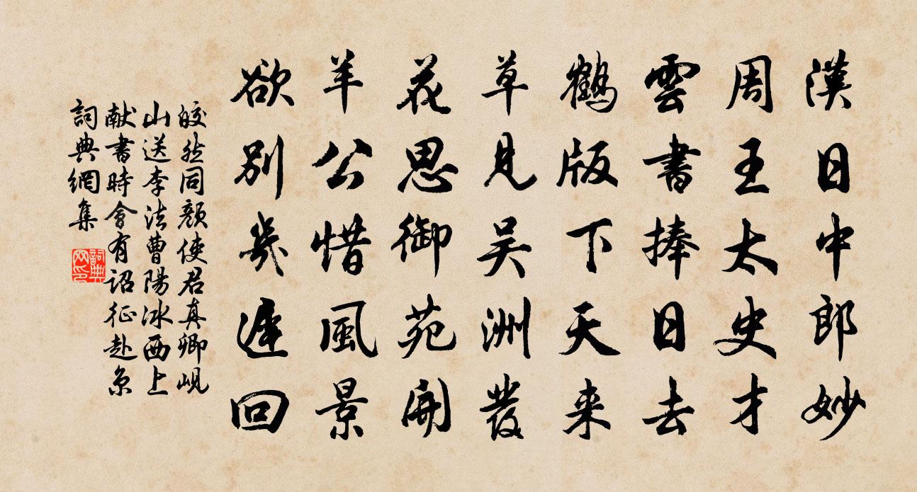 詩詞名句歷史字典書法欣賞書法字典國語詞典說文解字康熙字典古漢語字典標 題 作 者 詩 句 同顏使君真卿峴山送李法曹陽冰西上獻書時會有詔征赴京作者:皎然 朝代:唐代原文漢日中郎妙,周王太史才。雲書捧日去,鶴版下天來。草見吳洲發,花思御苑開。羊公惜風景,欲別幾遲回。詩詞問答問:《同顏使君真卿峴山送李法曹陽冰西上獻書時會有詔征赴京》的作者是誰?答:皎然問:該詩寫於哪個朝代?答:唐代書法欣賞同顏使君真卿峴山送李法曹陽冰西上獻書時會有詔征赴京書法作品注釋全唐詩:卷818-26詩詞推薦游鳴山寺徐一之兄弟載酒即席和其韻陳傅良〔宋代〕惰歸春力不勝驅,風雨尚愁人摻裾。掠盡殘紅前日樹,催還新綠去年畲。相將興盡隨花屧,賴有朋來載酒車。但得夜行船歐陽修〔宋代〕閒把鴛衾橫枕。損眉尖、淚痕紅沁。花時良夜不歸來,忍頻聽、漏移清禁。一餉無言都未寢。憶當初、是誰先恁。贈楊先輩(一作送楊之梁先輩)馬戴〔唐代〕平生閒放久,野鹿許為群。居止鄰西嶽,軒窗度白雲。齋心飯松子,話道接茅君。漢主思清淨,休書諫獵文。贈別華岳〔宋代〕惆悵長亭嘆別離,送君東去望西歸。落花也似知人意,沾定春衫不肯飛。冬曉龍輔〔宋代〕積雨帶晴霧,閨中事可夸。曙窗留鏡月,寒髻集釵花。水調歌頭石孝友〔宋代〕美人在何許,相望正悠悠。雲窗霧闔,遙想宛在海中洲。空對殘雲冷雨,何限重山疊水,一夢到無由。遺怨寫紅葉寓言二首賈至〔唐代〕春草紛碧色,佳人曠無期。悠哉千里心,欲采商山芝。嘆息良會晚,如何桃李時。懷君晴川上,佇立夏雲滋。凜凜和靈一上人新泉劉長卿〔唐代〕東林一泉出,復與遠公期。石淺寒流處,山空夜落時。夢閒聞細響,慮澹對清漪。動靜皆無意,唯應達者知。三善殿夜望山燈詩江總〔南北朝〕百花疑吐夜,四照似含春。的的連星出,亭亭向月新。採珠非合浦,贈佩異江濱。若任扶桑路,堪言並日輪。思佳客司馬遷〔兩漢〕微點胭脂暈淚痕。更衣整鬢立黃昏。春風攪樹花如雨,夕靄迷空燕趁門。題往事,錦回紋。春心無定似行雲。深屏送謝夷甫宰餘姚縣(餘姚,一作鄮縣)戴叔倫〔唐代〕君去方為宰,干戈尚未銷。邑中殘老小,亂後少官僚。廨宇經兵火,公田沒海潮。到時應變俗,新政滿餘姚。奉和竟陵王經劉瓛墓詩沈約〔南北朝〕表閭欽逸軌。軾墓禮真魂。化塗終眇默。神理曖猶存。塵經未輟幌。高衡已委門。日蕪子云舍。徒望董生園。華陰句釋從垣〔宋代〕杜琮一聲蒼樹遠,黃鸝三囀落花深。鷺鷥歐陽修〔宋代〕風格孤高塵外物,性情閒暇水邊身。盡日獨行溪淺處,青苔白石見纖鱗。山行陸游〔宋代〕七十衰翁短鬢斑,藥瓢藤杖伴清閒。平生惡路羊腸阪,晚歲羸軀飯顆山。一寸塔余青靄外,數聲鐘下翠微間。往來漫書五首司空圖〔唐代〕長擬求閒未得閒,又勞行役出秦關。逢人漸覺鄉音異,卻恨鶯聲似故山。溪邊隨事有桑麻,盡日山程十數家。莫怪金剛隨機無盡頌離色離相分第二十釋印肅〔宋代〕如來言具足,切莫外馳逐。當體即無餘,曹溪留一宿。浣溪沙(壽老母)張輯〔宋代〕夏果初收喚綠華。冰盤巧簇映金瓜。荷香飛上玉流霞。明月長留千歲色,蟠桃多結幾番花。誰知羅帶有丹砂。小至杜甫〔唐代〕天時人事日相催,冬至陽生春又來。刺繡五紋添弱線,吹葭六琯動浮灰。岸容待臘將舒柳,山意沖寒欲放梅。雲物渡江雲(小石)周邦彥〔宋代〕晴嵐低楚甸,暖回雁翼,陣勢起平沙。驟驚春在眼,借問何時,委屈到山家。塗香暈色,盛粉飾、爭作妍華。千萬名句推薦離別一何久,七度過中秋。蘇轍《水調歌頭·徐州中秋》 涉江玩秋水,愛此紅蕖鮮。李白《折荷有贈》 冷艷全欺雪,余香乍入衣。丘為《左掖梨花》 莫辭酒味薄,黍地無人耕。杜甫《羌村三首·其三》 提籠忘采葉,昨夜夢漁陽。張仲素《春閨思》 蕭條庭院,又斜風細雨,重門須閉。李清照《念奴嬌·春情》 信宿漁人還泛泛,清秋燕子故飛飛。杜甫《秋興八首》 淡中交耐久,靜里壽延長。王永彬《圍爐夜話·第一一六則》 霜草蒼蒼蟲切切,村南村北行人絕。白居易《村夜》 想到他日是那樣下場,則可以發憤矣。王永彬《圍爐夜話·第三六則》