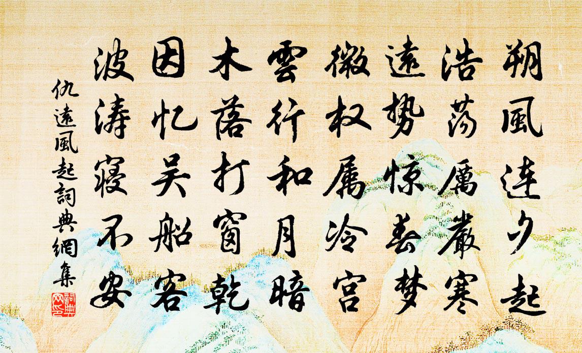 詩詞名句歷史字典書法欣賞書法字典國語詞典說文解字康熙字典古漢語字典標 題 作 者 詩 句 風起作者:仇遠 朝代:宋代風起原文朔風連夕起,浩蕩厲嚴寒。遠勢驚春夢,微權屬冷宮。雲行和月暗,木落打窗乾。因憶吳船客,波濤寢不安。詩詞問答問:風起的作者是誰?答:仇遠問:風起寫於哪個朝代?答:宋代仇遠風起書法欣賞風起書法作品詩詞推薦孔府判野耘嘗宦雲南今以余瘴多病意欲休官因方回〔宋代〕萬里蠶叢國,西南出漏天。吐蕃唐徼接,越巂漢疆連。參井星躔外,岷峨雪界邊。{左牛右羊}船元下粵,劍棧忽臨汝書院落成諸公有詩用韻艾性夫〔宋代〕魚躍鳶飛喜落成,鵝湖鹿洞共崢嶸。世無孔孟乾坤熄,學到周程日月明。議論高虛終害道,聖賢平實不爭名。光風論語絕句一百首張九成〔宋代〕不因聞見得心傳,此理於吾甚曉然。若使一流聞見里,故知厭倦有時焉。再次韻陳造〔宋代〕載羽其觴,客遄於行。歸從我私,茲焉用情。一奇搴秀,萬金論士。生世已後,識古君子。宮倡羽隨,至樂則和。內道場永讙上人就郡見訪,善說維摩經,臨別請白居易〔唐代〕五夏登壇內殿師,水為心地玉為儀。正傳金粟如來偈,何用錢唐太守詩。苦海出來應有路,靈山別後可無期。他生對雪看梅韓維〔宋代〕持梅況酒誠為得,對雪看梅始見真。失素定應潛送臘,露紅如欲巧矜春。神凝姑射今仍在,雲覆巫峰曉更新。誰識元日客中和同年韻趙必象〔宋代〕歲堂堂去逐江乾,夜半東風送舊寒。爆竹聲中人老大,梅花香外客平安。一番春事從頭起,萬里天衢著步寬。上下皇帝閣春帖子許應龍〔宋代〕金華彩勝年年巧,柏酒椒盤歲歲新。恭願吾皇千萬壽,四時無日不陽春。寄題吳子似所居二首讀書亭陳文蔚〔宋代〕古人花不可見,花千卷留遺編。要非紙上語,至理實參前。列聖精微心,舍此將何傳。極本會於一,枝葉數萬千。風雪中作白居易〔唐代〕歲暮風動地,夜寒雪連天。老夫何處宿,暖帳溫爐前。兩重褐綺衾,一領花茸氈。粥熟呼不起,日高安穩眠。是時叔父給事輓詞十首黃庭堅〔宋代〕曾發公家鉅萬錢,溝中襁褓卻生全。三齊水後皆禾稼,不殺耕牛更可傳。題譚君詩集姚勉〔宋代〕建州衣缽傳武功,山谷濠梁窺謝公。譚君之詩何自工,君家詩有冰清翁。野塘千頃涵秋風,資奩盡在奚囊中。蘇仙題潔齋書院姚穎〔宋代〕鵝湖鹿洞兩優遊,吾道南來誰與儔。鄮地傳心化已洽,堇山遺教澤長留。空階向日春風度,棟宇凌雲化雨周。聲譽游天章寺許安世〔宋代〕常時俯仰尚為陳,千載重來感一深。曲水已傷迷故跡,崇山依舊對遊人。縈紆雪路聯珠騎,蕭爽風亭岸角巾。秖恐次韻分寧羅簿贈行二首王炎〔宋代〕剛腸厭徇俗,老眼飽閱世。讀書學經綸,亦頗識一二。妄意糟粕中,啜嚌得馨旨。終然不可用,落落多左計。慨念水龍吟吳文英〔宋代〕望中璇海波新,泛槎又幣銀河轉。金風細裊,龍枝聲奏,鈞簫秋遠。南極飛仙,夜來催駕,祥光重見。紫霄承露掌廬山寇準〔宋代〕江南到處佳山水,廬阜丹霞是勝游。獨抱古琴攜竹杖,若逢絕境莫歸休。筆架山辛好禮〔宋代〕清秋山水無不宜,筆架之峰天下奇。高蟠斗極鳥先卻,幽測珠光龍未知。天清鐘磬度霄轉,月黑星河當戶垂。卻念採桑子張良臣〔宋代〕佳人滿勸金蕉葉,夜玉春溫。別後黃昏。燕子樓高月一痕。年年依舊梨花雨,粉淚空存。流水孤村。不著寒鴉也斷夢人誦詩覺省數句足成一首陳傅良〔宋代〕三人共一被,寒夜爭抽牽。一人恥不讓,起坐遲朝暄。明朝復雨雪,忍豈無春妍。四時各天運,二人正鼾眠。名句推薦長江一帆遠,落日五湖春。劉長卿《餞別王十一南遊》 招魂楚些何嗟及,山鬼暗啼風雨。元好問《摸魚兒·雁丘詞 / 邁陂塘》 望雲慚高鳥,臨水愧游魚。陶淵明《始作鎮軍參軍經曲阿作》 蓬門未識綺羅香,擬托良媒益自傷。秦韜玉《貧女》 雨中百草秋爛死,階下決明顏色鮮。杜甫《秋雨嘆三首》 貴富而不知道,適足以為患,不如貧賤。呂不韋《呂氏春秋·紀·孟春紀》 舉頭望明月,低頭思故鄉。李白《靜夜思》 新年都未有芳華,二月初驚見草芽。韓愈《春雪》 任寶奩塵滿,日上簾鉤。李清照《鳳凰台上憶 * ·香冷金猊》 天欲禍人,必先以微福驕之,要看他會受陳繼儒《小窗幽記·集醒篇》