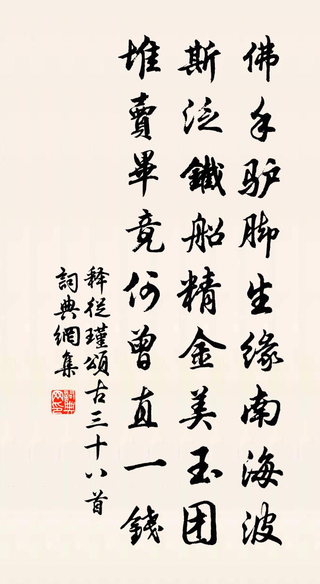 詩詞名句歷史字典書法欣賞書法字典國語詞典說文解字康熙字典古漢語字典標 題 作 者 詩 句 頌古三十八首作者:釋從瑾 朝代:宋代頌古三十八首原文佛手驢腳生緣,南海波斯泛鐵船。精金美玉團堆賣,畢竟何曾直一錢。詩詞問答問:頌古三十八首的作者是誰?答:釋從瑾問:頌古三十八首寫於哪個朝代?答:宋代釋從瑾頌古三十八首書法欣賞頌古三十八首書法作品詩詞推薦三白蘇泂〔宋代〕大雪平地尺,臘中相見三。無人堪共賞,與壁自高談。茗事工為崇,詩盟吊不鹹。夢成蝴蝶去,飛過百花岩。題狄梁公白雲圖趙希彩〔宋代〕悵望登臨日,大行山頂頭。親幃何處是,一片白雲浮。寄晁說之陳師道〔宋代〕閱世真難記,如君自不忘。尚於書太簡,正以懶相妨。與有還家樂,終無郤老方。莫須憂潦倒,未許細商量。代意刁衎〔宋代〕蕙時芳夕九迴腸,斂袂東窗待曉光。秦嶺樹高迷隴塞,楚天雲淡隔瀟湘。病餘公幹情多詠,秋晚安仁鬢足霜。休道和景仁緱氏別後見寄求決樂議雖用其韻而不依司馬光〔宋代〕至樂存要眇,失易求之難。昔從周道衰,疇人曠其官。聲律久無師,文字多缺漫。仁皇閔崩壞,廣庭集危冠。紛紜贈邢芻甫陸游〔宋代〕割愁何處有並刀,傾座誰能奪錦袍?堪笑陸翁鄰鬼錄,尚惟邢友擅人豪。杜門雖少客載酒,落筆已能奴命騷。安得十一月十五夜方回〔宋代〕竟與鰥魚似,無由濁蟻持。百為元有命,一往復何疑。殘夢終難續,深憂暗自知。鄰雛夜啼忽,吾亦憶吾兒。詠梅五十首呈史尚書釋紹嵩〔宋代〕繞樹尋花得得來,摩挲蒼石更徘徊。題詩未有驚人句,謾想華光寫照才。賀樂丈先生南郭新居范成大〔宋代〕新堂燕雀喜,竹籬掛藤蘿。崩奔風濤里,得此巢龜荷。西山效爽氣,南浦供清波。會心不在遠,容膝何須多。先生東溪言事寄于丹方乾〔唐代〕日月晝夜轉,年光難駐留。軒窗才過雨,枕簟即知秋。草際鳥行出,溪中虹影收。唯君壯心在,應笑臥滄洲。神林浦廟錢聞詩〔宋代〕廟奉神龍樂施錢,薛君矯首亦行天。為霖遍澤一千里,感夢忽符三十年。盤饌勤勤禱祠客,桅檣戢戢待風船。我來送張安國章甫〔宋代〕萬里煙霄早致身,一麾到處作陽春。隨時用舍知無慍,落筆縱橫信有神。江國雲山愁送遠,桂林風土獨宜人。笑談上丞相壽戴栩〔宋代〕萬歲千秋奉明主,坐令四海如虞唐。一門累葉凌煙閣,功業汾陽異姓王。次韻黃玉如大章攜先集來訪二首許月卿〔宋代〕橋梓風流滿腹經,桂花香里識魁名。翻成宵夢古今事,何況人間父子情。先集一編詩橐富,家傳萬卷子金榮。掛名乞雙峰山頻婆果朱翌〔宋代〕我聞如來有佛眼,結子成時速寄來。從此慈悲修廣目,得爭開處便爭開。賀大淵自資福住白雲釋大觀〔宋代〕者邊颺下舀溪杓,鈯斧又移深處山。說與白雲門外客,相逢莫作舊時看。送黃介夫李覯〔宋代〕短亭車馬地,送子一盤恆。不畏離群久,所嗟行路難。曬衣雲日薄,撲面水風酸。聖有中庸訓,時時著意看。國興招飲後圃即席賦陳文蔚〔宋代〕主人命酒嫌杯淺,狂客催詩恨句遲。此放直須詩酒領,十分春色在花枝。後園桃李花梅堯臣〔宋代〕後園桃李花,灼灼復皎皎。南枝開已繁,北枝縈尚少。蘤萼相輝映,根本自鉤繞。無為驚風吹,紛紛逐飛鳥。漁父詞(六之四)周紫芝〔宋代〕趁梅尋得水邊枝。獨棹漁船卻過溪。人似玉,醉如泥。閒歌五色線中詩。名句推薦九月寒砧催木葉,十年征戍憶遼陽。沈佺期《古意呈補闕喬知之 / 古意 / 獨不見》 宜如臨深淵,如履薄冰,戰戰慄栗,日慎一日。范曄《後漢書·本紀·光武帝紀上》 不是冤家不聚頭,冤家相聚幾時休?馮夢龍《警世通言·卷二》 上智不教而成,下愚雖教無益,中庸之人,不教不知也。顏之推《顏氏家訓·教子篇》 雨中百草秋爛死,階下決明顏色鮮。杜甫《秋雨嘆三首》 書當快意讀易盡,客有可人期不來。陳師道《絕句·書當快意讀易盡》 歌舞尊前,繁華鏡里,暗換青青發。薩都剌《念奴嬌·登石頭城次東坡韻》 更無花態度,全有雪精神。辛棄疾《臨江仙·探梅》 春蠶到死絲方盡,蠟炬成灰淚始乾。李商隱《無題·相見時難別亦難》 蕭蕭江上荻花秋,做弄許多愁。賀鑄《眼兒媚·蕭蕭江上荻花秋》