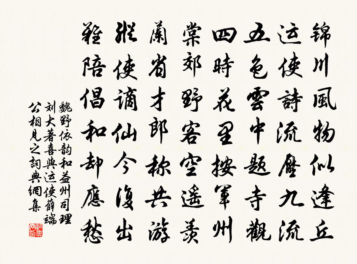 詩詞名句歷史字典書法欣賞書法字典國語詞典說文解字康熙字典古漢語字典標 題 作 者 詩 句 依韻和益州司理劉大著喜與運使薛端公相見之作者:魏野 朝代:宋代原文錦川風物似逢丘,運使詩流壓九流。五色雲中題寺觀,四時花里按軍州。棠郊野客空遙羨,蘭省才郎稱共游。縱使謫仙今復出,難陪倡和卻應愁。詩詞問答問:《依韻和益州司理劉大著喜與運使薛端公相見之》的作者是誰?答:魏野問:該詩寫於哪個朝代?答:宋代書法欣賞依韻和益州司理劉大著喜與運使薛端公相見之書法作品詩文賞析【原題】:依韻和益州司理劉大著喜與運使薛端公相見之什詩詞推薦句鄭浣〔唐代〕但慮彩色污,無虞臂胛肥。晚渡黃河駱賓王〔唐代〕千里尋歸路,一葦亂平源。通波連馬頰,迸水急龍門。照日榮光淨,驚風瑞浪翻。棹唱臨風斷,樵謳入聽喧。岸迥紹興祀高禖十首佚名〔宋代〕中春涓吉,藏事禖祠。禮備樂作,籩豆孔時。貳觴畢舉,薦獻無過。庶幾神惠,祥避熊罷。寄李簡夫宮使五首蘇泂〔宋代〕嘉言深味道之腴,啟鑰抽關許自如。顧我但將行腳誤,輸君全得病工夫。冬至前月赴季父梅花之集與韓蒲向憲唐乾諸人胡寅〔宋代〕不管霜威日夜侵,肯教飛蝶到深深。六花漫爾呈三白,一萼居然映萬林。軟玉香冰空自惱,芳心愁思遣誰禁。市橋三月三十日丘葵〔宋代〕盎盎天地春,萬物日和煦。雲胡生五穀,不若草木數。天地一小變,六龍不行雨。東皇詎忍歸,田間已焦土。□□水龍吟孔夷〔宋代〕歲窮風雪飄零,望迷萬里雲垂凍。紅綃碎翦,凝酥繁綴,煙深霜重。疏影沉波,暗香和月,橫斜浮動。悵別來,欲瑞香花董嗣杲〔宋代〕春沁幽花透骨清,矮窠殊邁百芳馨。紫英四出醉嬌粉,綠萼千攢簇巧丁。自覆薰籠須閉戶,誰栽錦傘都當庭。晝眠書嘆陸游〔宋代〕無能自號痴須老,尚健人驚矍鑠翁。未向松根藏病骨,尚尋花底 * 。翩翩孤影如歸鶴,冉冉流年付斷蓬。曾謁採桑子·恨君不似江樓呂本中〔宋代〕恨君不似江樓月,南北東西,南北東西,只有相隨無別離。恨君卻似江樓月,暫滿還虧,暫滿還虧,待得團圓是幾詠史上審配沮授陳普〔宋代〕袁曹相與隔王路,四世三公恩海深。當時惟有管寧是,謾對黃河嘆此心。蠟梅二首李石〔宋代〕莫學臥鬢花,嬌黃媚粉額。仙官道家妝,靜處立標格。丙子歲三月十有二日游嵩山宿峻極中院時天氣李廌〔宋代〕舍鞅陟層巘,老步獨多嘆。笑談谷傳響,松聲遞蕭散。欲尋草堂池,土室無僧贊。寄題儒榮堂陸游〔宋代〕軍容基禍廟謀疏,尚記文登遣使初。只道大功隨指顧,至今遺種費誅鋤。還朝不遣參麟筆,寓直空聞上石渠。剩辦桂江中題香頂台劉言史〔唐代〕岧岧香積凌空翠,天上名花落幽地。老僧相對竟無言,山鳥卻呼諸佛字。和沈次韓歷陽歸來見寄王之道〔宋代〕臘近梅爭白,冬溫柳漸黃。強吟詩思澀,幽步野情步。別去嗟何闊,歸來肯遽忘。開緘得佳句,和氣溢寒鄉。答龐參軍 其三陶淵明〔魏晉〕伊余懷人,欣德孜孜;我有旨酒,與汝樂之。乃陳好言,乃著新詩;一旦不見,如何不思!觀曹壽卿上舍詩軸題其後陳棣〔宋代〕君詩字字敵雙南,直把驪珠取次探。李杜盟寒誰共主,曹劉機淺不須參。囊中句限緣多愛,天外心歸計飽諳。讀罷上冊寶十三首真宗〔宋代〕威們皇止,庶尹在庭。爰舉徽章,遹觀厥成。勒崇揚休,寫之瓊瑛。迄於萬祀,發聞惟聲。積翠樓曾季貍〔宋代〕少日便懷丘壑情,看山看水飽曾經。如今積翠樓頭望,看盡江南未了情。名句推薦萬里橋邊多酒家,遊人愛向誰家宿。張籍《成都曲》 共看明月應垂淚,一夜鄉心五處同。白居易《望月有感》 酒債尋常行處有,人生七十古來稀。杜甫《曲江二首》 酒闌更喜團茶苦,夢斷偏宜瑞腦香。李清照《鷓鴣天·寒日蕭蕭上瑣窗》 秋草獨尋人去後,寒林空見日斜時。劉長卿《長沙過賈誼宅》 前度綠陰載酒,枝頭色比舞裙同。王沂孫《慶清朝·榴花》 感時花濺淚,恨別鳥驚心。杜甫《春望》 只恐雙溪舴艋舟,載不動許多愁。李清照《武陵春·春晚》 虛負凌雲萬丈才,一生襟抱未曾開。崔珏《哭李商隱》 富貴非榮,富貴而利濟於世者為榮。王永彬《圍爐夜話·第三一則》