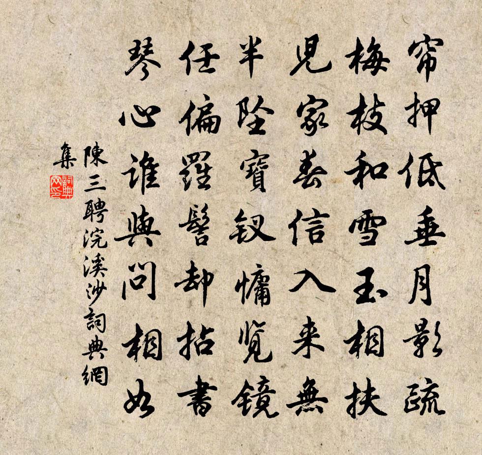 詩詞名句歷史字典書法欣賞書法字典國語詞典說文解字康熙字典古漢語字典標 題 作 者 詩 句 浣溪沙作者:陳三聘 朝代:宋代浣溪沙原文簾押低垂月影疏。梅枝和雪玉相扶。兒家春信入來無。半墜寶釵慵覽鏡,任偏羅髻卻拈書。琴心誰與問相如。詩詞問答問:浣溪沙的作者是誰?答:陳三聘問:浣溪沙寫於哪個朝代?答:宋代問:浣溪沙是什麼體裁?答:詞陳三聘浣溪沙書法欣賞浣溪沙書法作品詩詞推薦滿江紅(用韻烏朔齋)李曾伯〔宋代〕把繡成吟,真壓倒、古之元白。佳句有、雪車冰柱,曾無衿色。一點不留煙火氣,時脾時有清風入。更嶺邊、多少朝中措 寄楊漕元好問〔金代〕秋鴻社燕偶相逢。鞍馬又西東。孤負水南三月,安排萬紫千紅。舊遊新夢,綠波南浦,黃葉西風。任是麒麟閣上,望思台鄭還古〔唐代〕讒語能令骨肉離, * 難測事堪悲。何因掘得江充骨,搗作微塵祭望思。悲哉行李鹹用〔唐代〕雲色陰沈弄秋氣,危葉高枝恨深翠。用卻春風力幾多,微霜逼迫何容易。過武陵甘泉寺留題丁謂〔宋代〕翠影人疏度,波光瑟瑟凝。帝家金掌露,仙署玉壺冰。曉井侵星汲,宵廚向月澄。豈惟蠲肺渴,灌頂助三乘。惜紅衣姜夔〔宋代〕吳興號水晶宮,荷花盛麗。陳簡齋云:「今年何以報君恩,一路荷花相送到青墩。」亦可見矣。丁末之夏,予游千挽方宜人二首劉克莊〔宋代〕分斷金釵股,全遮玉鏡輝。竟令鸞獨舞,愁見雉雙飛。月照梁鴻案,塵凝孟母機。平生竺乾學,至此是真歸。喜弟觀得孫彌月數句識之陳著〔宋代〕我昔四十七,正室熊始抱。命蹇坐遲晚,不及含飴笑。今汝絕勝我,較我一年早。手撫宗嫡孫,況有眉壽老。汝心唐享昊天樂第十二武則天〔唐代〕式乾路,辟天扉。回日馭,動雲衣。登金闕,入紫微。望仙駕,仰恩徽。豐樂樓韓元吉〔宋代〕今歲西湖上,經行始此回。輕煙認花柳,細雨識樓台。春半已多日,官閒能自來。情知欠樽酒,倚杖且徘徊。小重山王哲〔元代〕失笑迷陰化不來。愚玩心鎖硬,怎生開。直饒富貴沒殃災。天年限,終久落輪迴。鬼使早相催。兒孫難替得,有何雲安玉虛觀南軒感事偶書五首杜柬之〔宋代〕對我脫粟盤,徐餐休祝鯁。嗟余何不辰,備極生人凶。偶全折脅范,屢脫南冠鍾。再醮亦何為,孫枝發枯桐。鬼猶祝家墩阻水旦起舟人云天上風花順矣作一絕晁補之〔宋代〕依依牛馬辨平沙,三日扁舟近祝家。明日揚颿應復駛,蒸雲散亂作風花。次韻朋元游王氏園范成大〔宋代〕聯翩步屧翠微間,回首紅塵自鮮歡。捲地雨添千澗急,擁門雲鎖兩山盤。絕憐茶筍能留客,仍喜蛙聲不在官。雪白太守趙山甫示和篇次韻為謝周必大〔宋代〕阿嬌金屋聚芳菲,當御銀環序妾妃。龍女墜天頩素頰,鮫人出水織纁衣。袖垂戶外瞻雙引,燕在宮中第一飛。不用答蘇子美見寄韓維〔宋代〕暮春遊京洛,適與夫子遘。衣焦未及展,挈酒且相就。佳林延涼飈,廣夏蔭清晝。浩然塵盧醒,坐看天骨秀。殷勤頌古一○一首釋子淳〔宋代〕這邊那圉總難逢,一句無私不處中。紅日暮沉西嶂外,空留孤影照溪東。酬令狐員外直夜書懷見寄楊巨源〔唐代〕花枝暖欲舒,粉署夜方初。世職推傳盛,春刑是減余。芸香能護字,鉛槧善呈書。此地從頭白,經年望雉車。菩薩蠻蘇軾〔宋代〕碧紗微露纖纖玉。朱唇漸暖參差竹。越調變新聲。龍吟徹骨清。夜來殘酒醒。惟覺霜袍冷。不見斂眉人。胭脂覓舊代陳季若上張帥林光朝〔宋代〕晉公當日只平淮,何事都人尚爾懷。客有昌黎韓吏部,獨將大筆掃蒼苔。名句推薦年去年來白髮新,匆匆馬上又逢春。于謙《立春日感懷》 專勝者未必克,挾疑者未必敗。范曄《後漢書·列傳·烏桓鮮卑列傳》 舊苑荒台楊柳新,菱歌清唱不勝春。李白《蘇台覽古》 世間花葉不相倫,花入金盆葉作塵。李商隱《贈荷花》 吾嘗跂而望矣,不如登高之博見也。荀子《荀子·勸學》 長風破浪會有時,直掛雲帆濟滄海。李白《行路難·其一》 弔影分為千里雁,辭根散作九秋蓬。白居易《望月有感》 一味學吃虧,是處事良方。王永彬《圍爐夜話·第五四則》 新人雖言好,未若故人姝。佚名《上山采蘼蕪》 城隅南對望陵台,漳水東流不復回。岑參《登古鄴城》