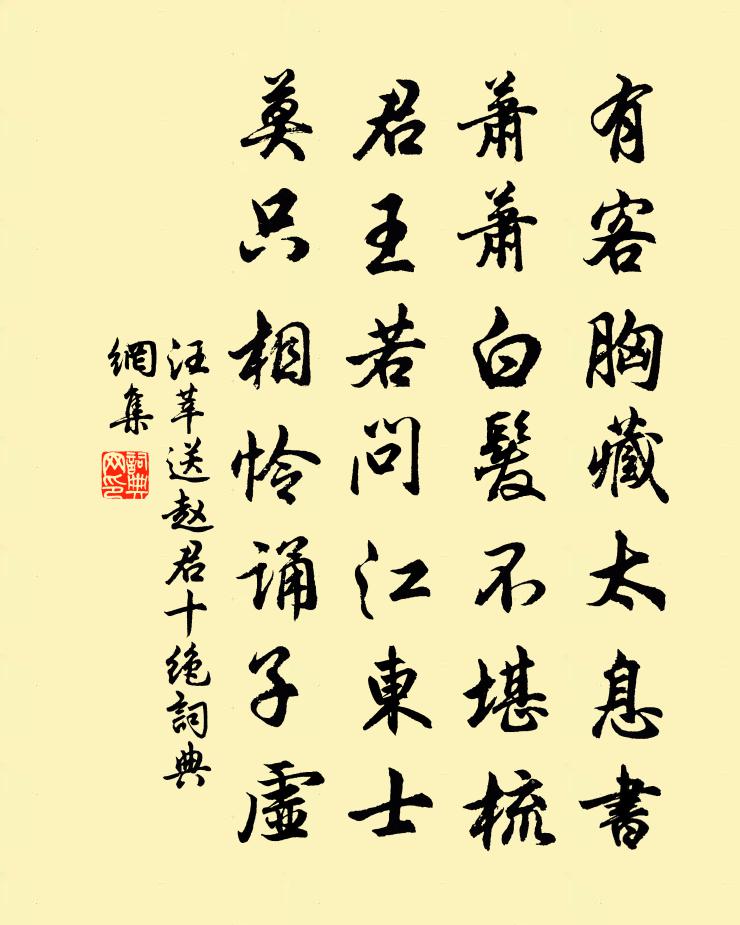 詩詞名句歷史字典書法欣賞書法字典國語詞典說文解字康熙字典古漢語字典標 題 作 者 詩 句 送趙君十絕作者:汪莘 朝代:宋代送趙君十絕原文有客胸藏太息書,蕭蕭白髮不堪梳。君王若問江東士,莫只相憐誦子虛。詩詞問答問:送趙君十絕的作者是誰?答:汪莘問:送趙君十絕寫於哪個朝代?答:宋代汪莘送趙君十絕書法欣賞送趙君十絕書法作品詩詞推薦遁跡羅隱〔唐代〕遁跡知安住,沾襟欲奈何。朝廷猶禮樂,郡邑忍干戈。華馬憑誰問,胡塵自此多。因思漢明帝,中夜憶廉頗。讀杜子美詩韓維〔宋代〕寒燈熠熠宵漏長,顛倒圖史形勞傷。取觀杜詩盡累紙,坐覺神氣來洋洋。高言大義經比重,往往變化安能常。壯哉寒夜遣懷陸游〔宋代〕臨觴本不飲,憂多自成醉。四方行萬里,不見埋憂地。憶昔入京都,寶馬搖香鬃。酣飲青樓夜,歌聲在半空。去日念奴嬌(二和)劉克莊〔宋代〕並游英俊,從頭數、富貴消磨誰紀。道眼看來,嘆人生如寄,家如旅邸。教婢羹藜,課奴種韭,聊誑殘牙齒。草堂送一老住廬山歸宗樓鑰〔宋代〕歸宗法窟寖湮微,拭眼餘風靡孑遺。法鼓一聲精彩變,要如光弼用軍時。虛舟何耕〔宋代〕君不見江乾車馬紛相送,巨艑峨峨船載重。西南使者解官歸,水淺著沙牽不動。如君材具豈多得,合侍明光參法從蒸溽作雨排悶陸游〔宋代〕柱礎生微潤,簾櫳轉薄陰。蟻遷都邑改,鳩逐怨恩深。菡萏新離水,芭蕉半展心。掩屏惟熟睡,誰與續愁吟?虎跑泉方信孺〔宋代〕破寺高僧夜不眠,一聲猛虎月明天。起來難覓新蹄跡,半滴空餘石罅泉。遠峰楊萬里〔宋代〕狐巘秀何似?碧蓮含未開。誰將修月斧,斸取一火來。漢上偶書寇準〔宋代〕謫仙唐室游茲郡,花下聽歌醉眼迷。今日漢江煙樹靜,更無人唱白銅鞮。自題讀書堂周匡物〔唐代〕窗外捲簾侵碧落,檻前敲竹響青冥。黃昏不欲留人宿,雲起風生龍虎醒。范蜀公輓詩李廌〔宋代〕眾樂西南圃,從公數共游。清無馬融帳,榮預李膺舟。河漢德星隕,山川英氣收。孤生築場意,索寞向新丘。頌古十六首釋道寧〔宋代〕前箭猶輕後箭深,行人何事苦沉吟。翻身若解看方便,始信真鍮不博金。送曾裘父張栻〔宋代〕交舊間何闊,能來浹日留。還尋佳橘頌,惜別仲宣樓。探古書盈屋,憂時雪滿頭。絕思黃閣老,招隱意綢繆。即事張鎡〔宋代〕池通幽澗碧如油,試水新鵝小拍浮。行過板橋花片落,被風邀上采菱舟。憶春日曲江宴後許至芙蓉園李紳〔唐代〕春風上苑開桃李,詔許看花入御園。香徑草中回玉勒,鳳凰池畔泛金樽。綠絲垂柳遮風暗,紅藥低叢拂砌繁。歸繞浮生吟邵雍〔宋代〕浮生曉露邊,且喜又添年。動悔須有悔,求全未必全。處人心上事,道物性中言。寰宇雖然廣,其誰曰不然。別李常侍貫休〔唐代〕楚水和煙海浪通,又擎杯錫去山東。道情雖擬攀孤鶴,詩業那堪至遠公。夢入深雲香雨滴,吟搜殘雪石林空。朱門鷓鴣天(桑雅)趙彥端〔宋代〕雲暗青絲玉瑩冠。笑生百媚入眉端。春深芍藥和煙拆,秋曉芙蓉破露看。星眼俊,月眉彎。舞狂花影上欄乾。醉來詠史陳茂呵水神周南〔宋代〕東都陳茂航海時,藐爾陽侯敢肆欺。拔劍一呼風浪息,大賢行處有天隨。名句推薦不知何處火,來就客心然。沈佺期《寒食》 江畔何人初見月?江月何年初照人?張若虛《春江花月夜》 今日暫同芳菊酒,明朝應作斷蓬飛。王之渙《九日送別》 迎天意,揣利害,不如其已。列子及其弟子《列子·力命》 淡盪春光寒食天。玉爐瀋水裊殘煙。李清照《浣溪沙·淡盪春光寒食天》 行水得其理,漂石折舟;用民得其性,則令行如流。孫臏《孫臏兵法·奇正》 新歡不抵舊愁多,倒添了、新愁歸去范成大《鵲橋仙·七夕》 親所好,力為具。親所惡,謹為去。李毓秀《弟子規·入則孝》 背法而治,此任重道遠而無馬、牛,濟大川而無舡、楫也。商鞅《商君書·弱民》 清娥畫扇中,春樹鬱金紅。溫庭筠《清明日》