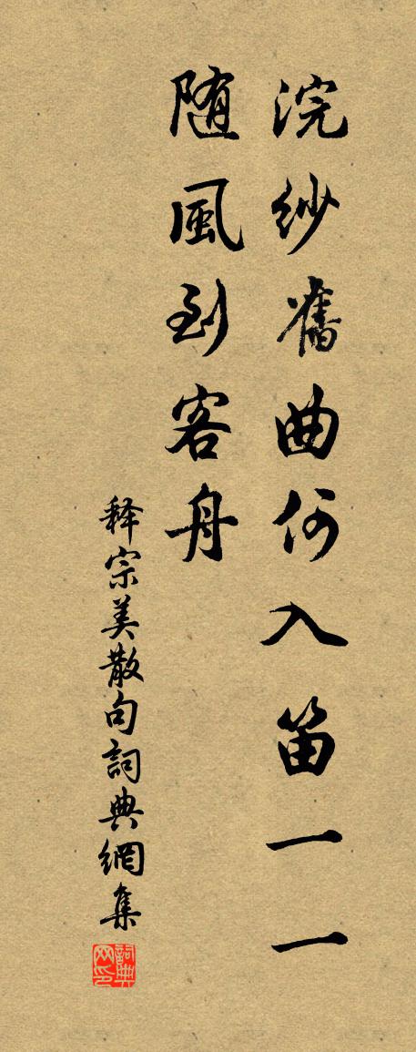 詩詞名句歷史字典書法欣賞書法字典國語詞典說文解字康熙字典古漢語字典標 題 作 者 詩 句 句作者:釋宗美 朝代:宋代句原文浣紗舊曲何入笛,一一隨風到客舟。詩詞問答問:句的作者是誰?答:釋宗美問:句寫於哪個朝代?答:宋代釋宗美句書法欣賞句書法作品詩詞推薦王大卿輓詞三首釋寶曇〔宋代〕少日佳公子,中年古吏師。霜嚴公事畢,韻勝客杯遲。詩律曹劉上,心期籍湜知。用公渾不盡,一世有餘悲。扇白玉蟾〔宋代〕懷袖相忘去不能,也知輕薄惡蚊蠅。南風雖汝持權柄,只恐秋風見汝憎。曉雪陸游〔宋代〕觀雪剡溪天下勝,題詩常恨不能奇。未應便許凝之語,此興何曾有盡時?句陳越〔宋代〕擁路東方騎,懸腰左顧龜。點絳唇趙師俠〔宋代〕日暖風喧,殿春瓊蕊依台榭。雪堆花架。不用丹青寫。瑩徹精神,映月唯宜夜。幪香帕。倩風扶下。碎玉殘妝卸。同熊少府題盧主簿茅齋(廬兼有人倫)高適〔唐代〕虛院野情在,茅齋秋興存。孝廉趨下位,才子出高門。乃繼幽人靜,能令學者尊。江山歸謝客,神鬼下劉根。階樹山中吟陳允平〔宋代〕三冬氣凜冽,獨立千崖雪。橫斜溪上梅,影落溪橋月。依韻和公濟寄仲靈禪老強至〔宋代〕藤州大士兩眉龐,萬卷叢身寄一窗。詩力健能支倒岳,詞源涌可截奔江。高名聳動朝中士,舊隱荒蕪嶺外邦。想像欹枕釋文珦〔宋代〕徹底清閒住草堂,更無一事可商量。時時欹枕寒窗下,靜看西山白鷺行。八聲甘州(送春)劉將孫〔宋代〕又江南、三月更明朝,便已是南風。擬強駐韶光,狂追柳絮,臥占殘紅。早向尊前沈醉,莫聽五更鐘。贏得春工笑靈谿賦雙流郭信可隱居何耕〔宋代〕幽居定何如,頗恨未見之。主人向我言,喜色融雙眉。修篁流翠陰,寒溪漾清漪。領略非一狀,幽妍發餘姿。空濛次韻俞路分見寄朱翌〔宋代〕有田二頃復何求,長恐斯言久不酬。青篛正堪煙雨笠,白文終返水雲裘。相親多謝風標子,可款豈無瀟灑侯。更下樗散釋文珦〔宋代〕樗散不任用,居然老空林。柴門絕車馬,徑草三尺深。靜對西山雲,頗覺諧素心。此外非所知,誰言有華簪。西江月黃庭堅〔宋代〕月,小舟坐水眠空。霧窗春色翠如蔥。睡起雲濤正擁。。往事回頭笑處,此生彈指聲中。玉箋佳句敏驚鴻。聞道衡瑞鷓鴣 居庵馬鈺〔元代〕閒人相訪有何妨。唯恐閒人話短長。真樂真閒無議論,至微至妙絕商量。是非欲說氣神散,名利讒言道德忘。不若郊廟歌辭。五郊樂章。青帝角音魏徵〔唐代〕鶴雲旦起,鳥星昏集。律候新風,陽開初蟄。至德可饗,行潦斯挹。錫以無疆,蒸人乃粒。閿鄉寓居十首山禽吳融〔唐代〕碧嶂為家煙外棲,銜紅啄翠入芳蹊。可能知我心無定,頻裊花枝拂面啼。題河清縣廨游酢〔宋代〕小院閒亭長薜蘿,鹿木穿徑晚徑過。夕陽蕭散簿書少,窗里南山明月多。嘉泰昭陽大淵獻築室董孝君祠之西下有湖焉某楊簡〔宋代〕惜也天然一段奇,如何萬古罕人知。只今步步雲生足,底用思為底用疑。舟行觀新月張鎡〔宋代〕一痕如掐夕天涯,望轉青林出沒時。不是山高愛藏月,月光猶嫩怯人窺。名句推薦至誠之道可以前知。國家將興,必有禎祥;國家將亡,必有妖孽。子思《中庸·第二十四章》 別有幽愁暗恨生,此時無聲勝有聲。白居易《琵琶行 / 琵琶引》 我有一罇酒,欲以贈遠人。佚名《舊題蘇武詩 / 別詩四首·其一》 學不精勤,不如不學 。令狐德棻《周書·列傳·卷二十五》 歌沉玉樹,古寺空有疏鍾發。李綱《六么令·次韻和賀方回金陵懷古鄱陽席上作》 是數人之齒,而以為富。墨子《墨子·48章 公孟》 浮雲終日行,遊子久不至。杜甫《夢李白二首·其二》 夫惜草茅者耗禾穗,惠盜賊者傷良民。韓非及後人《韓非子·難二》 福無雙至,禍不單行。張南莊《何典·第三回》 今人不見古時月,今月曾經照古人。李白《把酒問月·故人賈淳令予問之》