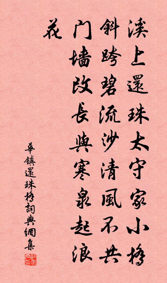 詩詞名句歷史字典書法欣賞書法字典國語詞典說文解字康熙字典古漢語字典標 題 作 者 詩 句 還珠橋作者:華鎮 朝代:宋代還珠橋原文溪上還珠太守家,小橋斜跨碧流沙。清風不共門牆改,長與寒泉起浪花詩詞問答問:還珠橋的作者是誰?答:華鎮問:還珠橋寫於哪個朝代?答:宋代問:還珠橋是什麼體裁?答:七絕華鎮還珠橋書法欣賞還珠橋書法作品詩詞推薦竹黃大受〔宋代〕虛心懷月明,勁節挺玉立。豈是外春風,春風無處入。月上海棠 嗚鶴餘音卷二劉鐵冠〔元代〕全真辦下無空過,布袍麻*腋袋掛。剪髮*頭,逍遙自在行踏。簞瓢把。每日沿門乞化。低頭稽首才道罷。又撞著清心鏡 贈小李仙馬鈺〔元代〕李宜僧,僧學道。道要玄機,日常尋討。討論得、常淨常清,清心意最好。好降心,心塵掃。掃除淨,自是通明秘最高樓 吾擬乞歸,犬子以田產未置止我,辛棄疾〔宋代〕吾衰矣,須富貴何時?富貴是危機。暫忘設醴抽身去,未曾得米棄官歸。穆先生,陶縣令,是吾師。待葺個、園兒懷西峰隱者周賀〔唐代〕灌木藏岑色,天寒望即愁。高齋何日去,遠瀑入城流。臘近溪書絕,燈殘夜雪稠。邇來相憶處,枕上苦吟休。送陳子歸陸渾別業岑參〔唐代〕雖不舊相識,知君丞相家。故園伊川上,夜夢方山花。種藥畏春過,出關愁路賒。青門酒壚別,日暮東城鴉。白頭吟邵雍〔宋代〕五福雖難備,三殤卻不逢。太平無事日,得作白頭翁。登雲錦閣有感錢聞詩〔宋代〕雲錦同梯得舊遊,旋供簾月泛瓊甌。莫言官事兼私事,五老峰前一醉休。偈釋曉純〔宋代〕有個漢自從曠大劫,無住亦無依,上無片瓦蓋頭,下無寸土立足。朝到西天,暮歸東土。偈頌六十首釋曇華〔宋代〕一莖兩莖斜,其意毒如蛇。三莖四莖曲,無疑入地獄。言下若知非,心空及第歸。堪笑蔣山老,無端入荒草。春日有感孟郊〔唐代〕雨滴草芽出,一日長一日。風吹柳線垂,一枝連一枝。獨有愁人顏,經春如等閒。且持酒滿杯,狂歌狂笑來。再次韻趙僉判投贈項安世〔宋代〕天街何日雨雲乾,夢想王孫白玉顏。一日能從晦嚴子,十年不負會稽山。吟詩可但師唐白,服禮終期類漢間。萬事秋風梅堯臣〔宋代〕秋風不饒物,斗至聲已惡。青林葉尚繁,雖好將恐落。人意誠愛惜,節候肯相若。白髮無再玄,盛衰茲可度。送鄭道人歸羅浮白玉蟾〔宋代〕鐵作橋樑雲作蓋,石成樓觀水成簾。歸時猿鶴煩傳語,記取前回白玉蟾。菩薩蠻(送鄭守厚卿赴闕)辛棄疾〔宋代〕送君直上金鑾殿。情知不久須相見。一日甚三秋。愁來不自由。九重天一笑。定是留中了。白髮少經過。此時愁奈春酌王鎡〔宋代〕酒闌歌罷翠簾遮,午夜烏啼月未斜。多少斷雲心上事,結成香夢是梨花。茅山雨中張堅〔宋代〕疏疏霧雨閟朝晴,不那浮雲先自生。傳語洞靈休勒駕,而今逋客已歸耕。雜述林泳〔宋代〕祝柱客曾興刺,斲窗史亦留名。我見諸相非相,天何不鳴善鳴。詠蒲鞋劉章〔唐代〕吳江浪浸白蒲春,越女初挑一樣新。才自繡窗離玉指,便隨羅襪上香塵。石榴裙下從容久,玳瑁筵前整頓頻。今日至德三年春正月時謬蒙差攝海鹽令聞王師收二京…五十韻劉長卿〔唐代〕天上胡星孛,人間反氣橫。風塵生汗馬,河洛縱長鯨。本謂才非據,誰知禍已萌。食參將可待,誅錯輒為名。萬里名句推薦婿為燕國王,身被詔獄加。李白《秦女休行》 天蒼蒼,野茫茫。風吹草低見牛羊。佚名《敕勒歌》 夫禮之初,始諸飲食戴聖《禮記·禮運》 涓涓不壅,終為江河佚名《孔子家語·觀周》 見而不見,聞而不聞,知而不知。韓非及後人《韓非子·主道》 對菱花、與說相思,看誰瘦損。陸叡《瑞鶴仙·梅》 無半點閒愁去處,問三生醉夢何如。喬吉《折桂令·七夕贈歌者》 田園寥落干戈後,骨肉流離道路中。白居易《望月有感》 以若所為,求若所欲,猶緣木而求魚也。孟子《孟子·梁惠王章句上·第八節》 但願人長久,千里共嬋娟。蘇軾《水調歌頭·丙辰中秋》