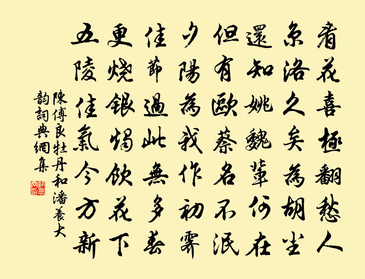 詩詞名句歷史字典書法欣賞書法字典國語詞典說文解字康熙字典古漢語字典標 題 作 者 詩 句 牡丹和潘養大韻作者:陳傅良 朝代:宋代牡丹和潘養大韻原文看花喜極翻愁人,京洛久矣為胡塵。還知姚魏輩何在,但有歐蔡名不泯。夕陽為我作初霽,佳節過此無多春。更燒銀燭飲花下,五陵佳氣今方新。詩詞問答問:牡丹和潘養大韻的作者是誰?答:陳傅良問:牡丹和潘養大韻寫於哪個朝代?答:宋代陳傅良牡丹和潘養大韻書法欣賞牡丹和潘養大韻書法作品詩詞推薦走筆和曾無逸掌故約觀玉照堂梅詩六首張鎡〔宋代〕才晴便是看花時,休問花名是阿誰。藉使無梅桃杏在,但能來賞莫嫌遲。過金牛自勞李新〔宋代〕帖險緣虛知幾蟠,小山細水入平寬。云何癭婦翻相笑,土木形骸亦屬官。和陳藥房納涼林尚仁〔宋代〕貪涼分石坐,野服岸巾紗。竹暗鳴風葉,溪暄聚水花。深村人語靜,高樹鳥飛斜。不飲論文酒,敲碁煮夜茶。導引(一曲·虞主回京雙調四曲)范祖禹〔宋代〕思齊文母,盛烈對皇天。演寶祚千年。卿雲復旦治功全。厭人世登仙。龍輿忽掩三川。彩仗屬車旋。維清象舞告英鬥百草晁補之〔宋代〕別日常多,會時常少天難曉。正喜花開,又愁花謝,春也似人易老。慘無言、念舊日朱顏,清歡莫笑。便苒苒如雲次韻用學禮許月卿六〔宋代〕章泉姓字馥於梅,宅相相逢亦妙哉。見說章泉詩刻梓,幸分一本洗塵埃。春曉東郊送客陸游〔宋代〕雨餘氣清潤,迨我送客時。翻翻車蓋風,五里城東陂。初旭斂花房,晨露流桐枝。南山卷濕翠,更覺光景奇。澄潭寒甚晁說之〔宋代〕二月春風著意來,氈裘北客尚低回。只應是日無何遜,江上梅花未肯開。和王中書德充詠白雲詩沈約〔南北朝〕白動自帝鄉。氛氳屢回沒。蔽虧崑山樹。含吐瑤台月。秋風西北起。飄我過城闕。城闕已參差。白雲復離離。皎潔挽張主簿李流謙〔宋代〕嘗聞種德如種木,百年培壅猶不足。君看牛羊踐履行,豈有寸椽撐破屋。我方撮發訪耆舊,已妝定國多陰德。昆峰點絳唇(呈洛濱、筠溪二老)張元乾〔宋代〕清夜沈沈,暗蛩啼處檐花落。乍涼簾幕。香繞屏山角。堪恨歸鴻,情似秋雲薄。書難托。盡交寂寞。忘了前時約。三十六灣許渾〔唐代〕縹緲臨風思美人,荻花楓葉帶離聲。夜深吹笛移船去,三十六灣秋月明。念奴嬌·春雪詠蘭陳子龍〔明代〕問天何意,到春深、千里龍山飛雪?解佩凌波人不見,漫說芷珠宮闕。楚殿煙微,湘潭月冷,料得都攀折。嫣然幽採桑曲曹勛〔宋代〕鳴鳩初拂羽,桑葉破新萌。采采不盈菊,攀多力未生。春服浥朝露,曉日映妝明。語學流鶯巧,身同飛燕輕。使君南屏山董嗣杲〔宋代〕南有屏山掩翠扉,齊雲亭子漫尋基。雨淋米老琴台字,火烈溫公易卦碑。回首金魚誰撫檻,銷魂白骨自污池。春風和葉樞相送芍藥姜特立〔宋代〕平生出處半參辰,胸臆今朝獲生陳。二老白頭欣得侶,千枝紅艷欲無春。已拚把酒同中聖,況是司花別有神。來歲一絡索·送蜀守蔣龍圖陳鳳儀〔宋代〕蜀江春色濃如霧。擁雙旌歸去。海棠也似別君難,一點點、啼紅雨。此去馬蹄何處。沙堤新路。禁林賜宴賞花時,糖多令 中秋朱唏顏〔元代〕涼影下青鸞。晴空瀉素盤。漾玉壺、千頃多寬。老桂散香風露淨,霜免瑩,骨毛寒。老子倚闌乾。不辭終夜看。有三山杜門作歌陸游〔宋代〕我生學步逢喪亂,家在中原厭奔竄。淮邊夜聞賊馬嘶,跳去不待雞號旦。人懷一餅草間伏,往往經旬不炊爨。鳴呼舞鶴亭歌真德秀〔宋代〕舞鶴亭空亭,無鶴胡為名。亦如西山賦招鶴,無鶴可招也不惡。何必玄裳縞袖二八真娉婷,想像標緻便足使人毛骨名句推薦權,然後知輕重;度,然後知長短。孟子《孟子·梁惠王章句上·第八節》 馬色雖不同,人心本無隔。李白《君馬黃》 種田人,改習塵市生涯,定為敗路;讀書人,乾與衙門詞訟,便入下流。王永彬《圍爐夜話·第六十則》 澹月梨花,借夢來、花邊廊廡。史達祖《解佩令·人行花塢》 借與門前磐石坐,柳陰亭午正風涼。范成大《夏日田園雜興》 坐上別愁君未見,歸來欲斷無腸。蘇軾《臨江仙·送王緘》 狗馬飾雕文,土木被緹繡。范曄《後漢書·列傳·宦者列傳》 又莫是東風逐君來,便吹散眉間一點春皺蘇軾《洞仙歌·詠柳》 不信妾腸斷,歸來看取明鏡前。李白《長相思三首》 大哉,時之相生也!達者可與幾矣。王通《中說·卷五·問易篇》