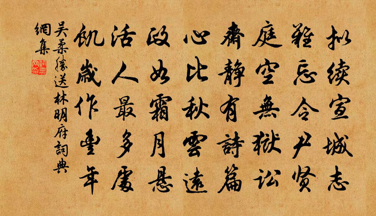 詩詞名句歷史字典書法欣賞書法字典國語詞典說文解字康熙字典古漢語字典標 題 作 者 詩 句 送林明府作者:吳柔勝 朝代:宋代送林明府原文擬續宣城志,難忘令尹賢。庭空無獄訟。齋靜有詩篇。心比秋雲遠,政如霜月懸。活人最多處,飢歲作豐年。詩詞問答問:送林明府的作者是誰?答:吳柔勝問:送林明府寫於哪個朝代?答:宋代吳柔勝送林明府書法欣賞送林明府書法作品詩詞推薦大水二首黃公度〔宋代〕巨浸滔天后,遺黎復業初。桑田皆變海,老稚半為魚。鑿石開新道,行人問故廬。客愁那對此,搔首重欷噓。白首陸游〔宋代〕白首稱祠吏,清時作幸民。招呼林下客,遊戲夢中身。山路烏騾穩,煙波畫楫新。村村有花柳,無事即尋春。燕來韋莊〔唐代〕去歲辭巢別近鄰,今來空訝草堂新。花開對語應相問,不是村中舊主人。次韻陳廷藻戶部西湖快目堂之集葛立方〔宋代〕冰壺影裹集朋從,三雅同傾共一中。相與文楸看飛雹,不須舞袖覓驚鴻。雲邊鳥道古來寺,煙際漁舟何處翁。竟日暮春晃沖之〔宋代〕濺濺流水曲穿沙,林葉深深不過鴉。自恨春來渾不識。殷勤著地拾殘花。舟中大醉偶賦長句陸游〔宋代〕過江何敢號高流,偶與俗人風馬牛。畫楫新搖嚴瀨月,清尊又醉戴溪秋。壯心無復在千里,老氣尚能橫九州。古寺殺虎行楊維楨〔元代〕劉平鬼妻胡氏,鬼從平戍零鬼陽。平為鬼虎擒,胡殺虎爭夫。千載義烈,有足歌者,為賦是章。夫從軍,妾從主。無題二首劉克莊〔宋代〕季世讎相復,先賢量有餘。潞還子方謫,坡答致中書。唐末五代人語佚名〔唐代〕及第不必讀書,作官何須事業。賦梅謝洪〔宋代〕朔風颼颼著古梅,寒枝冷落俟春回。可憐雪萼無人問,乞借陽和早放開。僊游閣陸游〔宋代〕張公一去二百載,傑閣依然橫靄中。徙倚看碑仍看畫,時聞柏子落秋風。寒食日作溫庭筠〔唐代〕紅深綠暗徑相交,抱暖含芳披紫袍。彩索平時牆婉娩,輕球落處晚寥梢。窗中草色妬雞卵,盤上芹泥憎燕巢。自有行年陸游〔宋代〕行年過七十,與世兩相忘。墨沼龜魚樂,藥園芝術香。吾生一蟲臂,世路幾羊腸。楮弁新裁就,翛然學道裝。宿京江口期劉昚虛不至王昌齡〔唐代〕霜天起長望,殘月生海門。風靜夜潮滿,城高寒氣昏。故人何寂寞,久已乖清言。明發不能寐,徒盈江上尊。奉同鄰幾對韓維〔宋代〕時律迎陽近,天雲帶雪低。欲飛含氣象,忽散失端倪。絳闕明先曙,清衢凍不泥。休祥占歲序,佳氣動烝黎。矯若感興孫嵩〔宋代〕清風有佳意,逢者為一娛。曾不救饑渴,政爾飄襟裾。凡物貴有用,論詩用則無。詩成亦自詠,侘傺或昭蘇。身名東流頓令罷官阻風示文有按風伯奏天閽之語答王安石〔宋代〕令尹犀舟失去期,憮然憑几占文移。勸君慎莫讒風伯,會有開帆破浪時。登江華寒亭樂雷發〔宋代〕到此腳跟酸,千峰迥不看。年深碑字淺,日薄樹陰寒。石罅巢蜂乳,籬根墮鳥殘。愛吟還畏嶮,不敢倚欄乾。酬李景章先輩馬戴〔唐代〕平生詩句忝多同,不得陪君奉至公。金鏑自宜先中鵠,鉛刀甘且學雕蟲。鶯啼細柳臨關路,燕接飛花繞漢宮。九陌株林張耒〔宋代〕九寡奔亡一老姬,白頭蠻叟嬖西施。二公費盡平生事,深屋嬋娟世得知。名句推薦身多疾病思田裡,邑有流亡愧俸錢。韋應物《寄李儋元錫》 病骨支離紗帽寬,孤臣萬里客江乾。陸游《病起書懷》 雨過一蟬噪,飄蕭松桂秋。杜牧《題揚州禪智寺》 先到為君,後到為臣。佚名《增廣賢文·上集》 被冷香消新夢覺,不許愁人不起李清照《念奴嬌·春情》 游女昔解佩,傳聞於此山孟浩然《萬山潭作》 路逢俠客須呈劍,不是才人莫獻詩。佚名《增廣賢文·上集》 行出於己,名生於人。佚名《逸周書·卷六·諡法解》 蟲有虺者,一身兩口,爭食相齕遂相殺也,人臣之爭事而亡其國者,皆虺類也。韓非及後人《韓非子·說林下》 外游者,求備於物;內觀者,取足於身。列子及其弟子《列子·仲尼》