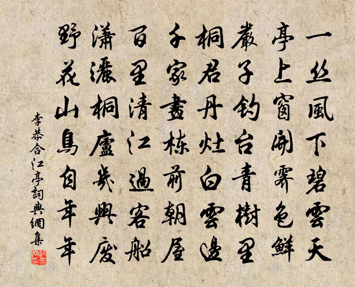 詩詞名句歷史字典書法欣賞書法字典國語詞典說文解字康熙字典古漢語字典標 題 作 者 詩 句 合江亭作者:李恭 朝代:宋代合江亭原文一絲風下碧雲天,亭上窗開霽色鮮。嚴子釣台青樹里,桐君丹灶白雲邊。千家畫棟前朝屋,百里清江過客船。瀟灑桐廬幾興廢,野花山鳥自年年。詩詞問答問:合江亭的作者是誰?答:李恭問:合江亭寫於哪個朝代?答:宋代李恭合江亭書法欣賞合江亭書法作品詩詞推薦觀鳳池橋上樑陳宓〔宋代〕溪自清如鏡,官那束似羈。不因乘小舫,還得賦新詩。邑肇千家聚,梁成萬世基。令慚無小補,刻石欲何詞。題單令雙清閣胡寅〔宋代〕中扃有天游,一室四海見。倘無空虛地,六鑿互爭戰。琴堂故蕭爽。向也正牆面。棘茨莽蒙蔽,鼷鼠紛旋轉。劃除句丁謂〔宋代〕即席椒花頌,延年柏葉觴。大晟府擬撰釋奠十四首佚名〔宋代〕道同乎天,人倫之至。有鄉無窮,其興萬世。既潔斯牲,粢明本旨。不懈以忱,神之來暨。次韻道祖書懷葛立方〔宋代〕白雲深處縛柴荊,一壑灣環似有情。志氣蕭娘並呂姥,年華張丈與殷兄。濁賢清聖時同酌,上尾平頭得共評。莫問長相思曹鄴〔唐代〕翦妾身上巾,贈郎傷妾神。郎車不暫停,妾貌寧長春。春天無停雪,滄海無停津。遣妾空床夢,夜夜隨車輪。山居雜詩九十首曹勛〔宋代〕小圃養春色,乘時不可緩。翌鋤常于于,成趣須旦旦。花摘去年種,喜供一時玩。舉杯付歌兒,野服更蕭散。賀聖朝佚名〔宋代〕太平宮無事,四宮邊寧靜狼宮煙眇。國泰民安,謾說堯舜禹湯好。萬民翹望彩都門,龍燈鳳燭相照。只聽得教坊雜書小窗所見劉克莊〔宋代〕乾接枝分整復斜,隨緣裝點野人家。小窗有喜無人見,蘭在林中出一花。和答詩十首。答四皓廟白居易〔唐代〕天下有道見,無道卷懷之。此乃聖人語,吾聞諸仲尼。矯矯四先生,同稟希世資。隨時有顯晦,秉道無磷緇。秦皇題馬遠四景圖內院官〔宋代〕花前靜榻間眠處,竹下明窗獨坐時。著甚語言名定泰,林間自有翠禽知。一霎催花細雨回,集芳堂下錦千堆。浪紅秋雨歡虞儔〔宋代〕少昊欲行秋,驕陽猶跋扈。炎蒸不易滌,頗費天人雨。浸淫三日霖,雲氣政旁午。所慮早禾傷,佳實臥場圃。翻思次韻良佐歇心歌三首陶夢桂〔宋代〕隨意栽培花幾窠,梅坡安穩即鑾坡。土尊豈勝茅柴酒,法曲何如欸乃歌。著意事無虛事有,快行時少坐時多。閒身題醉翁圖釋文珦〔宋代〕所畫者誰子,將非高陽兒。滿腹常貯酒,何異於鴟夷。陶陶以自樂,禮法不可縻。釀酒用老瓦,漉酒脫接?。寧復澗雨鄭樵〔宋代〕飄飄雨色亂,終日悞聞聲。釣客呼持笠,牧童喜啜羹。輕香樹下滿,餘響谷中清。為謝登臨者,枕流洗耳傾。菩薩蠻晁補之〔宋代〕玉京不許塵容到。疏慵只合疏慵老。鷗鳥共煙波。田夫與醉歌。忘懷無物我。莫似陳驚坐。勳業付長閒。西山爽氣滿庭芳 藏頭拆字劉處玄〔元代〕寸明,真靈通慧,無掛礙清涼。華混世,人笑似風狂。祖丘劉譚馬,消滅、萬慮俱忘。猿住,通道德,豈肯外昭彰滿庭芳(次仁和韻,時欲之官永興)黃機〔宋代〕二十年間,舊遊蹤跡,夢飛嶽麓湘灣。征衫再理,秋老菊花天。為客問君何好,愛水光、山色爭妍。經行處,旗亭過行慶關宋庠〔宋代〕洛鄭東西接,河山表里雄。嶺回千樹出,天轉兩崖通。虎圈周原綠,敖倉漢粟紅。今無楊仆恥,四海是關中。寓京口四首答湯菊莊兼簡分司鄭料院鶻山武衍〔宋代〕屹然孤石蘚痕青,千古江湍洗不平。蒼鶻飛來復飛去,不知身為此山名。名句推薦石欄斜點筆,桐葉坐題詩杜甫《重過何氏五首》 人患志之不立,亦何憂令名不彰邪?劉義慶《世說新語·自新》 善謀生者,但令長幼內外,勤修恆業,而不必富其家王永彬《圍爐夜話·第九則》 蘭溪三日桃花雨,半夜鯉魚來上灘。戴叔倫《蘭溪棹歌》 同是天涯淪落人,相逢何必曾相識!白居易《琵琶行 / 琵琶引》 小樓昨夜又東風,故國不堪回首月明中。李煜《虞美人·春花秋月何時了》 霜雪兮漼溰,冰凍兮洛澤。王逸《九思》 青山橫北郭,白水繞東城李白《送友人》 紫菊宜新壽,丹萸辟舊邪。趙彥昭《奉和九日幸臨渭亭登高應制》 慨當初,倚飛何重,後來何酷。文徵明《滿江紅·拂拭殘碑》