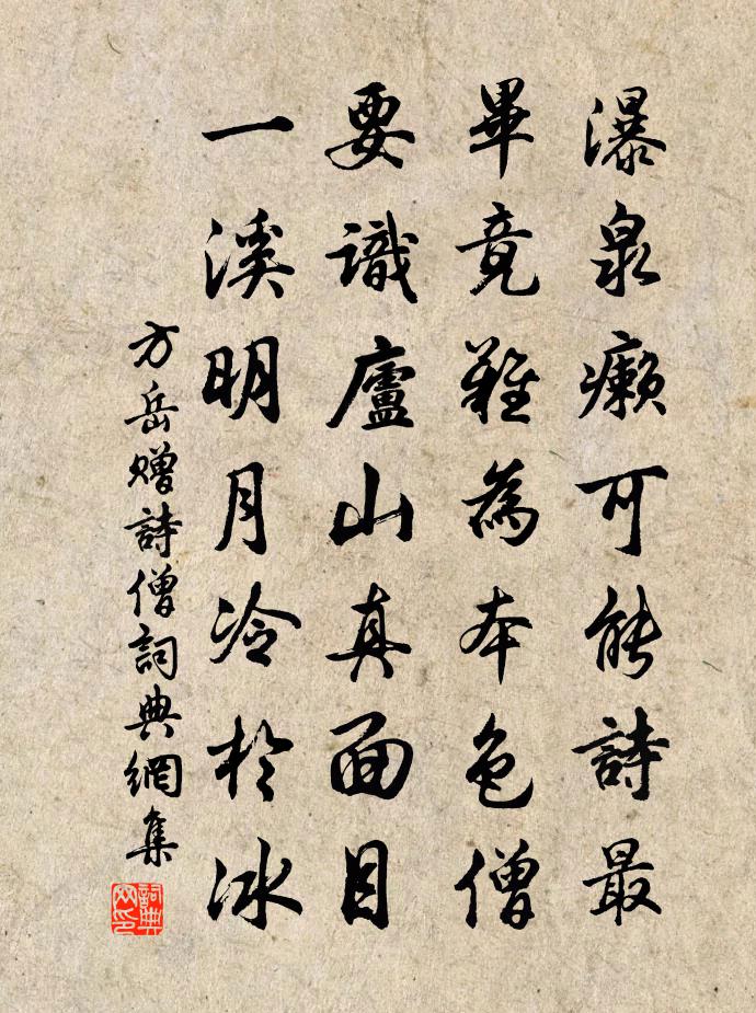 詩詞名句歷史字典書法欣賞書法字典國語詞典說文解字康熙字典古漢語字典標 題 作 者 詩 句 贈詩僧作者:方岳 朝代:宋代贈詩僧原文瀑泉癩可能詩最,畢竟難為本色僧。要識廬山真面目,一溪明月冷於冰。詩詞問答問:贈詩僧的作者是誰?答:方岳問:贈詩僧寫於哪個朝代?答:宋代方岳贈詩僧書法欣賞贈詩僧書法作品詩詞推薦梧桐樹牧常晁〔元代〕學道人,知端的。要須認取元初一。休外尋覓。初因一*成形質。配合陰陽生萬物。此身實自玄元出。冬夜宴蕭十丈因餞殷郭二子西上息夫牧〔唐代〕有琴斯鳴,於宰之庭。君子蒞止,其心孔平。政既告成,德以永貞。鳴琴有衎,於潁之畔。彼之才髦,其年未冠。中岩十八詠望江亭晁公溯〔宋代〕偶來俯滄波,遙見生白苹。望望不得上,笑彼涉江人。和如晦二首陳襄〔宋代〕一別瀛山歲未朝,三州聲稱已齊飛。欲將吏事文經術,獨鞏迂儒取世識。滿庭芳周必大〔宋代〕天壤茫茫,人心殊觀,未免因欠思餘。太山邱垤,同載一方輿。那更長沙下濕,祝融峰、才比吾廬。秋風冷,攀緣石帆夏日陸游〔宋代〕短棹飄然信所之,茶園漁市到無時。風從苹末蕭蕭起,月過花陰故故遲。蓴菜煮羹吳舊俗,竹枝度曲楚遺辭。頗聞黃風子贊白玉蟾〔宋代〕先生不狂是詩狂,先生不顛是酒顛。顛顛狂狂人不識,歸去青城今幾年。曾將詩酒瞞人眼,不是酒仙與詩仙,只是旱雨釋文珦〔宋代〕驟雨幡然下,風雷駕疾威。烏妝巢穴墮,龍挾水雲飛。物象回生意,神功解旱圍。田間喜相語,點點勝珠璣。三鴉鎮題壁佚名〔宋代〕二年憔悴三鴉,無米無錢怎養家。每日兩養唯是藕,看看口裹是出蓮花。大劍山慕容佰才〔宋代〕李勢非嵎虎,公孫是井蛙。聖朝無外戶,夷壤盡為家。疊嶂寧須鏟,停鼖久廢撾。原鱗生駱谷,釣駟入彭衙。關失仙岩即事沈躬行〔宋代〕孟月攝提指,春遊初服成。招尋追舊跡,涉歷憩孤情。暫爾諧心賞,相從念友聲。丹房探不遠,吾欲悟無生。浪淘沙慢陳允平〔宋代〕暮煙愁,鴉歸古樹,雁過空堞。南浦牙檣漸發。陽關歌盡半闋。便恨入迴腸千萬結。長亭柳、寸寸攀折。望日下長春日幽居示仲固彥沖十絕胡寅〔宋代〕碧沙承水漾嬌春,弱柳縈煙作淺顰。正好追尋沂上侶,未須攀贈灞橋人。題禪居廢寺劉商〔唐代〕凋殘精舍在,連步訪緇衣。古殿門空掩,楊花雪亂飛。鶴巢松影薄,僧少磬聲稀。青眼能留客,疏鍾逼夜歸。約心白居易〔唐代〕黑鬢絲雪侵,青袍塵土涴。兀兀復騰騰,江城一上佐。朝就高齋上,薰然負暄臥。晚下小池前,澹然臨水坐。已約風入松 泊舟好溪,盧希顏相留,寓陳碧山丹張可久〔元代〕好風吹皺玉龍鱗。飛雪點吟身。南明古色供詩眼,纜扁舟、鷗鷺相親。邂逅希顏公子,留連訪戴山人。環中天地一棲霞寺趙伯晟〔宋代〕棲霞境界何清壯,岳立五峰如列障。三徵不復見高人,千刻尚能瞻寶相。摩空老木韻秋聲,雲屋天岩滿意行。夜闌巳未春日山居雜興十二解楊萬里〔宋代〕春寒偏勒牡丹遲,晚似常年半月期。上巳清明同一日,那時恰好放花枝。芰荷香(金陵)朱敦儒〔宋代〕遠尋花。正風亭霽雨,煙浦移沙。緩提金勒,路擁桃葉香車。憑高帳飲,照羽觴、晚日橫斜。六朝浪語繁華。山圍中丞宋公以吳兵三千赴河南軍次尋陽…囚參謀幕府因贈之李白〔唐代〕獨坐清天下,專征出海隅。九江皆渡虎,三郡盡還珠。組練明秋浦,樓船入郢都。風高初選將,月滿欲平胡。殺氣名句推薦最是繁絲搖落後,轉教人憶春山。納蘭性德《臨江仙·寒柳》 言而當、知也;默而當,亦知也荀子《荀子·非十二子》 離情被橫笛,吹過亂山東。王安石《江上》 社下燒錢鼓似雷,日斜扶得醉翁回。范成大《春日田園雜興》 當年萬里覓封侯。匹馬戍梁州。陸游《訴衷情·當年萬里覓封侯》 人似秋鴻來有信,事如春夢了無痕。蘇軾《正月二十日與潘郭二生出郊尋春忽記去年是日同至女王城作詩乃和前韻》 東風吹我過湖船。楊柳絲絲拂面。張孝祥《西江月·問訊湖邊春色》 人之易其言也,無責耳矣。孟子《孟子·離婁章句上·第二十二節》 向來冰雪凝嚴地,力斡春回竟是誰?陸游《落梅》 仍憐故鄉水,萬里送行舟。李白《渡荊門送別》